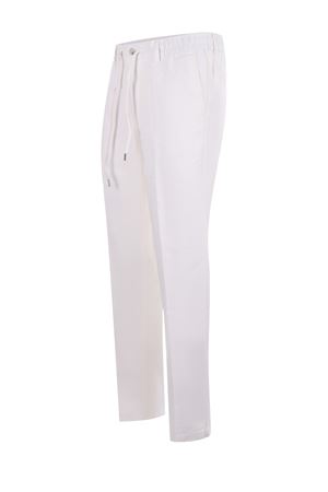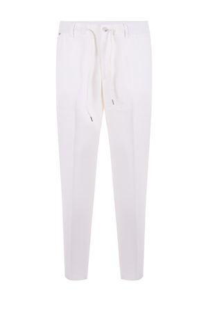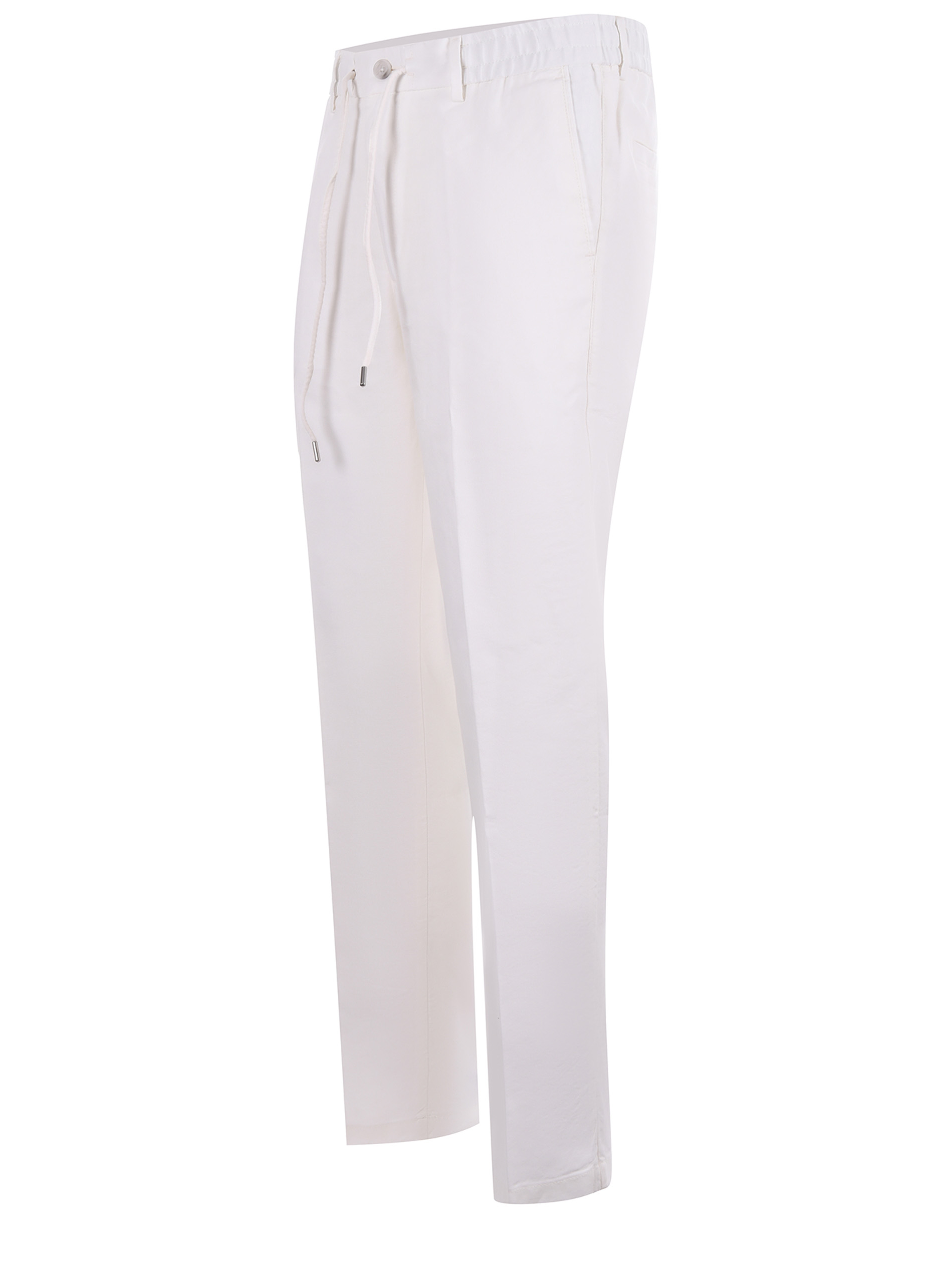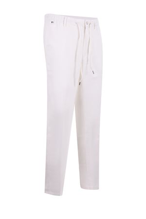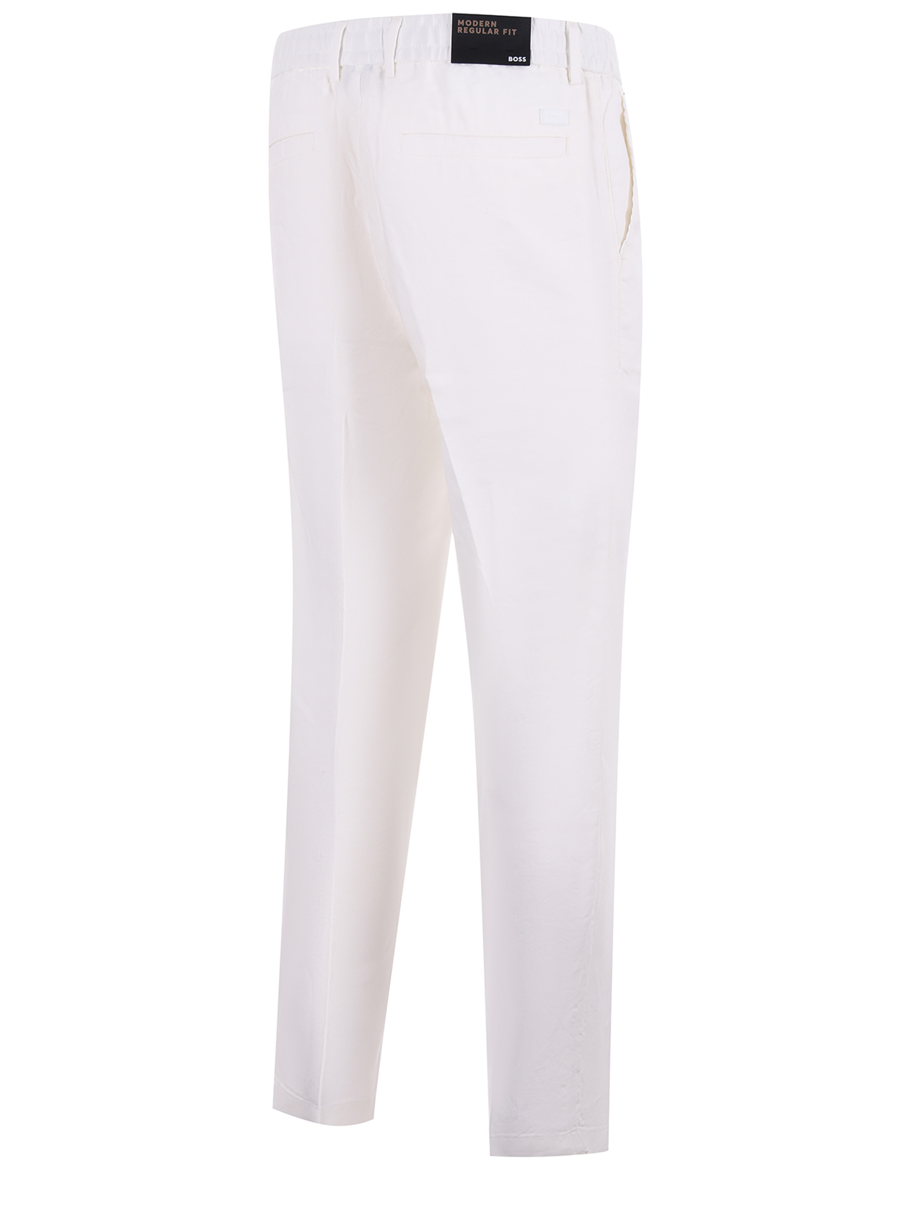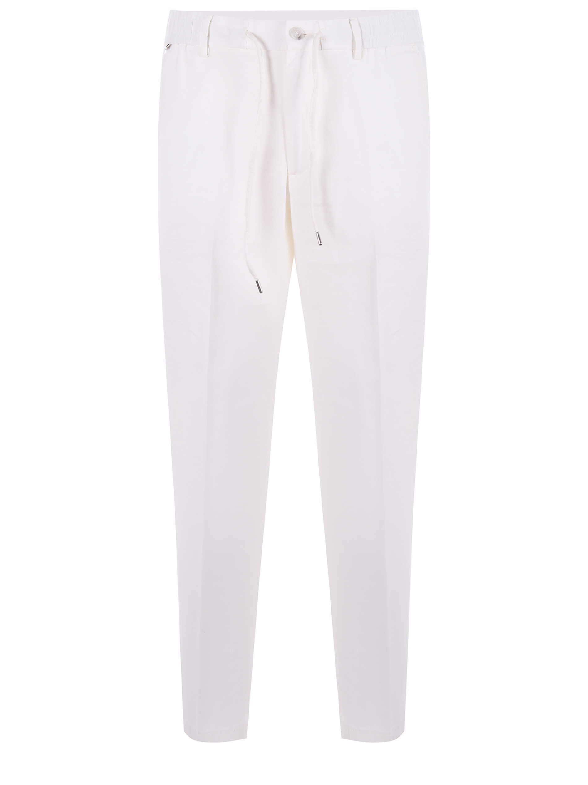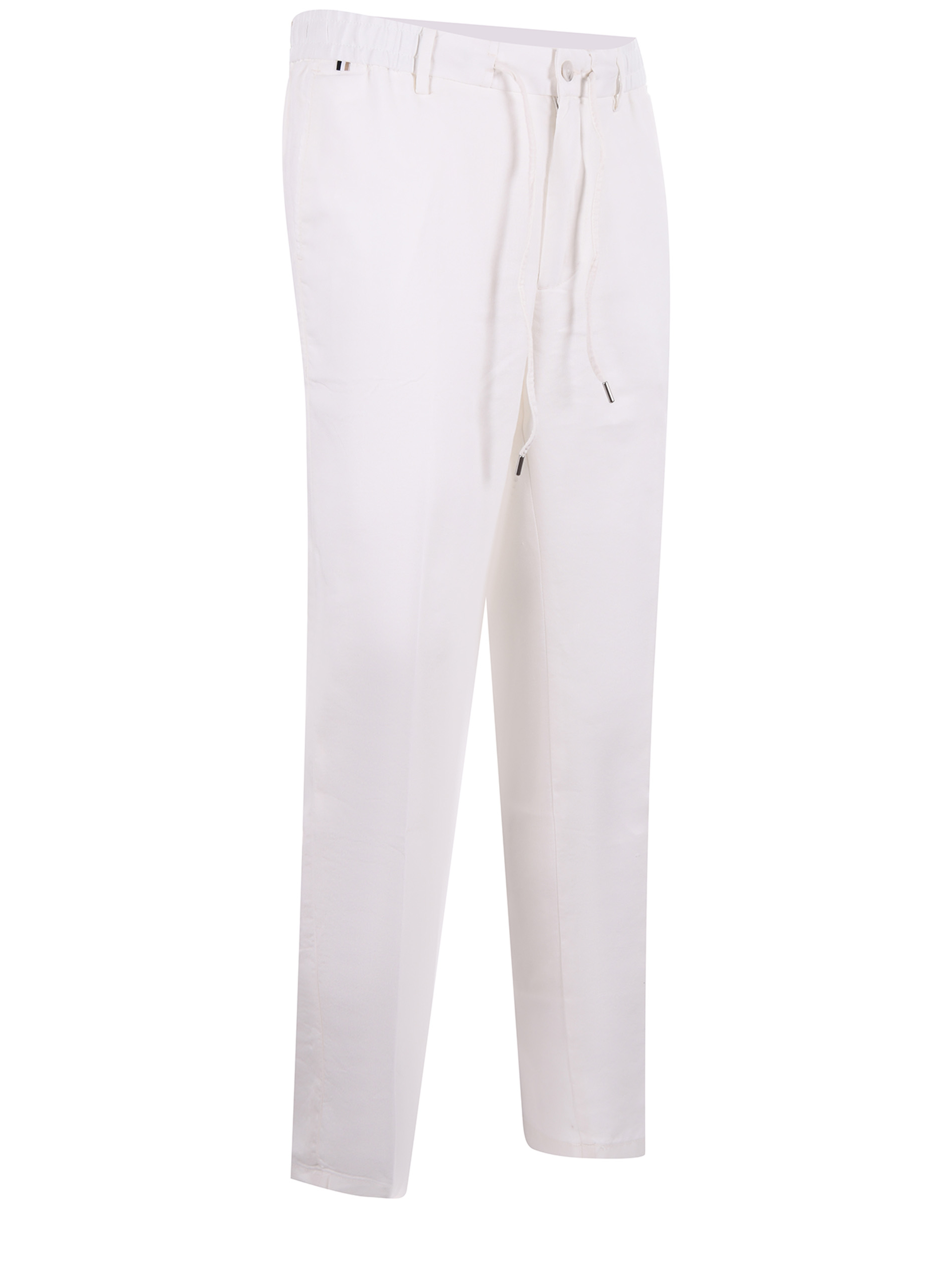 Pantaloni Boss in misto lino Bianco. Elastico in vita con coulisse. Tasche america. Tasche a filo sul retro. Chiusura con zip e bottone.