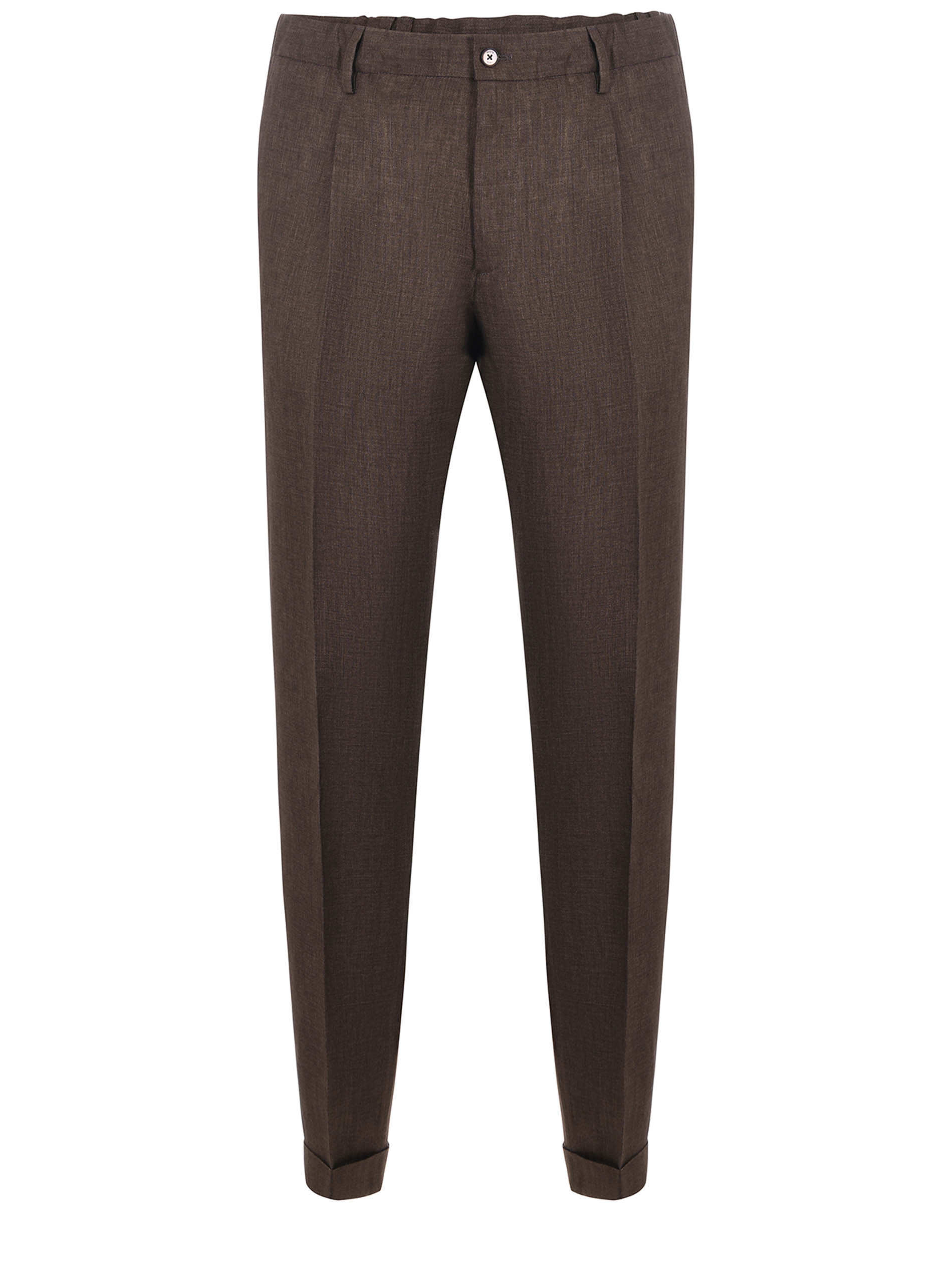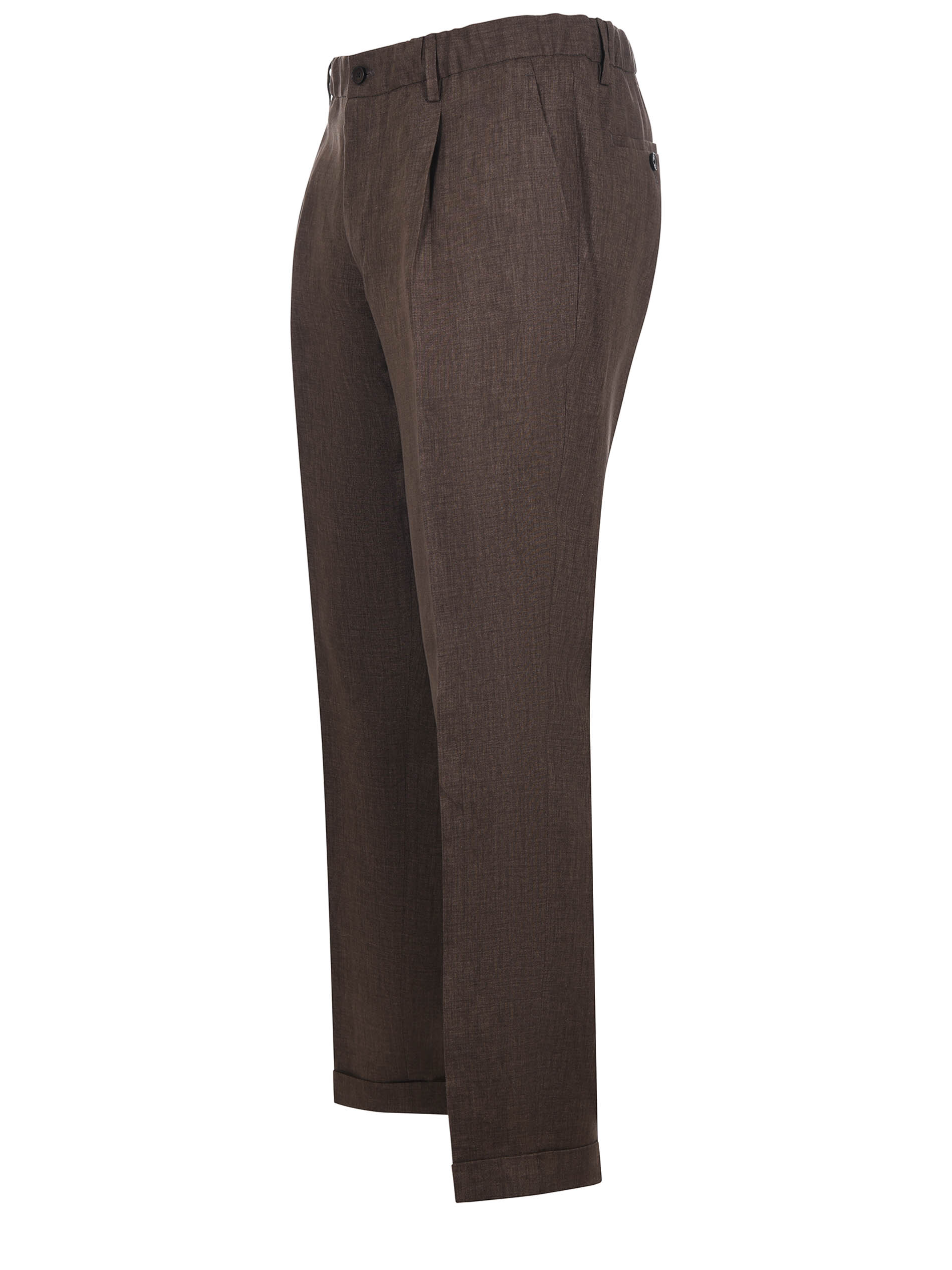 Pantaloni Briglia "Isola" in lino Marrone scuro. Elastico in vita. Coulisse interna. Passanti per cintura. Pinces frontali. Risvolto cucito al fondo. Tasche laterali. Chiusura con zip e bottone. Tasche a filo con bottone sul retro.