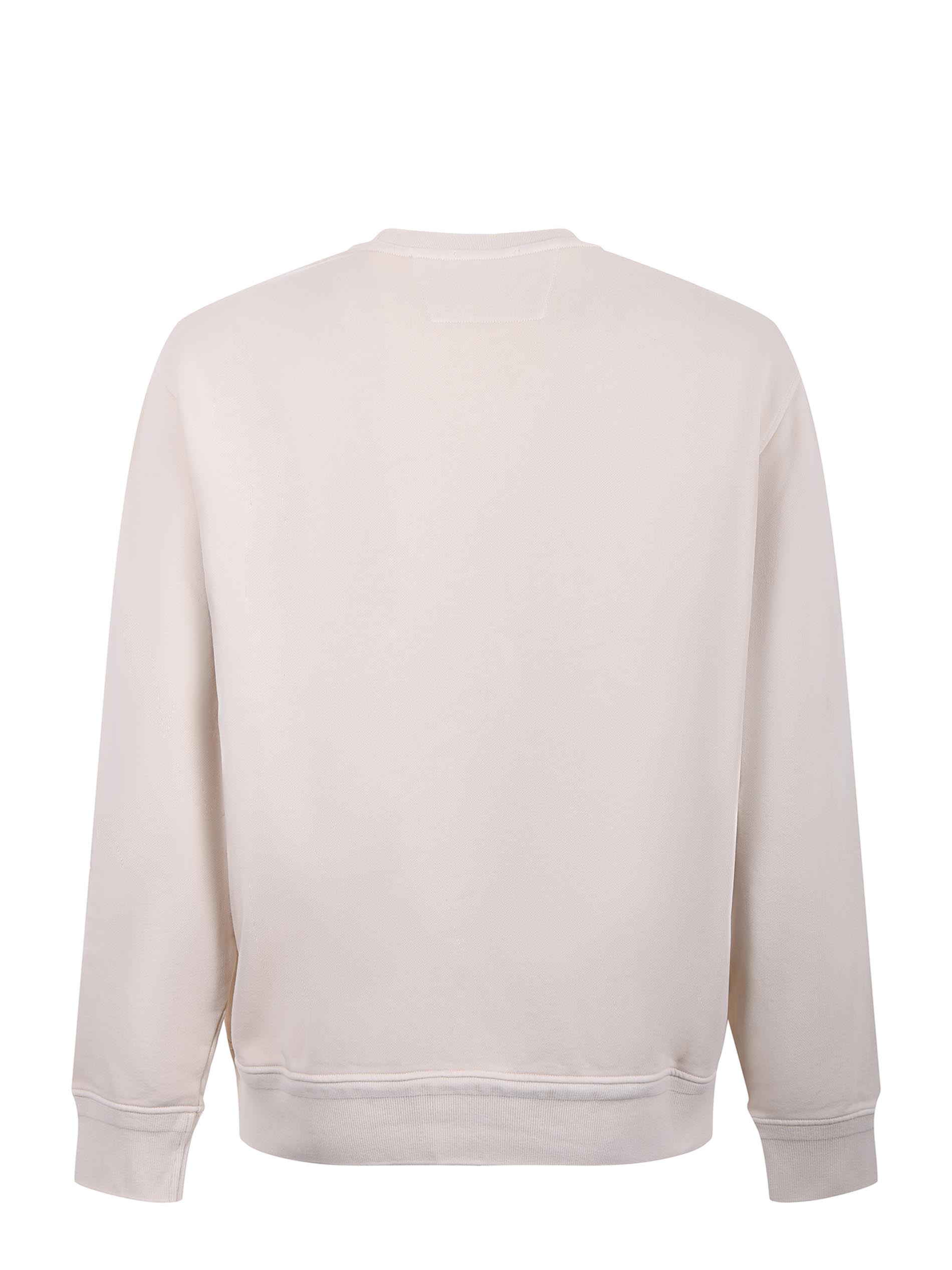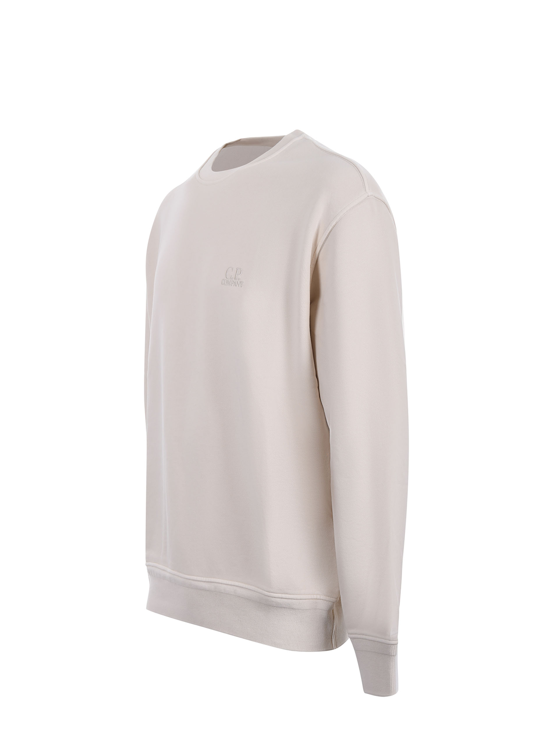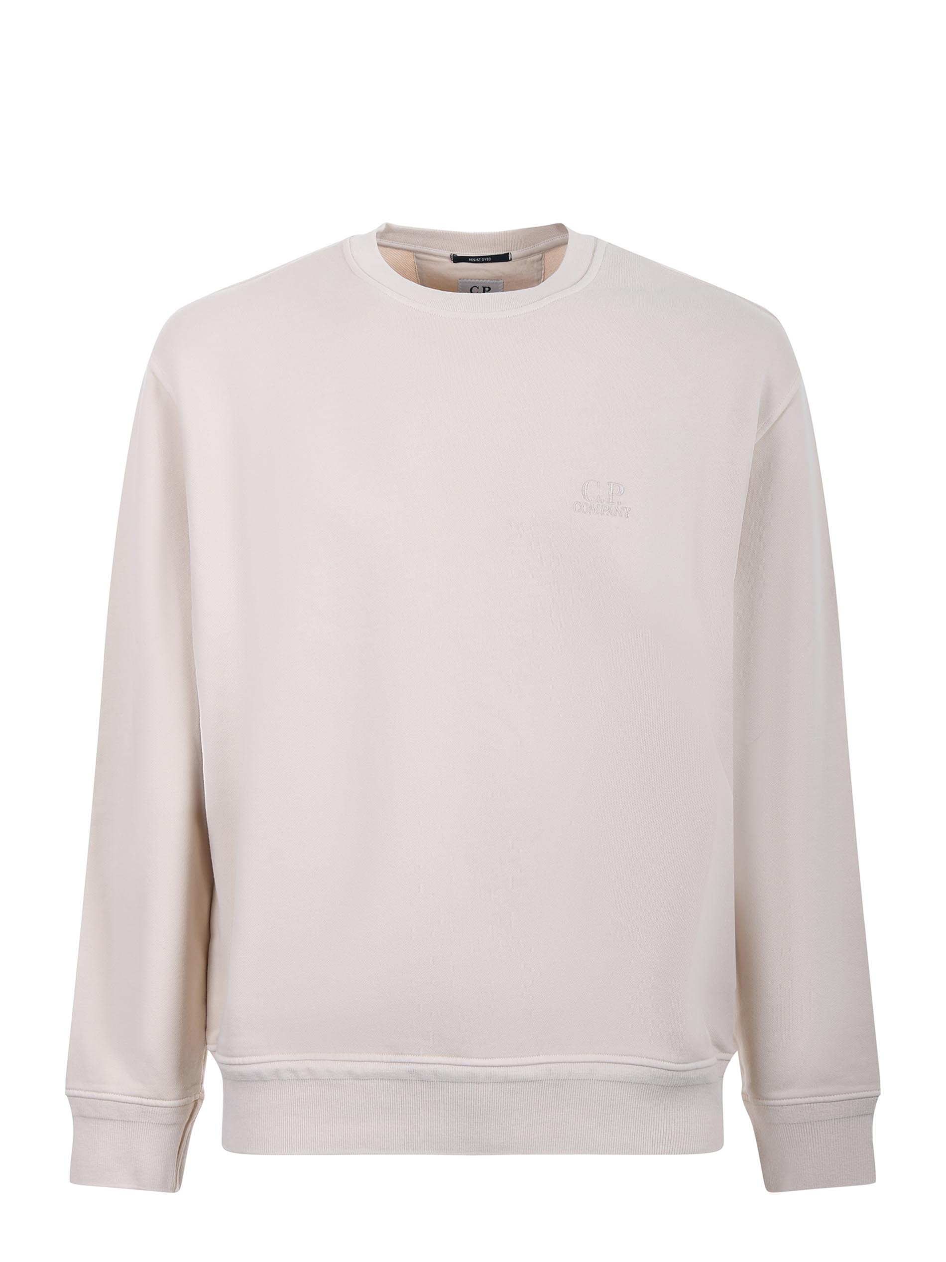 Felpa C.P. Company in cotone effetto stone wash Beige chiaro. Aree leggermente scolorite. Girocollo a costine. Manica lunga. Polsi e fondo a costine. Logo frontale ricamato in tono. Interno garzato.