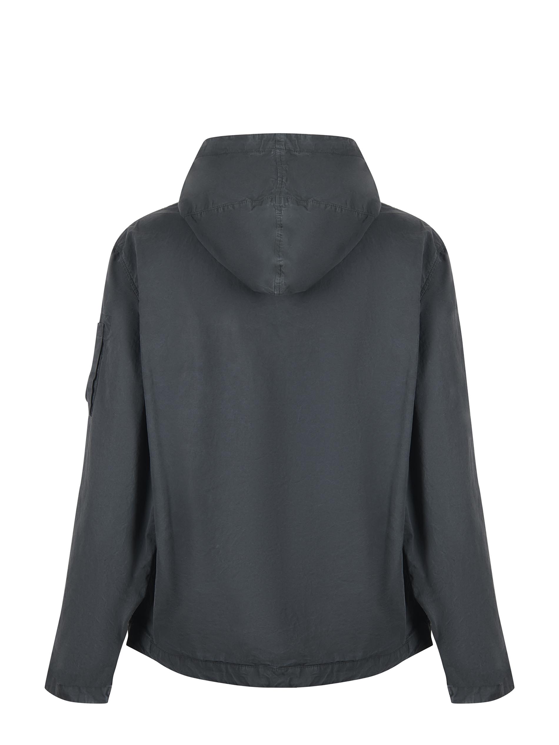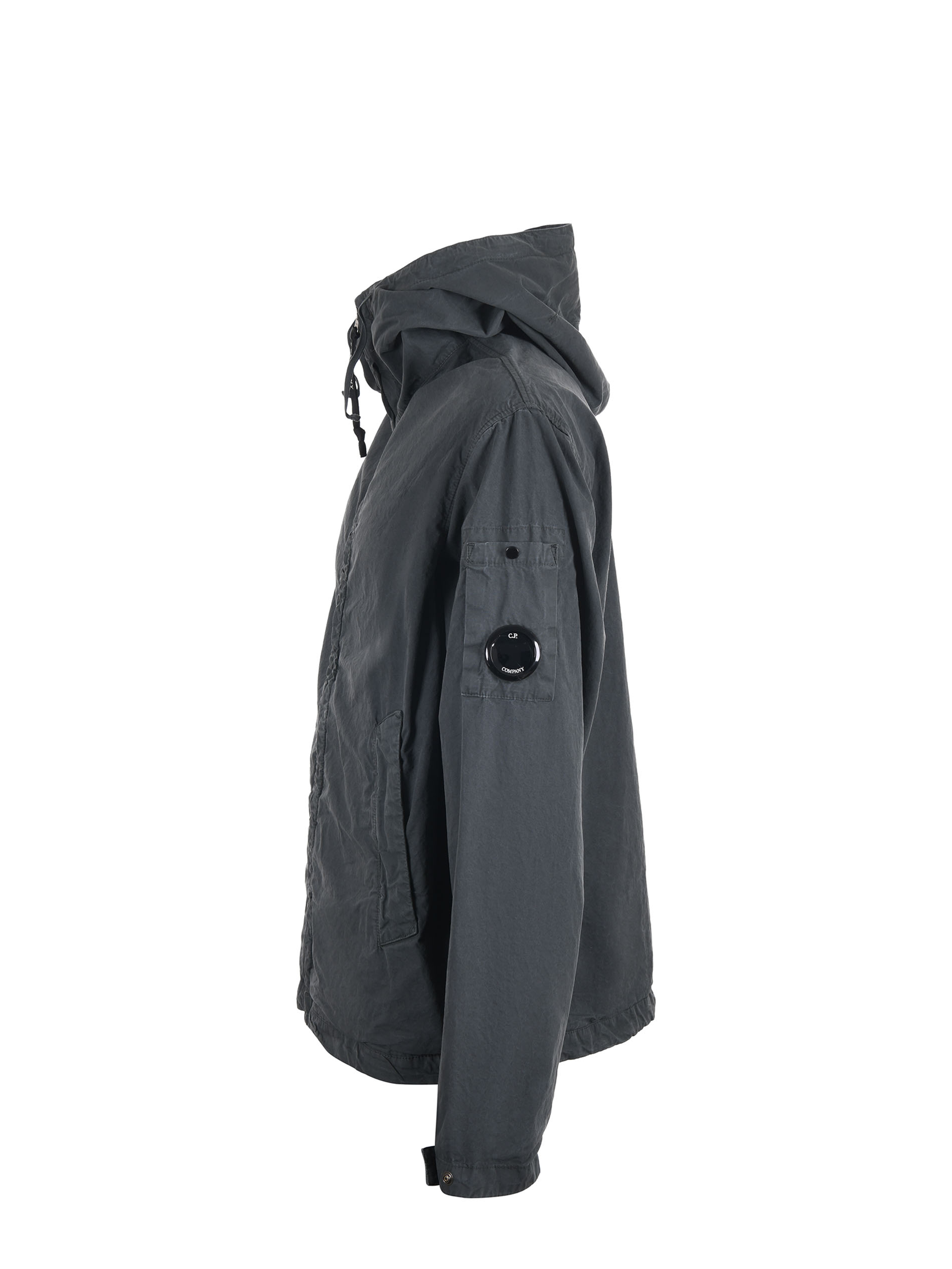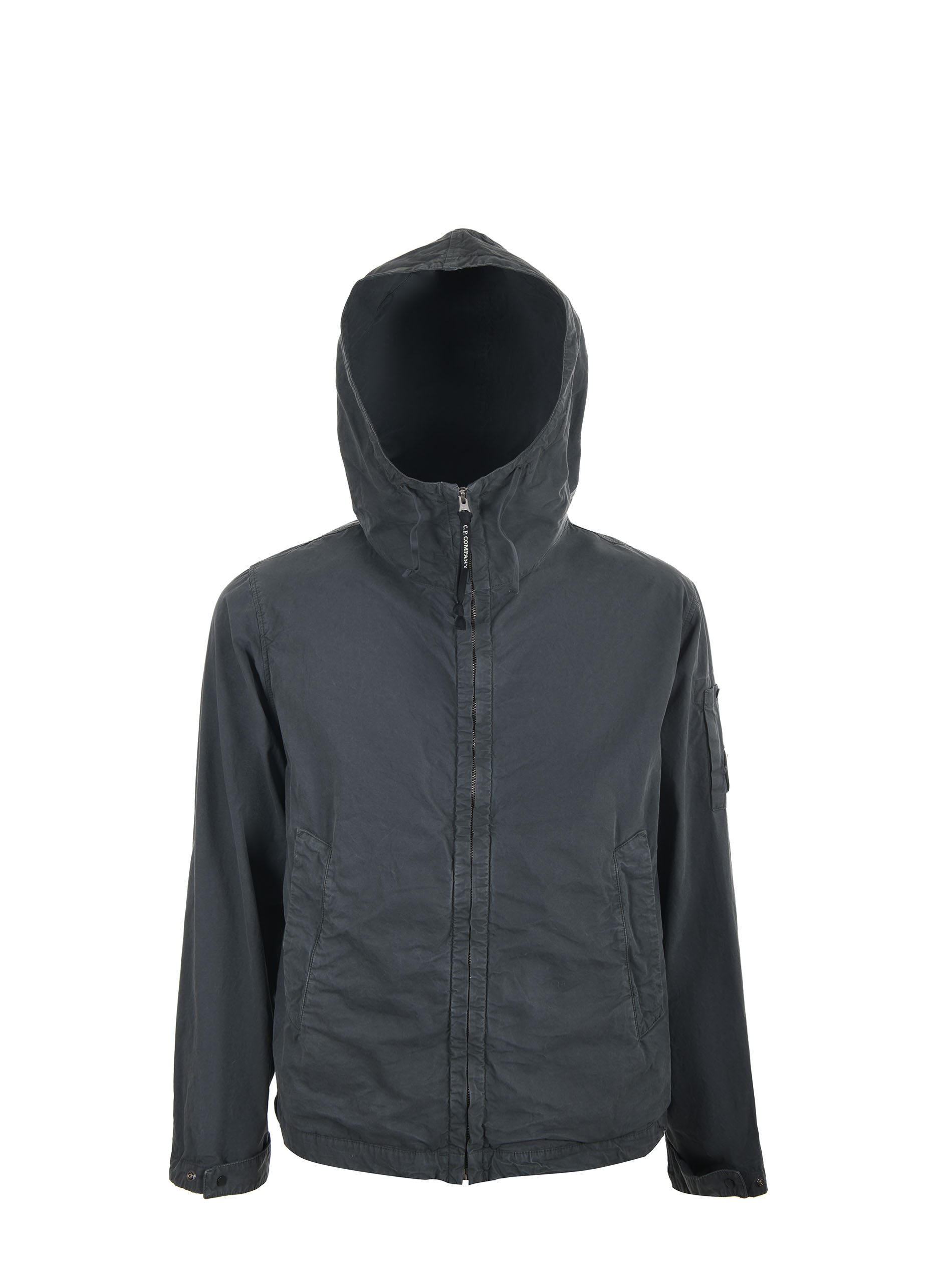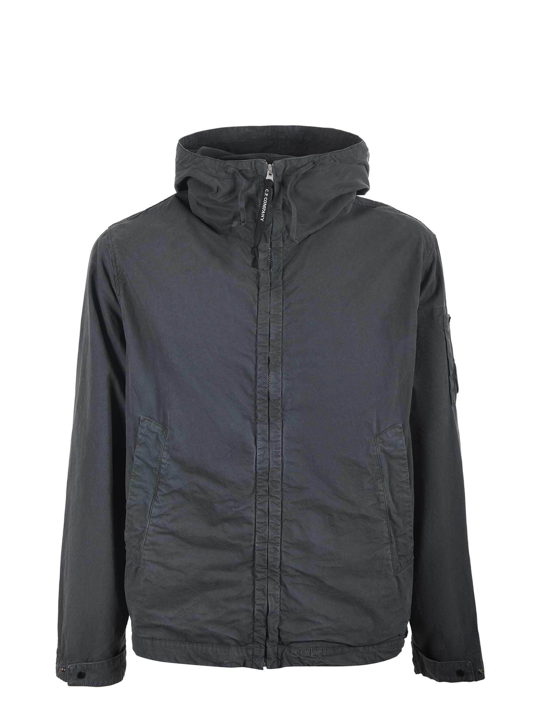 Giubbotto C.P. Company in tela di cotone Grigio scuro effetto stone wash. Aree volutamente scolorite e consumate. Cappuccio con coulisse. Tasche con bottone a pressione. Tasca sulla manica destra con goggle lent. Polsi regolabili. Coulisse al fondo. Chiusura con zip doppio cursore. Sfoderato.