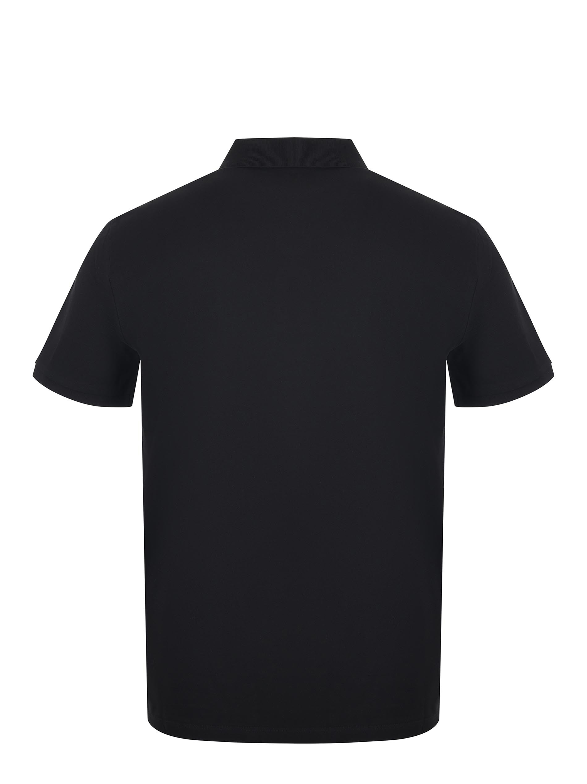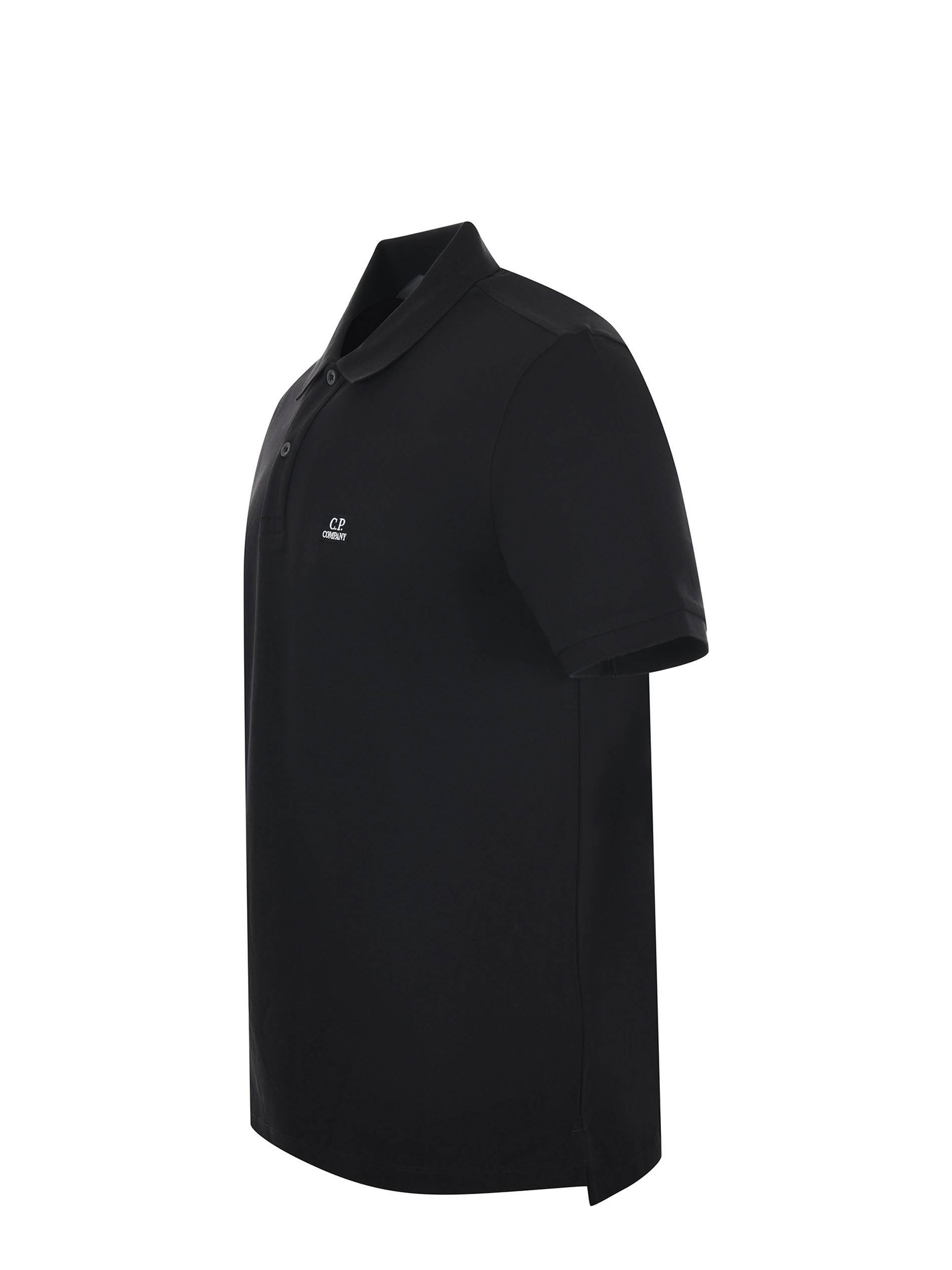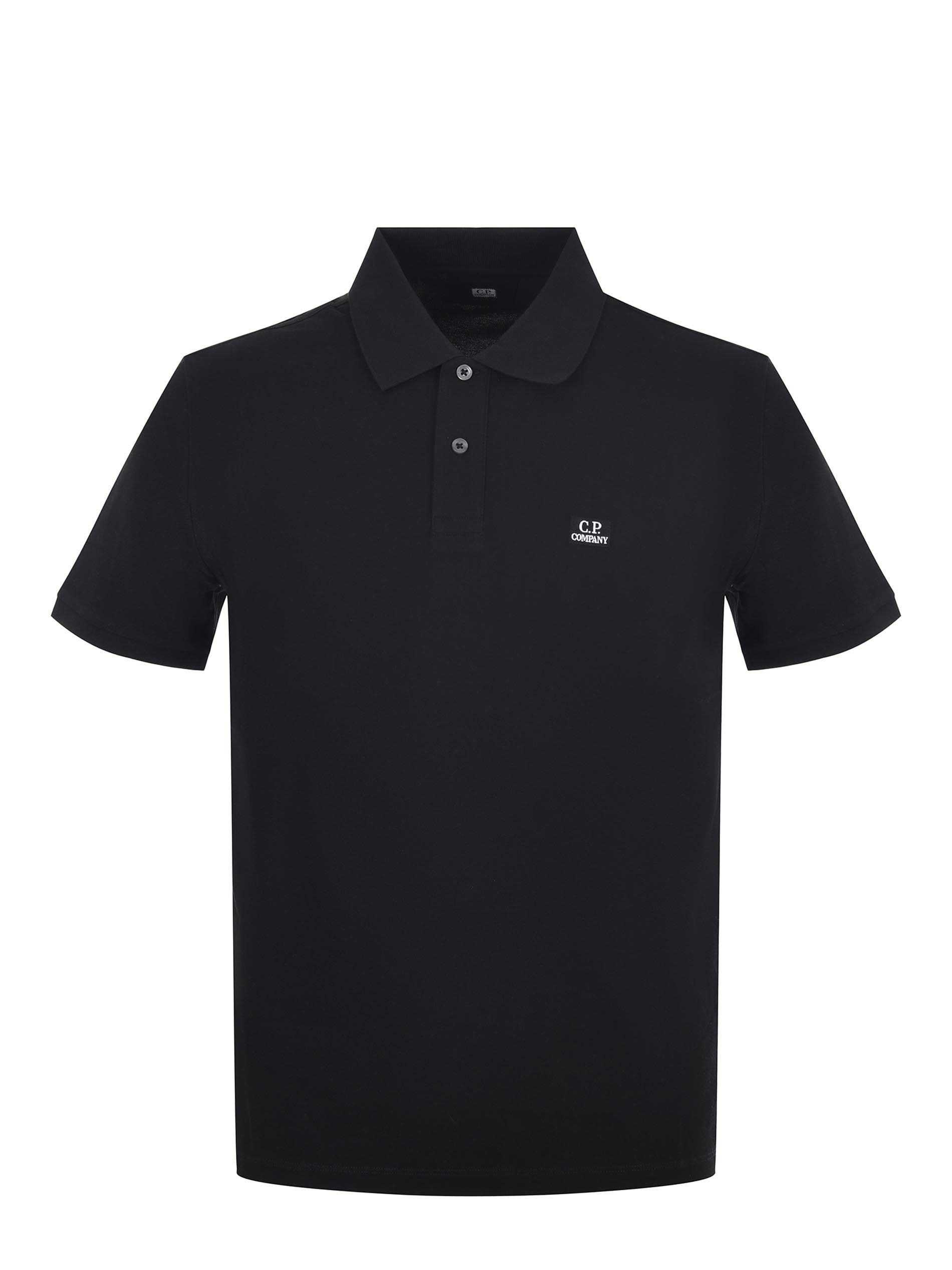 Polo C.P. Company in piqué di cotone Nero. Colletto a costine. Maniche corte. Chiusura con due bottoni. Lettering ricamato sul petto. Spacchetti ai lati. Slim fit.