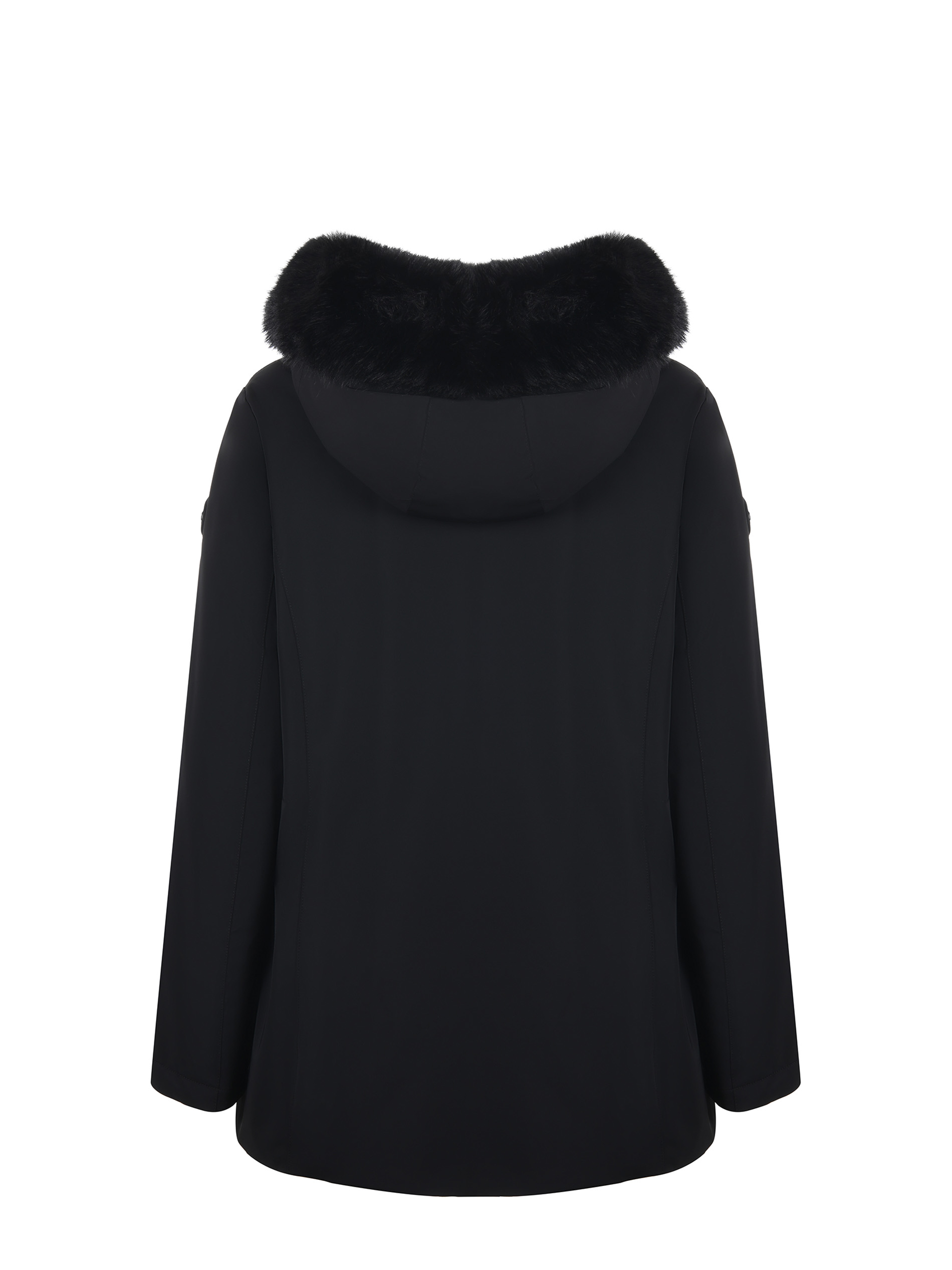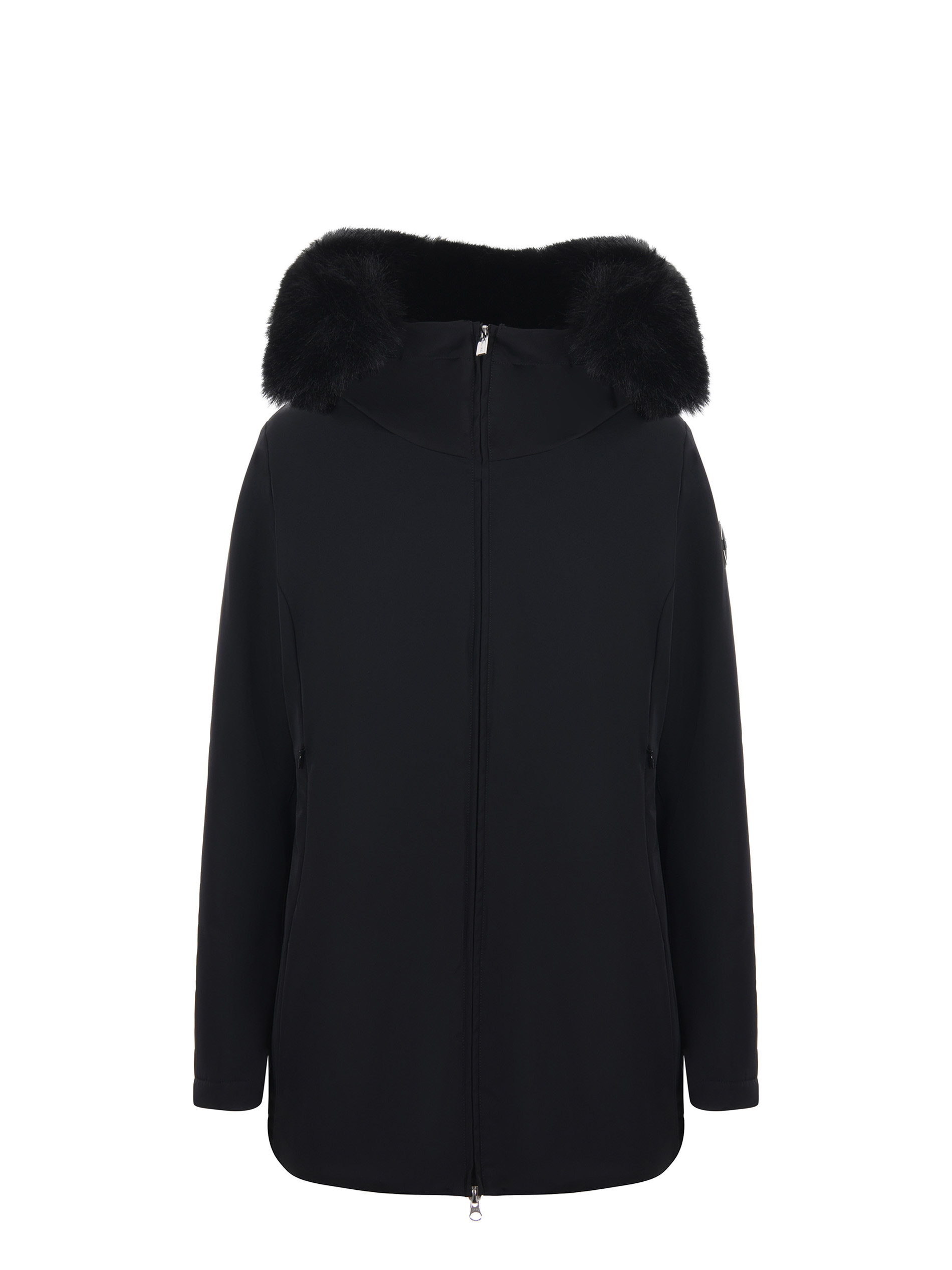 Piumino 3/4 Colmar Originals in nylon stretch Nero. Interno trapuntato. Imbottito in piuma d'oca. Cappuccio con bordo in vera pelliccia removibile. Chiusura con zip doppio cursore. Tasche con zip. Patch logo applicato sulla manica sinistra.