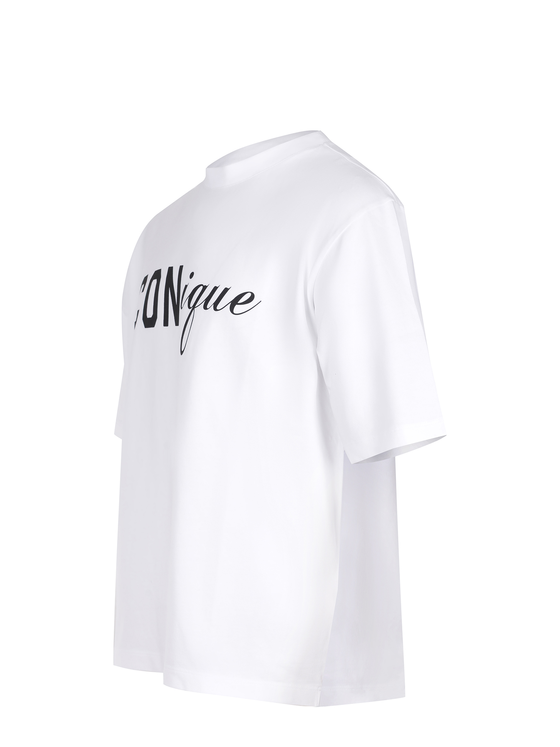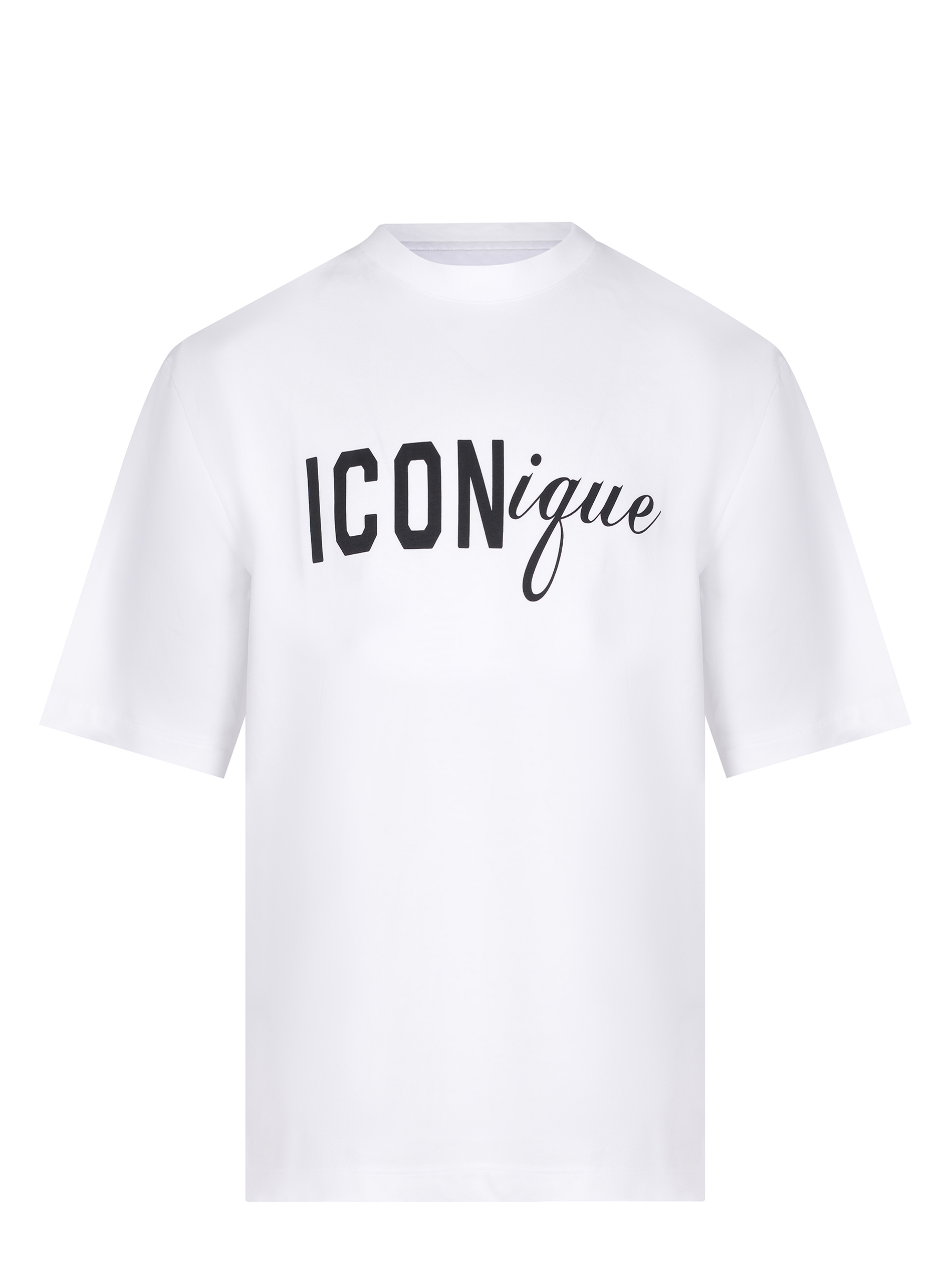 Scritta "ICONique" sul petto a contrasto.