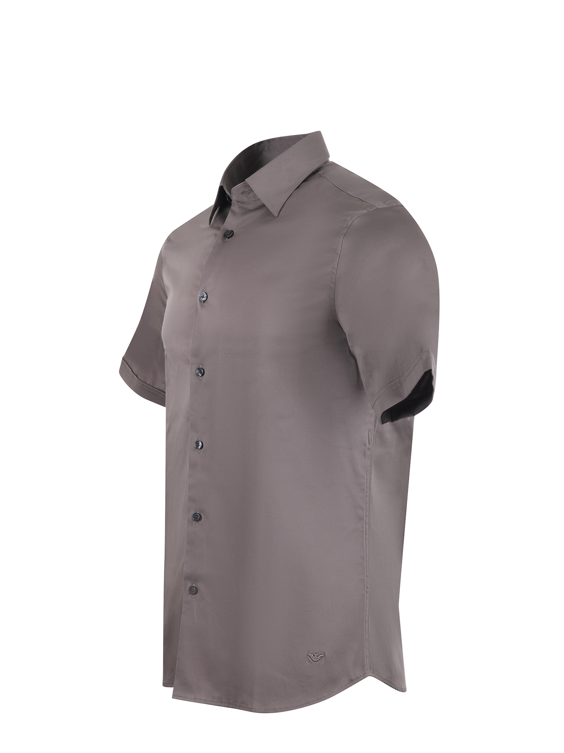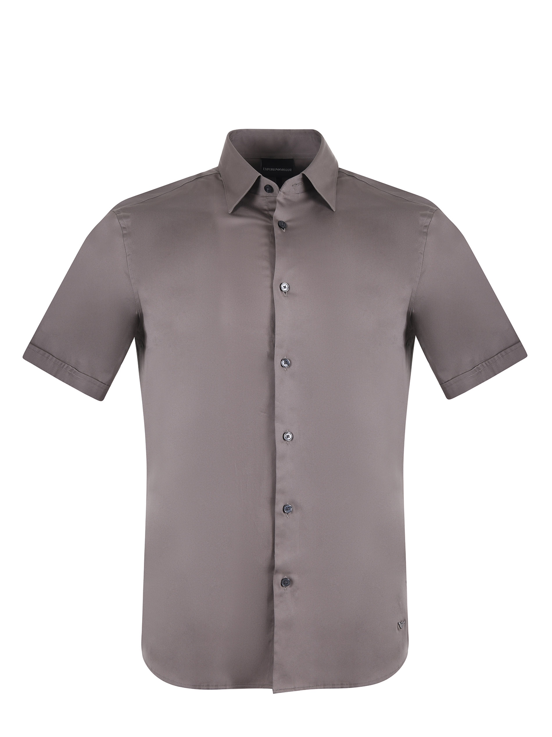 Camicia Emporio Armani in cotone rasato stretch Tortora. Colletto classico. Manica corta con risvolto. Logo ricamato sul fondo. Chiusura con bottoni. Slim fit.