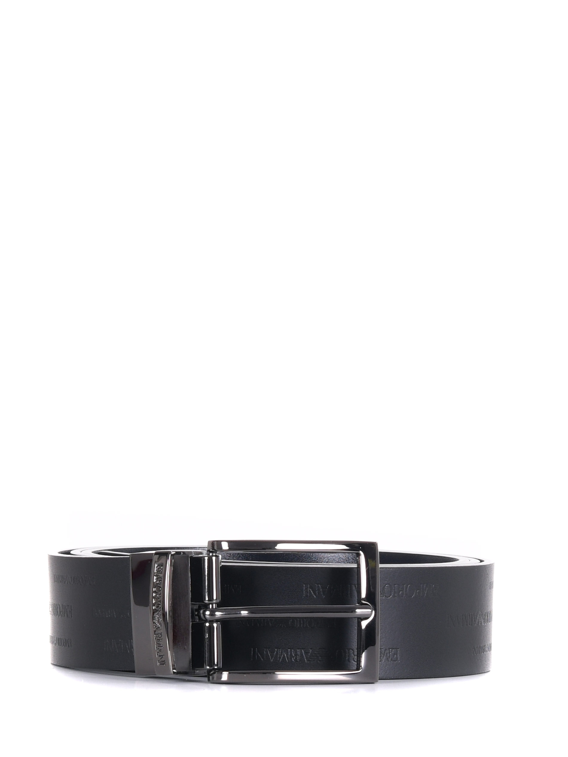 Cintura Emporio Armani reversibile in pelle Nera/Blu scuro. Lato nero con loghi impressi. Fibbia in metallo canna di fucile. Altezza 35 mm.
