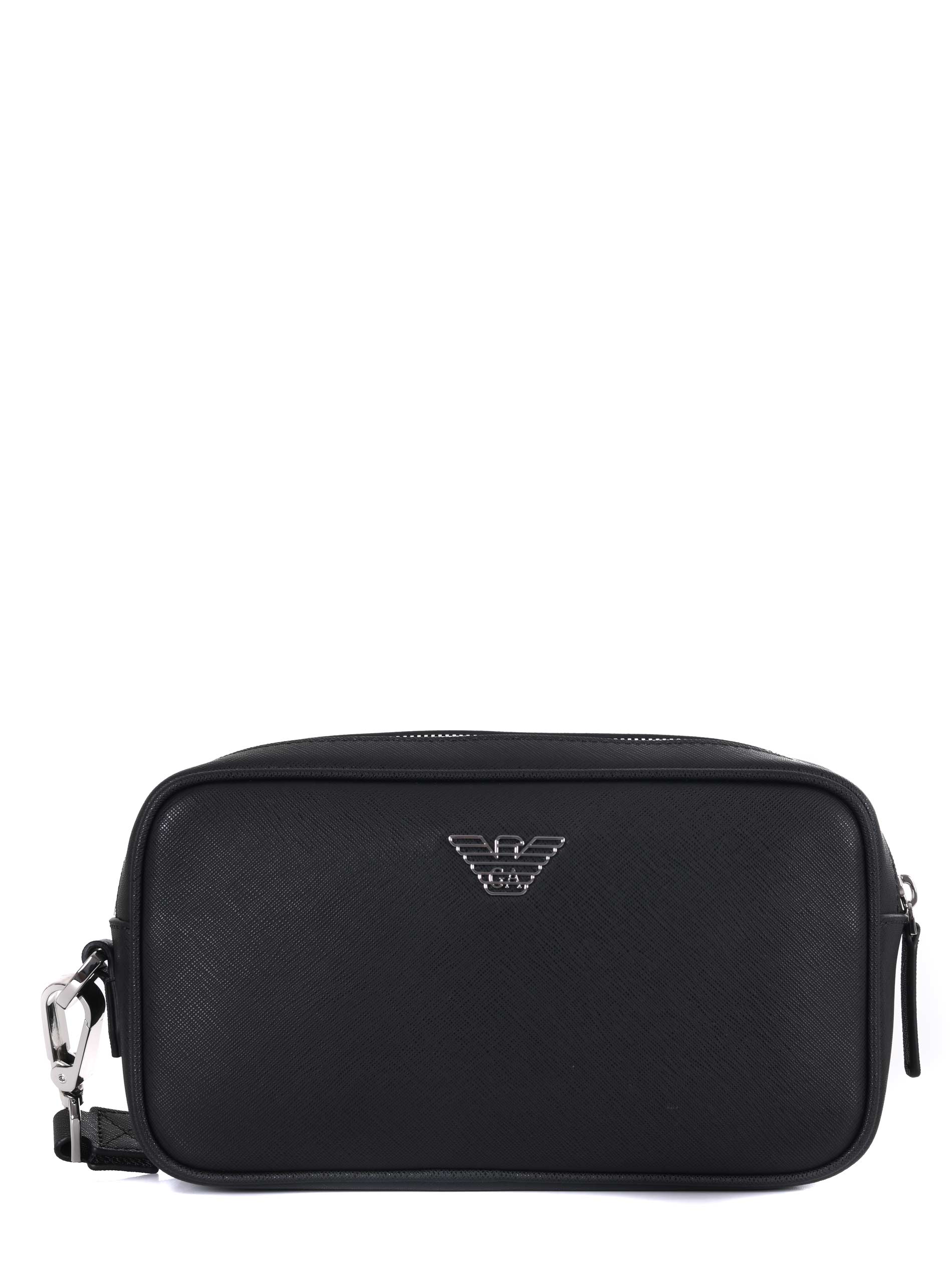 Pochette Emporio Armani in ecopelle stampa saffiano Nera. Manico in nylon removibile. Tasca sul retro con zip. Tasche interne. Chiusura con zip. Logo frontale.