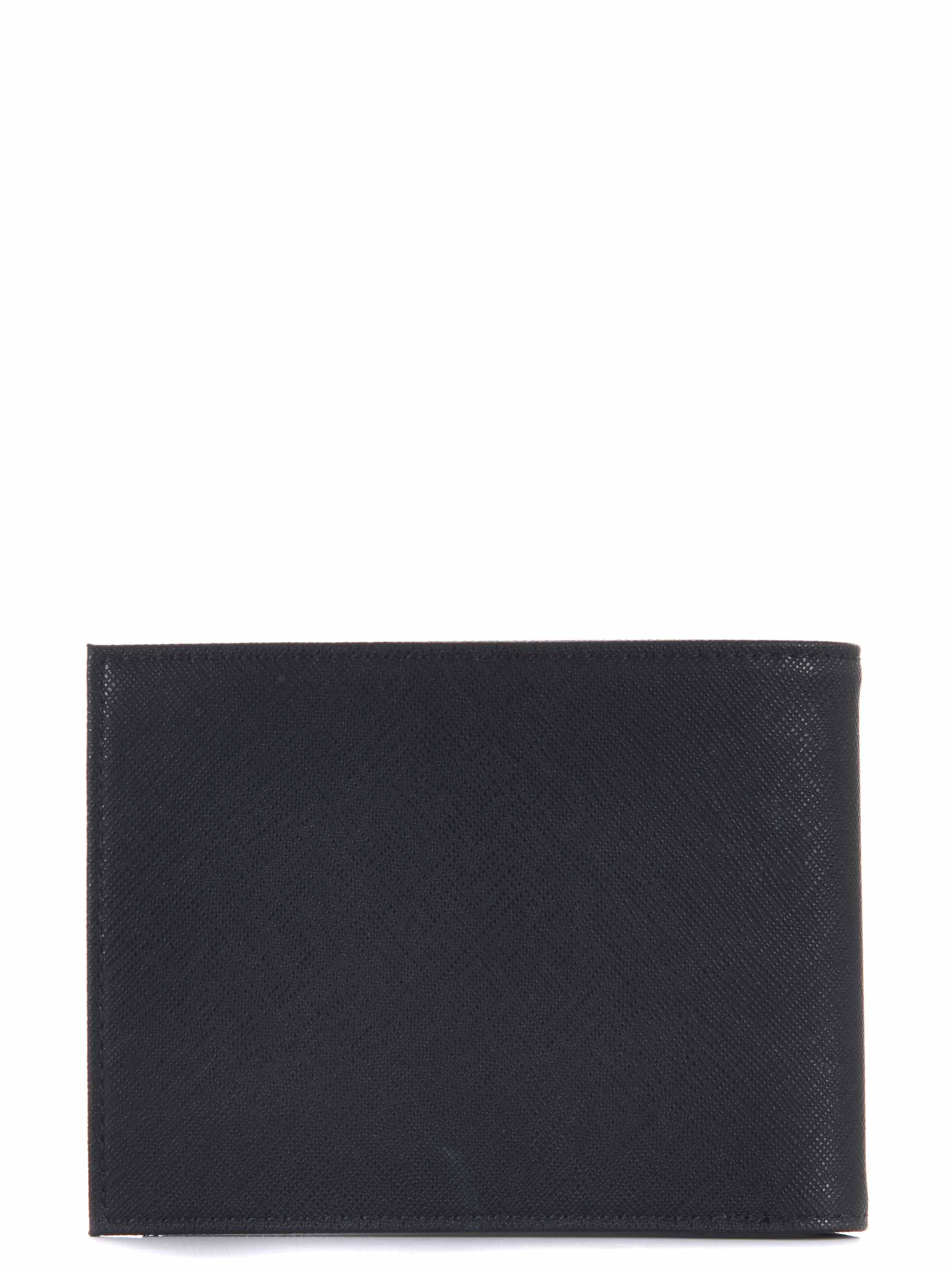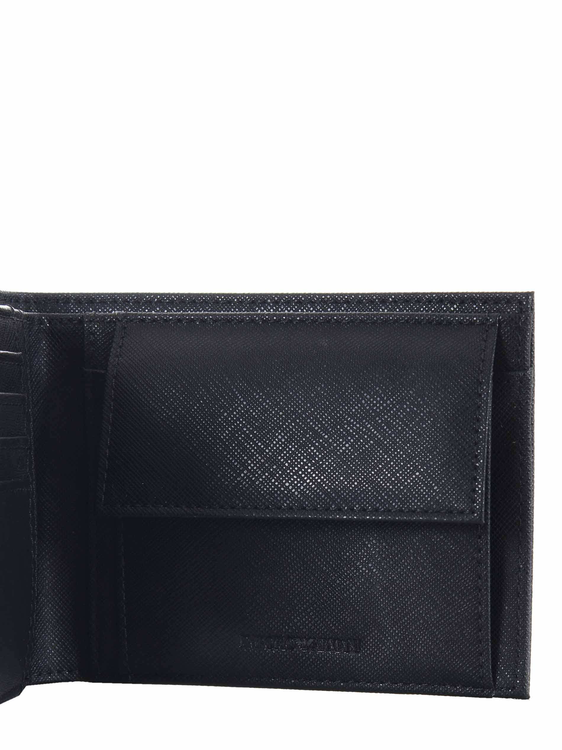 Portafoglio Emporio Armani in ecopelle motivo saffiano Nero. Logo eagle metallico applicato sul davanti. Interni foderati. Tasche porta tessere. Scomparto per le banconote e per monete.
