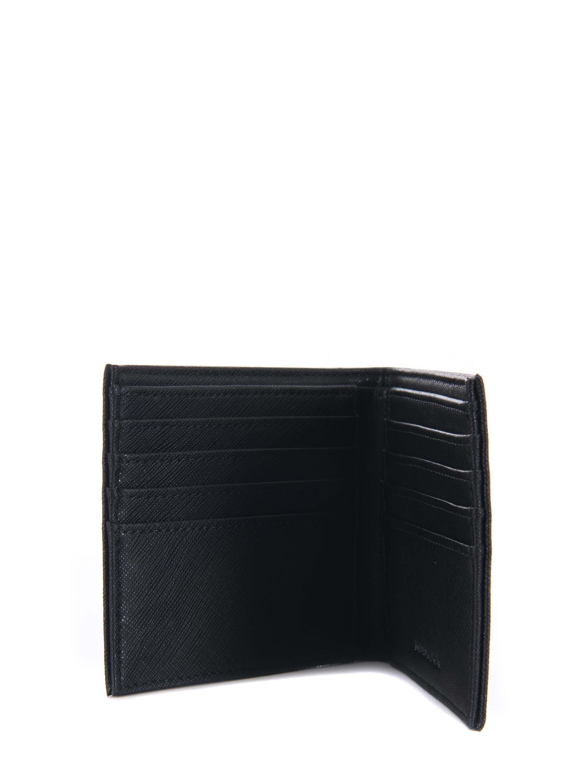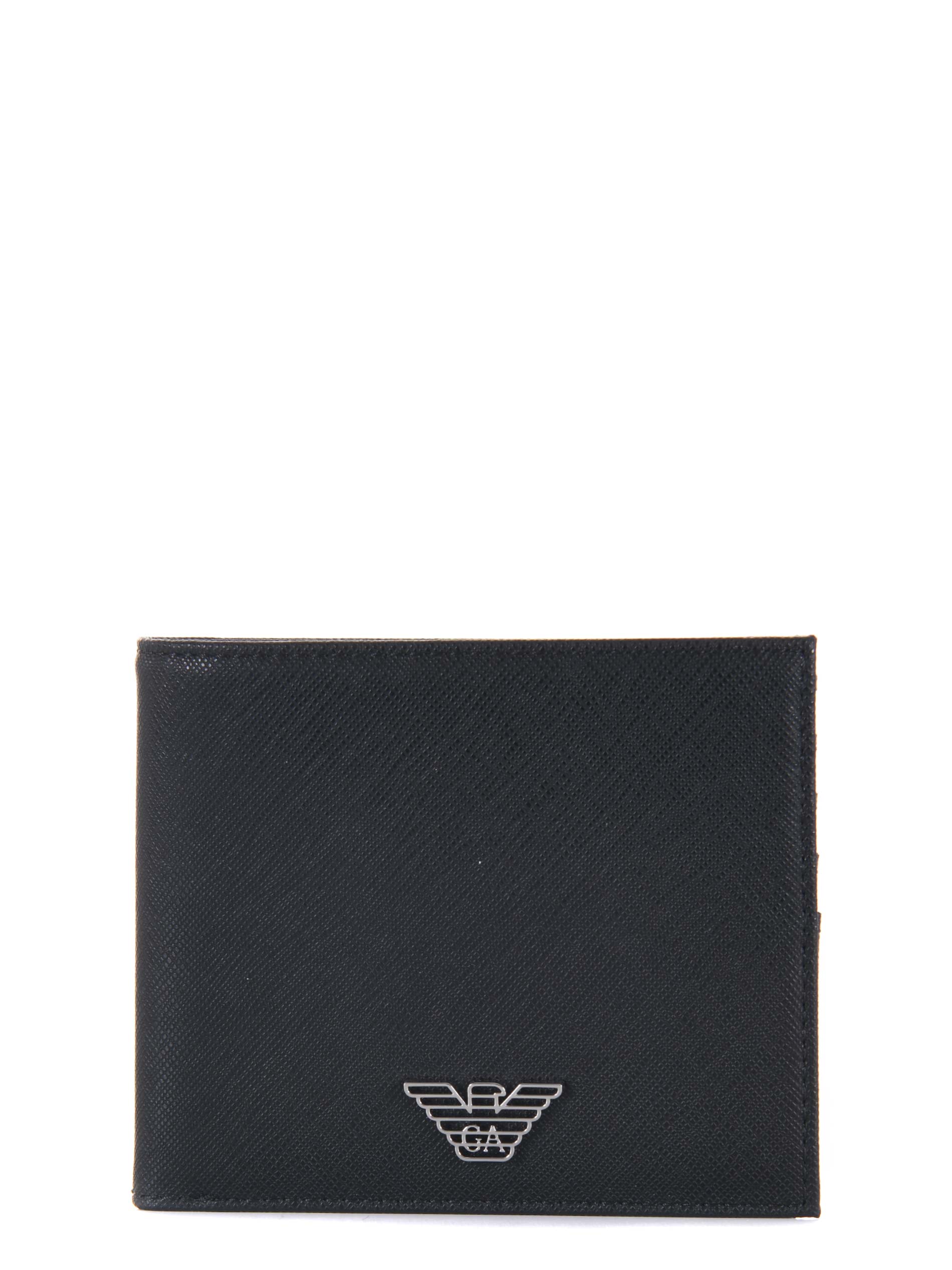 Portafoglio Emporio Armani in ecopelle motivo saffiano Nero. Logo aquila metallico applicato sul davanti. Interni foderati. Tasche porta tessere. Scomparto per le banconote.