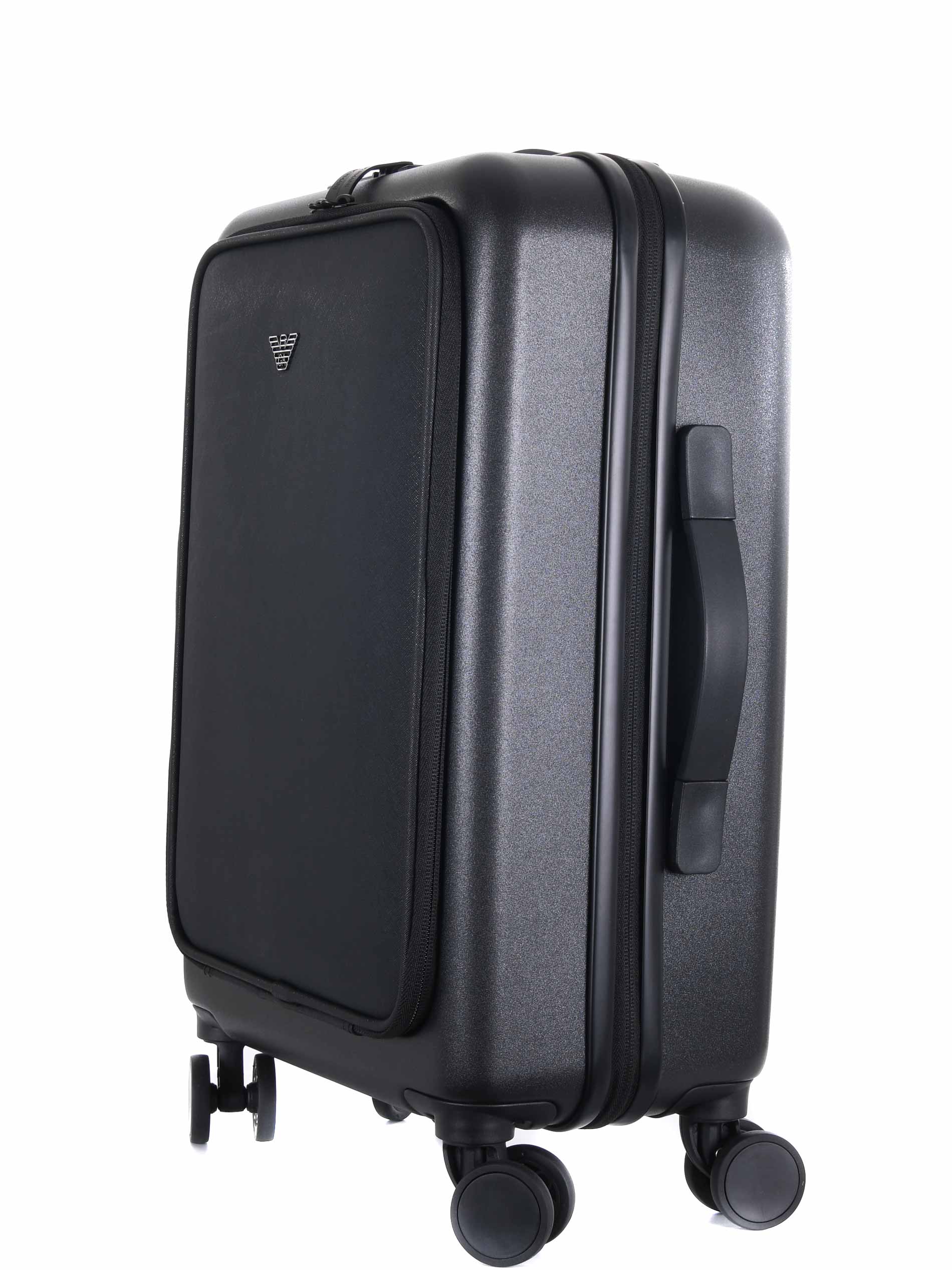 Trolley cabin Emporio Armani in materiale plastico ABS Nero. Tasca frontale in saffiano. Manico telescopico. Quattro ruote. All'interno scomparti vari con rete. Chiusura con zip e sistema di bloccaggio TSA. Logo frontale "eagle" a rilievo.