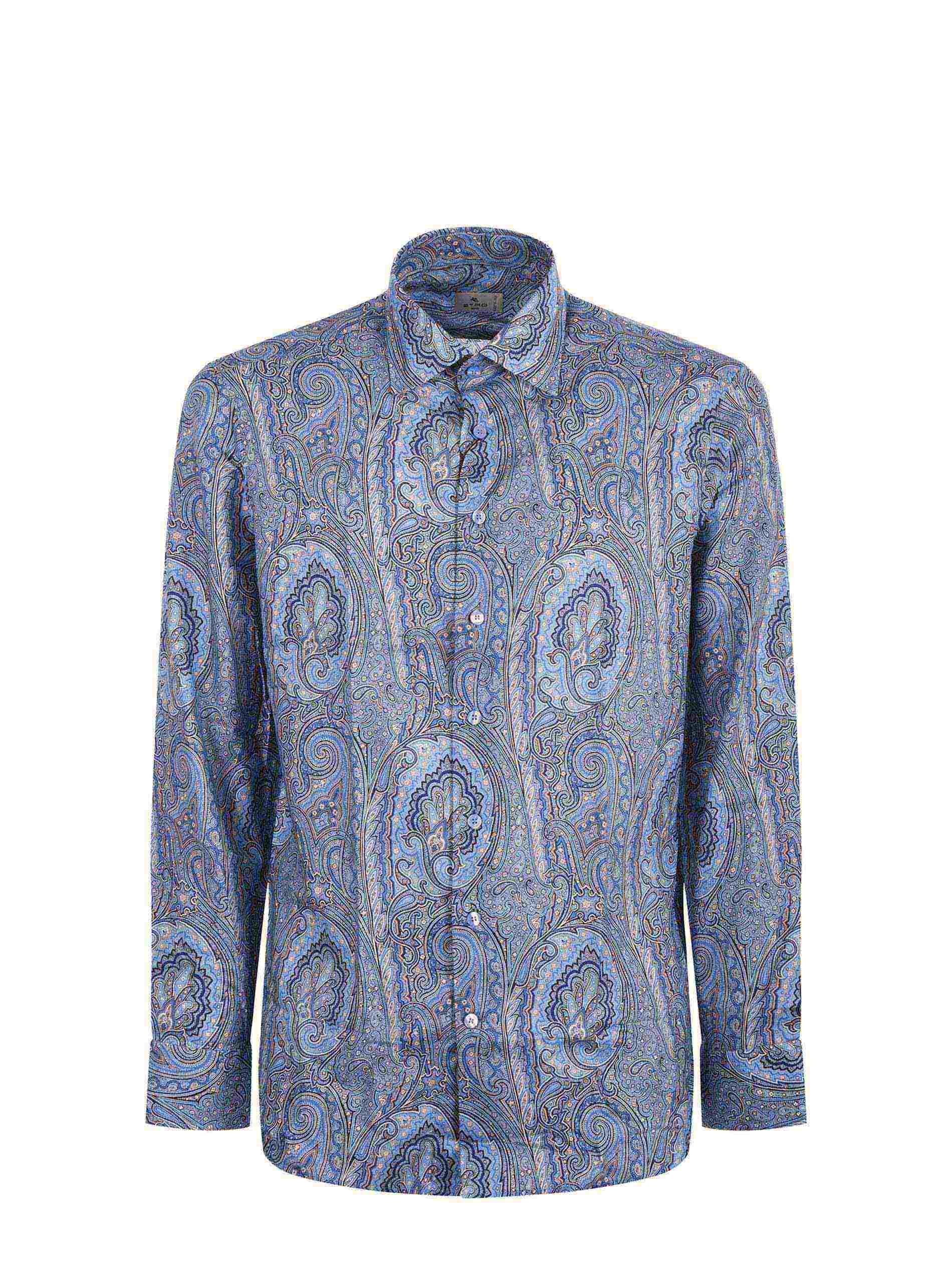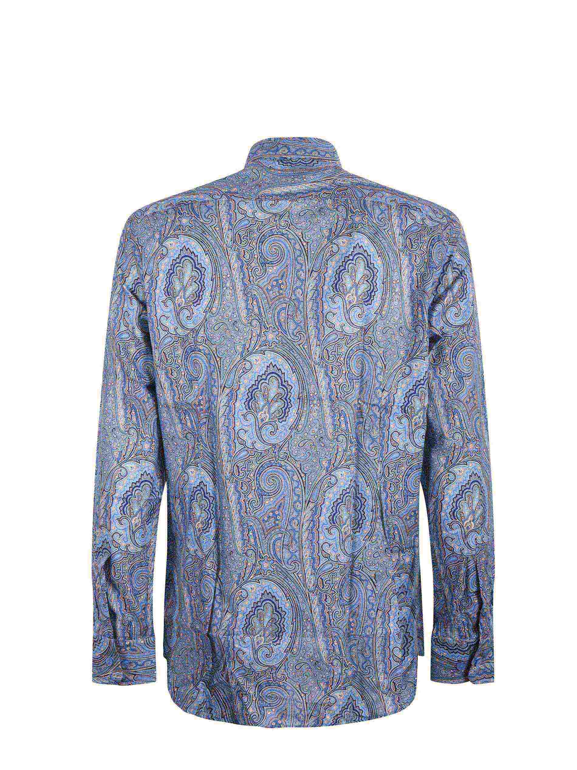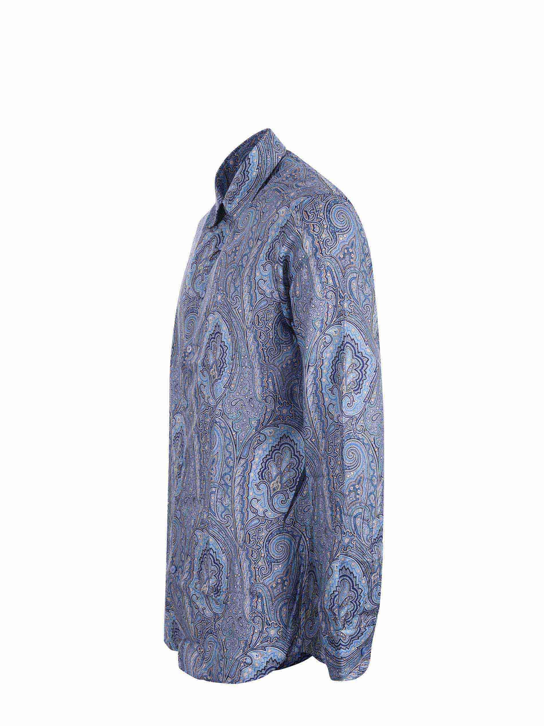 Camicia Etro in cotone stampato Blu fantasia paisley all over. Colletto classico. Chiusura con bottoni. Manica lunga. Polso con bottone.