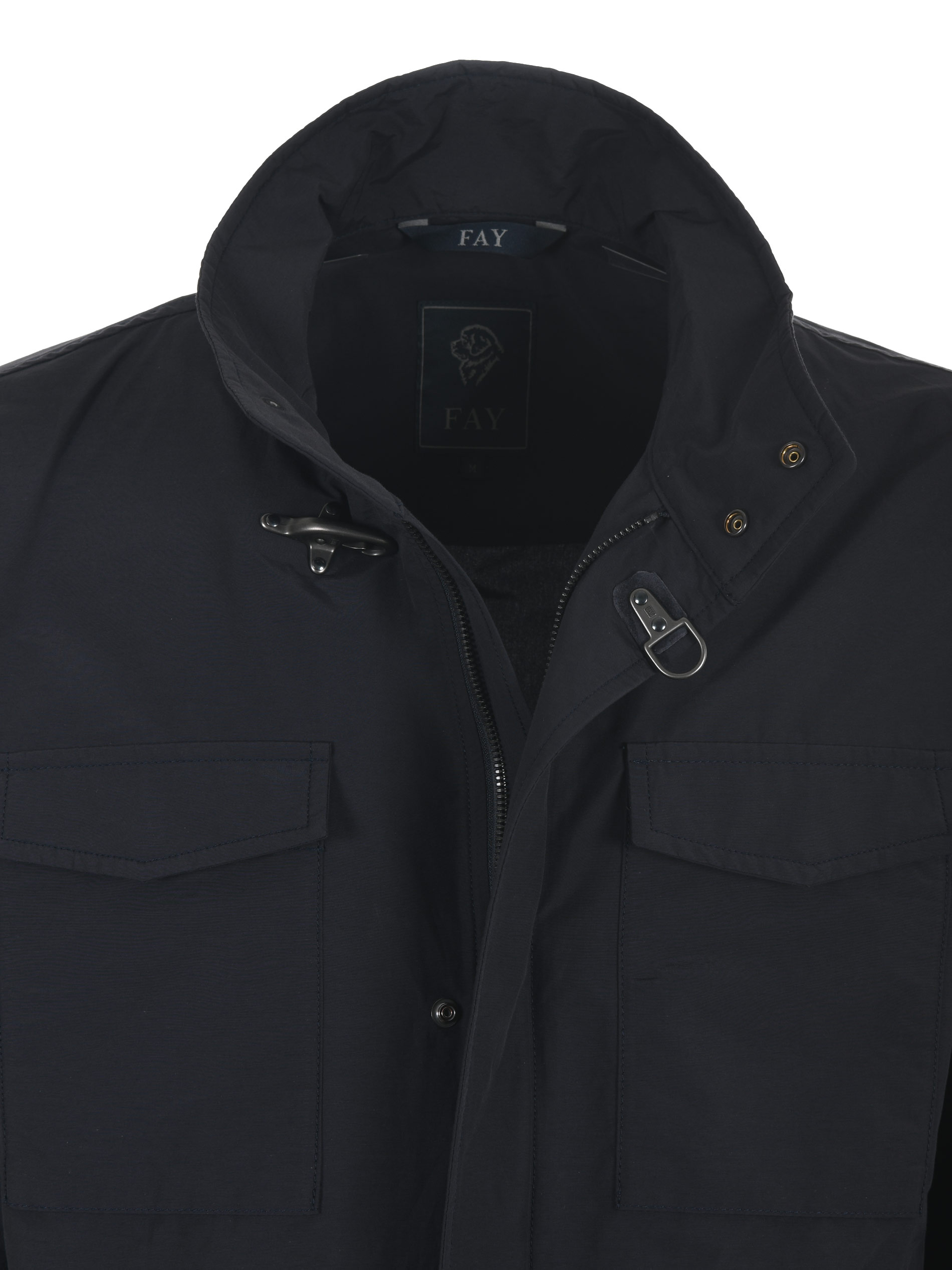 Field Jacket Fay in tecno cotone effetto taffetà Blu scuro. Non imbottito. Collo alto. Chiusura nascosta con zip doppio cursore e bottoni a pressione. Gancio iconico. Quattro tasche con pattina. Sfoderato.