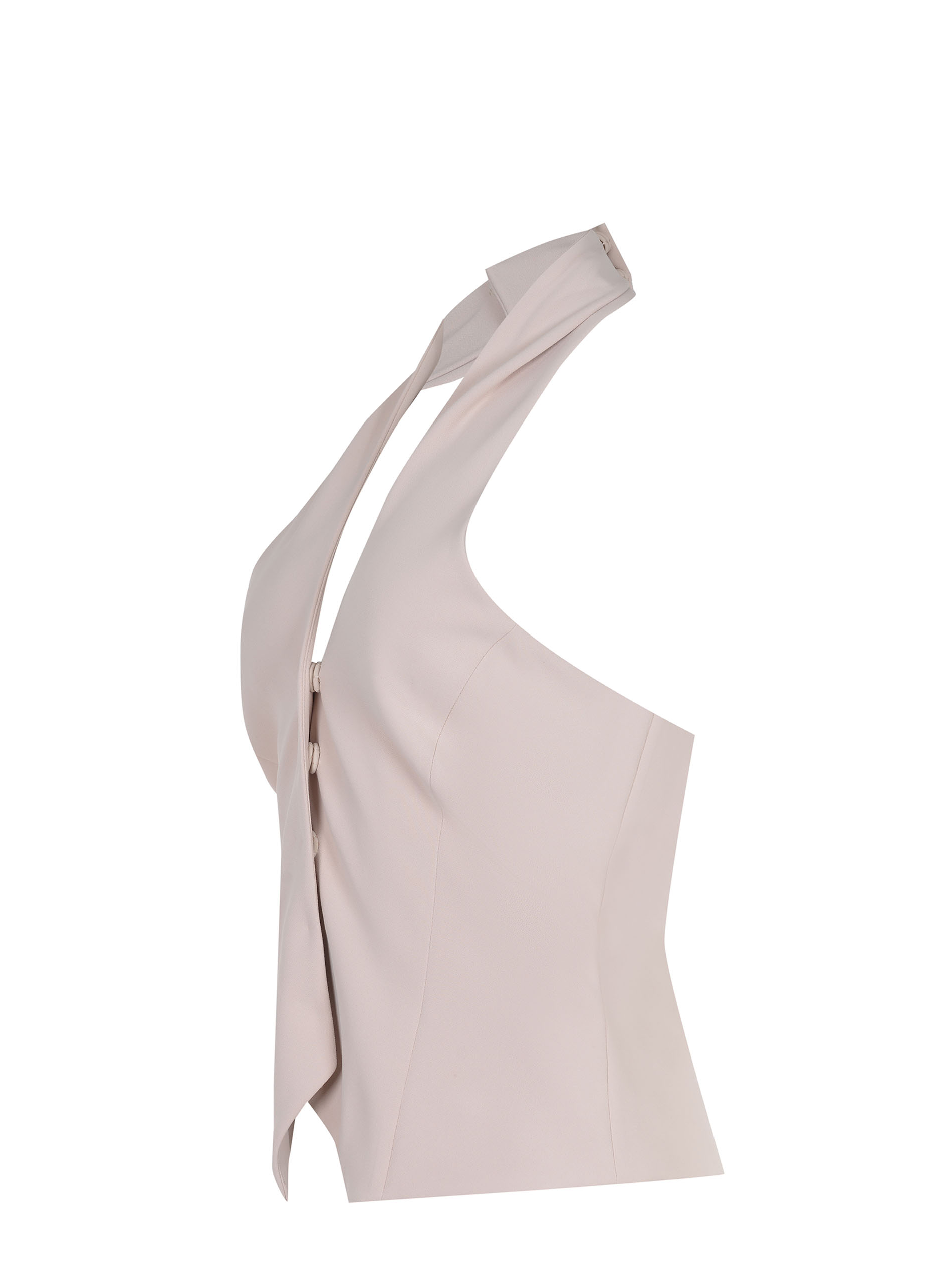 Scollo a V e chiusura con bottoni sul retro.