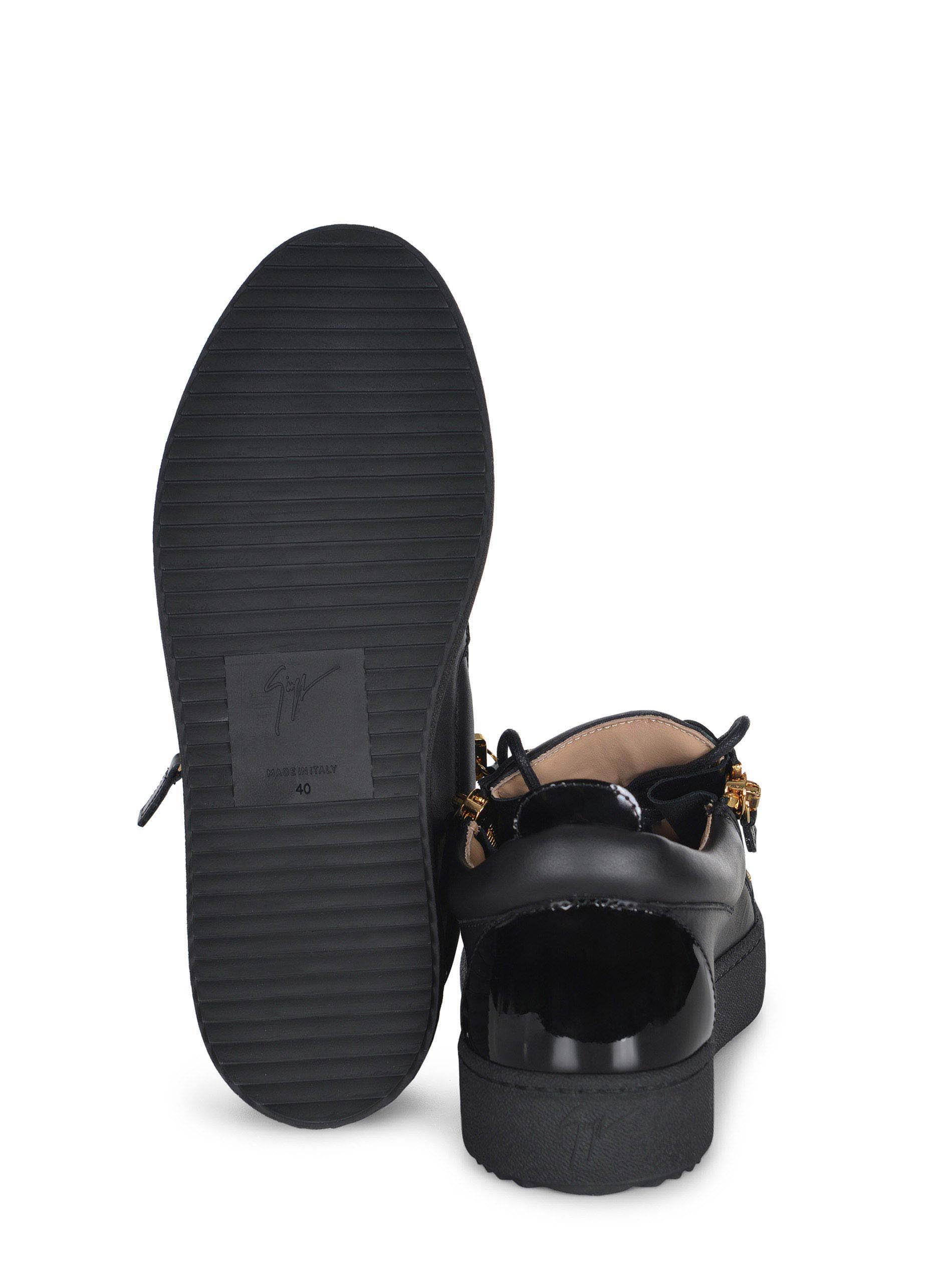 Sneakers Giuseppe Zanotti "Frenkie" realizzata in pelle di colore Nero. Inserti in vernice. Punta tonda. "Signature" in metallo Dorato sulla linguetta. Stringata. Laccio tono su tono. Chiusura con zip cerate, in metallo Dorato laterali. Suola in gomma di colore Nero. Logo impresso sul retro.