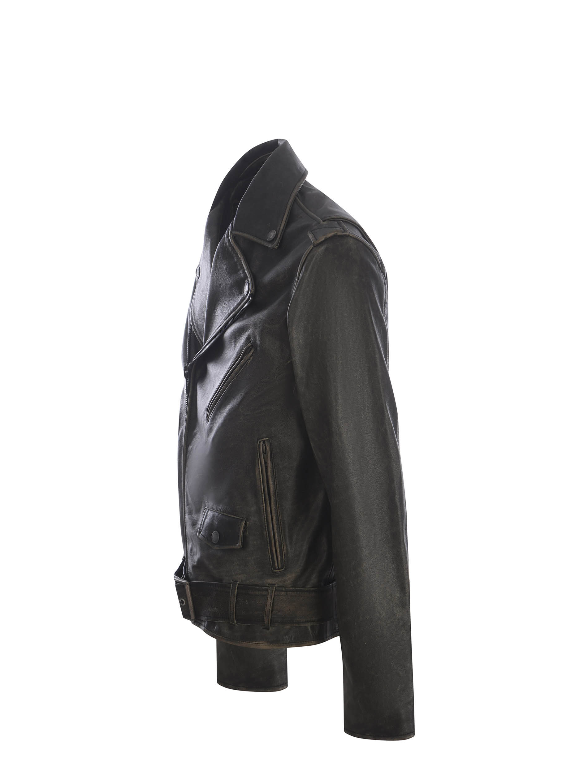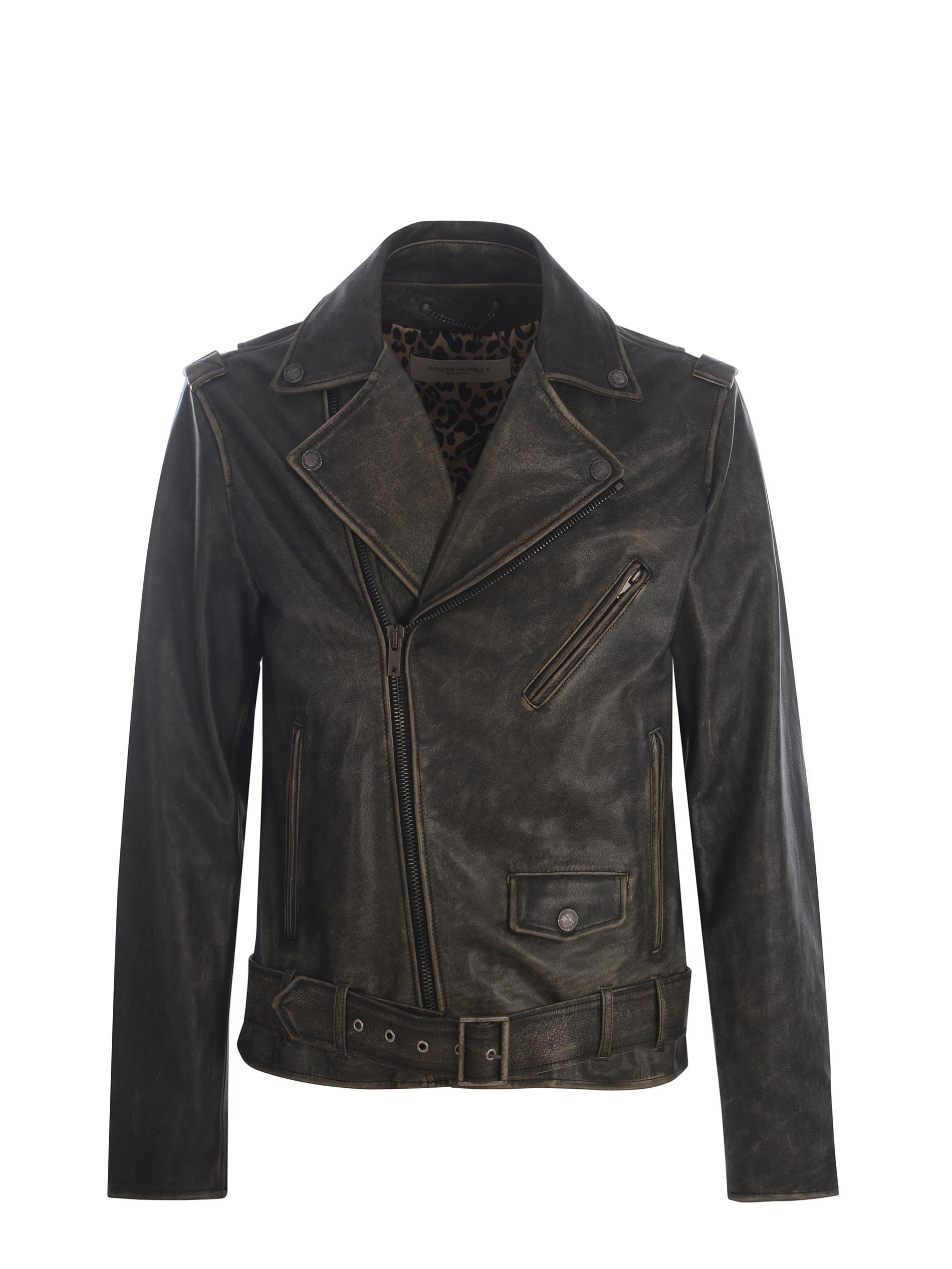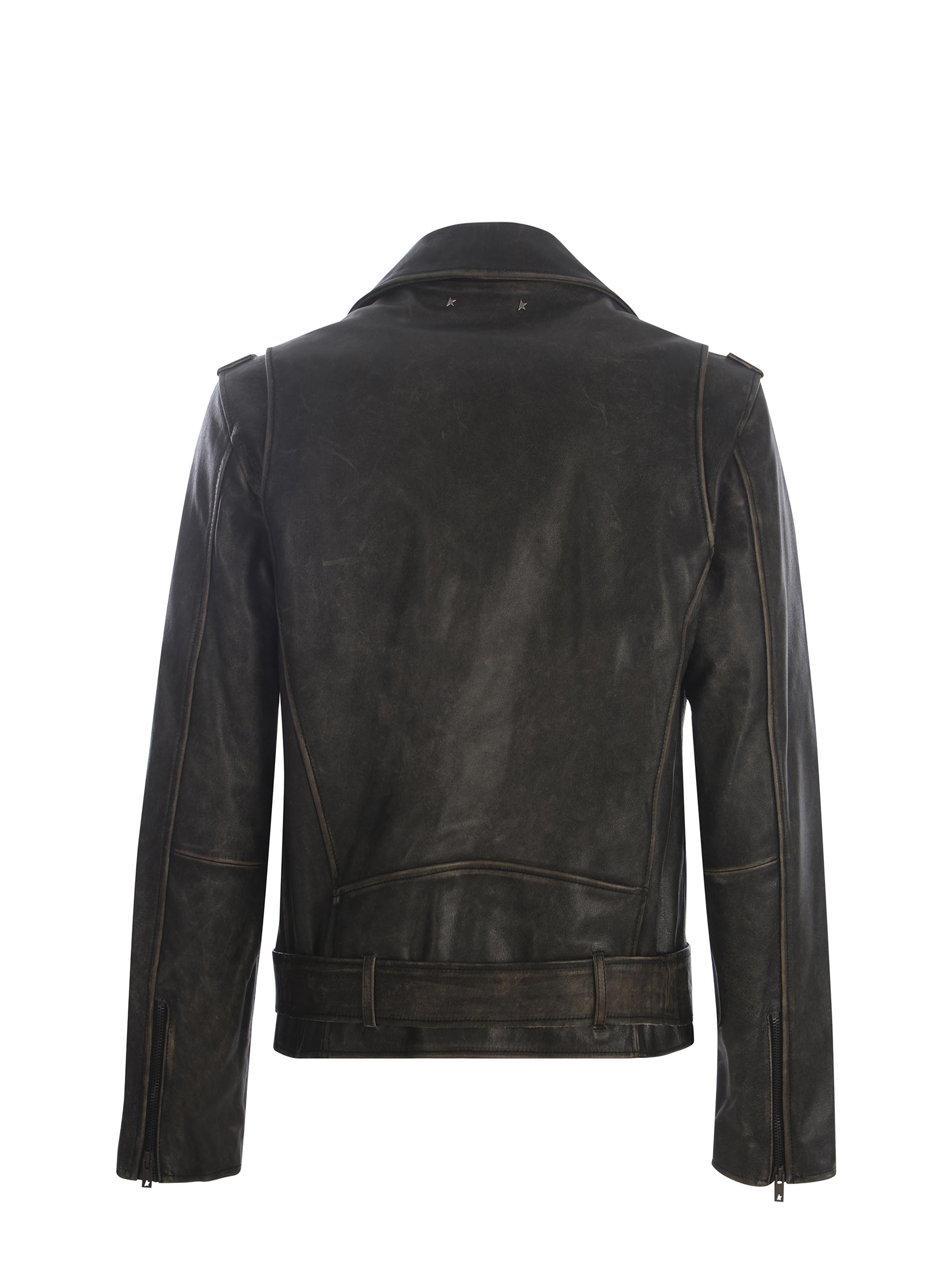 Chiodo Golden Goose realizzato in pelle di colore Nero. Trattamento distressed. Collo con rever. Maniche lunghe. Polsi con zip.