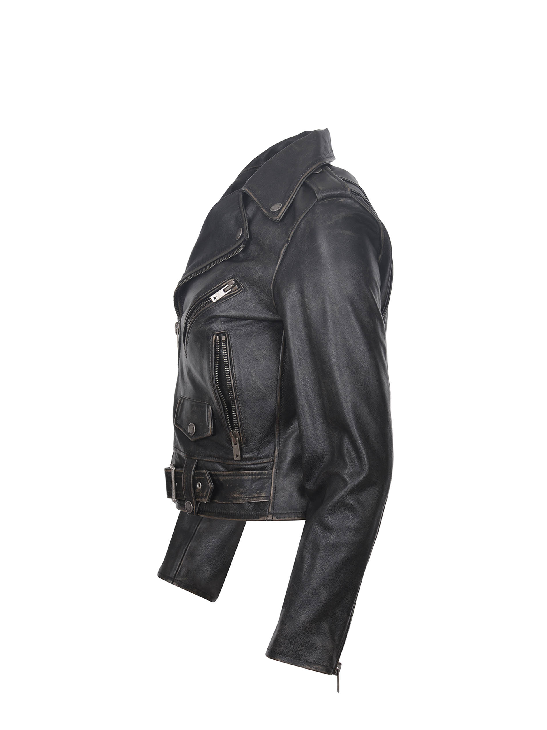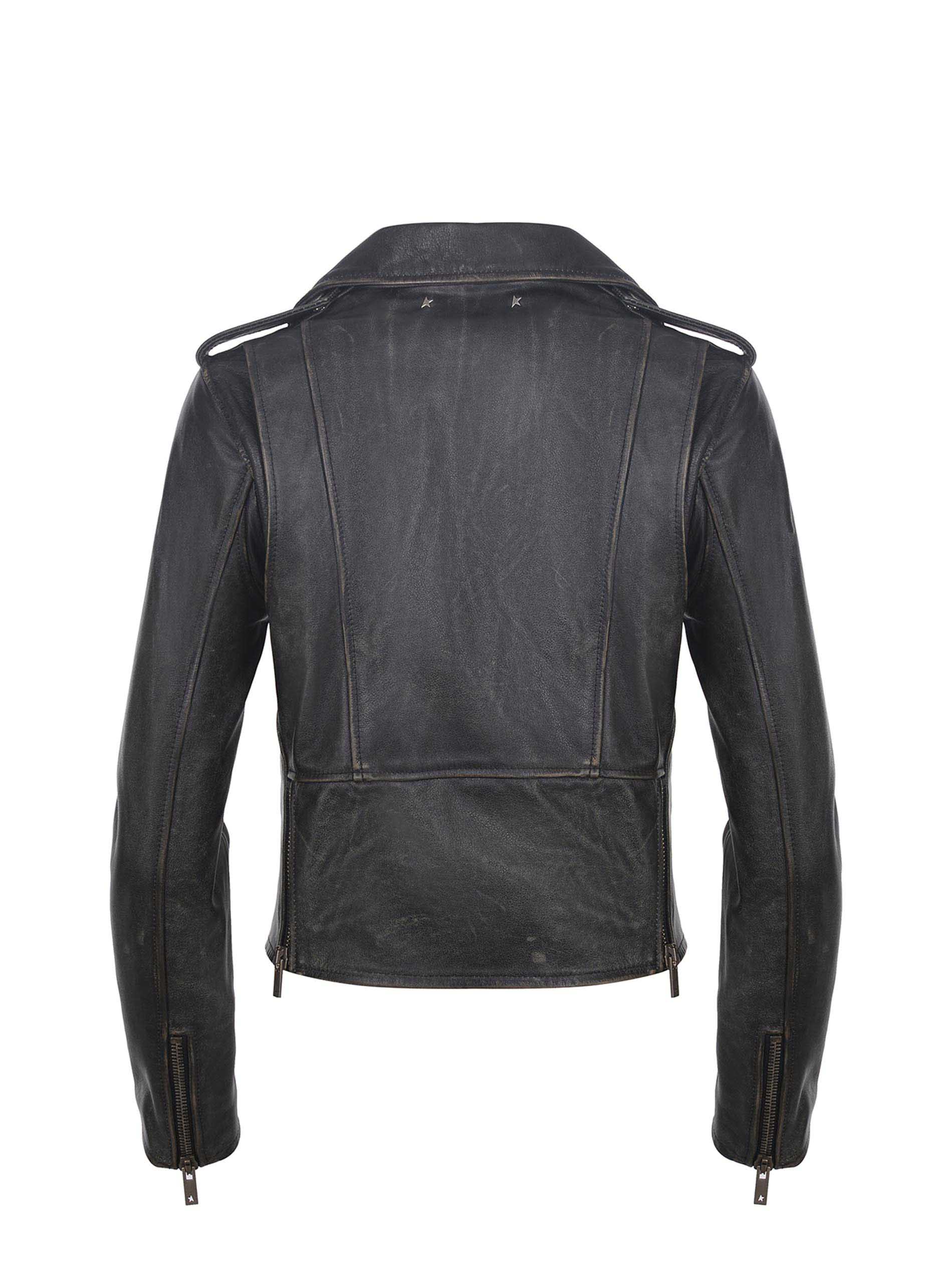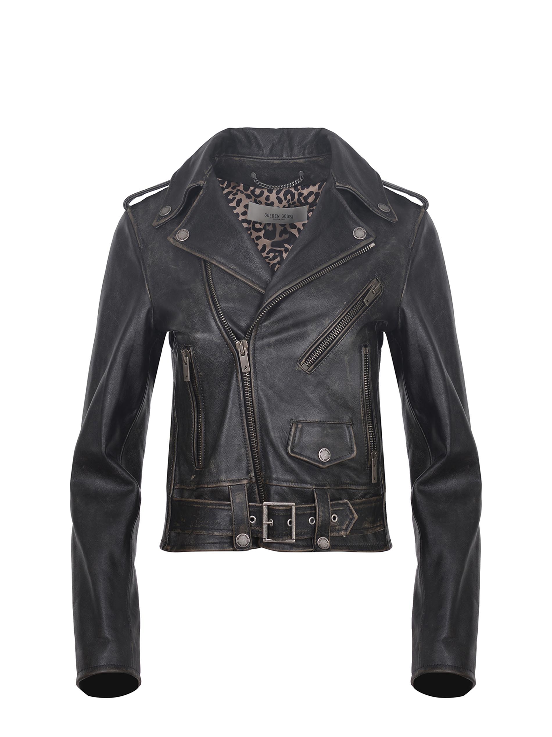 Chiodo Golden Goose realizzato in pelle di colore Nero. Trattamento distressed. Collo con rever. Maniche lunghe. Polsi con zip. Tasca con zip, sul petto. Tasche laterali con zip. Tasca con patta applicata di lato. Cintura con passanti al fondo, abbinata. Chiusura con zip. Foderato.