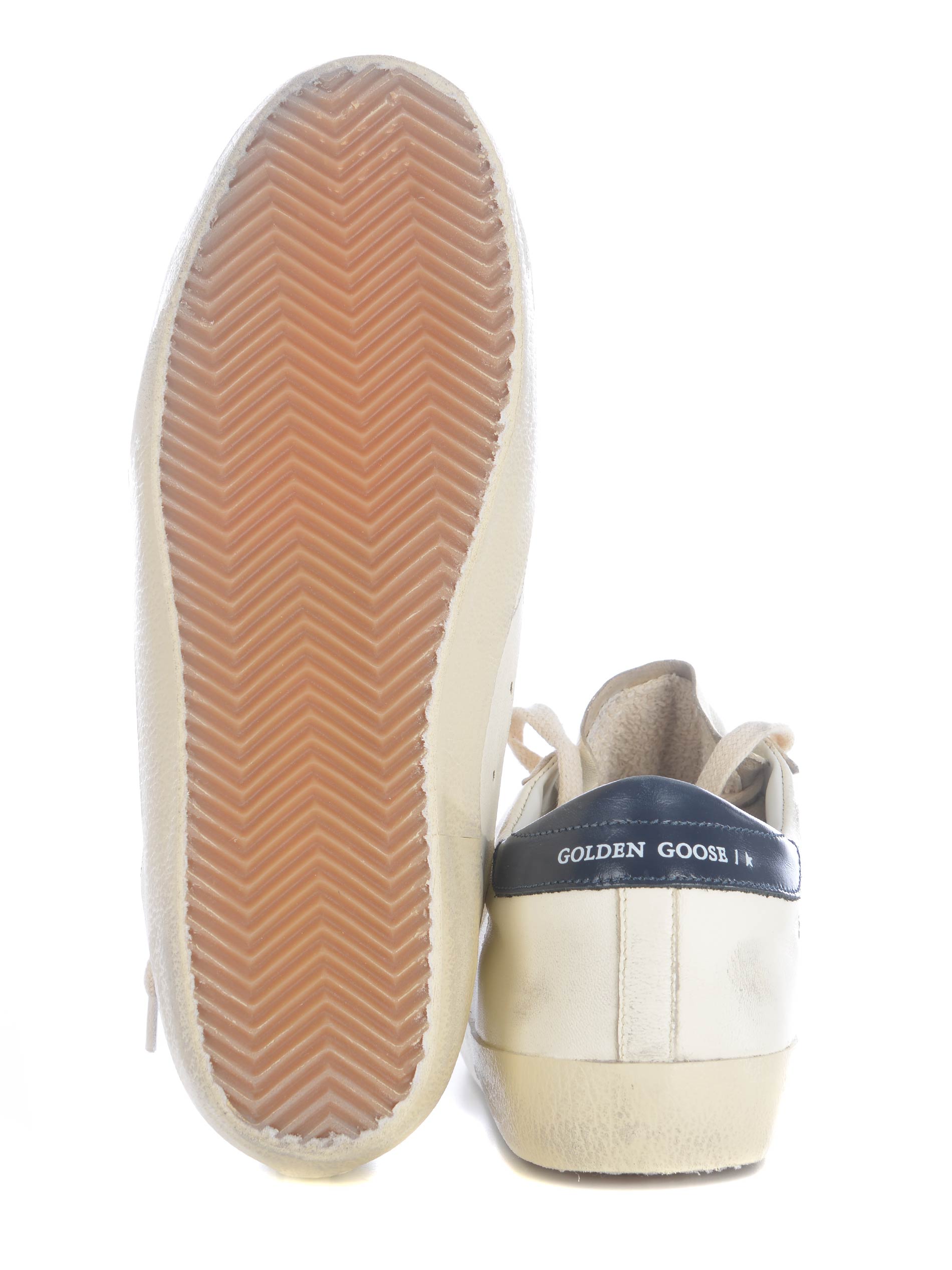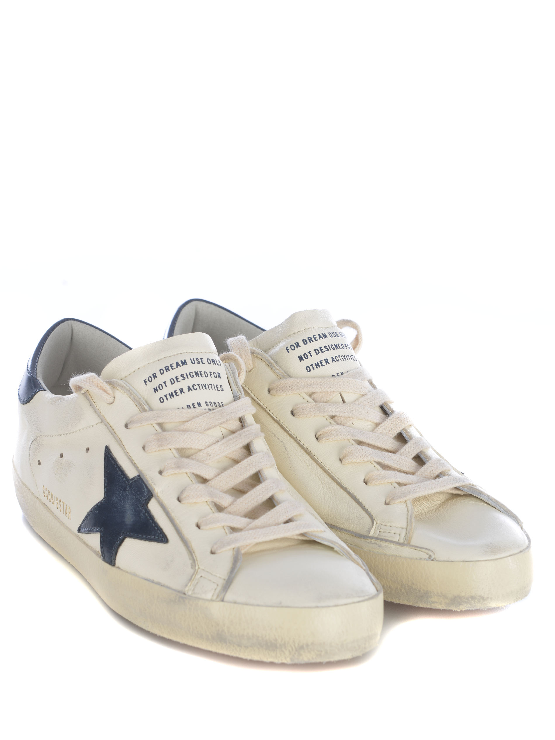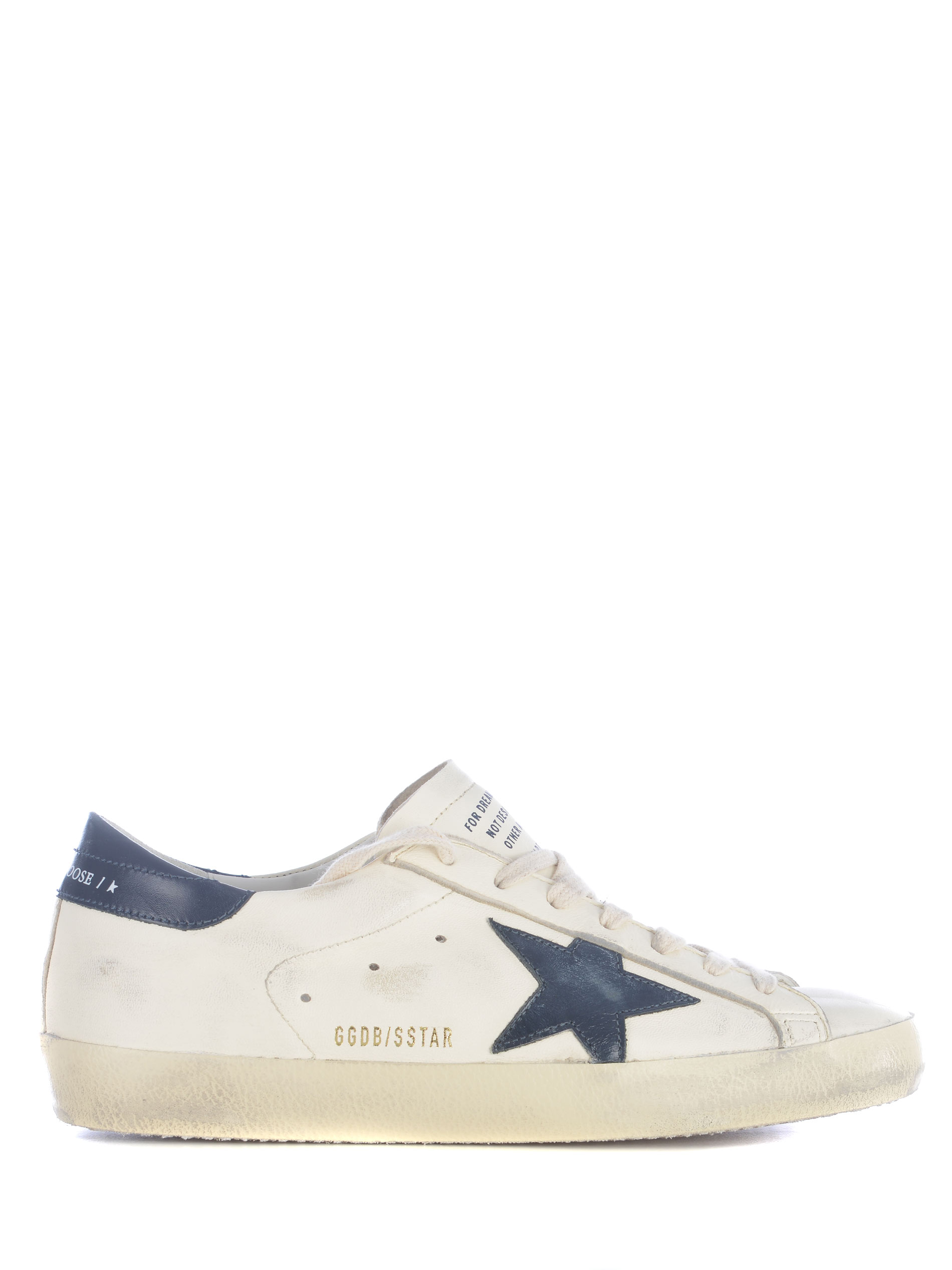Sneakers Golden Gooose "Super Star" realizzata in pelle di colore Bianco. Effetto vintage. Punta tonda. Lettering sulla linguetta. Stringata. Logo "Star" a contrasto Blu, lettering "GGDB/SSTAR" di colore Dorato, di lato. Tallone di colore Blu, lettering "Golden Goose" a contrasto Bianco sul retro.
