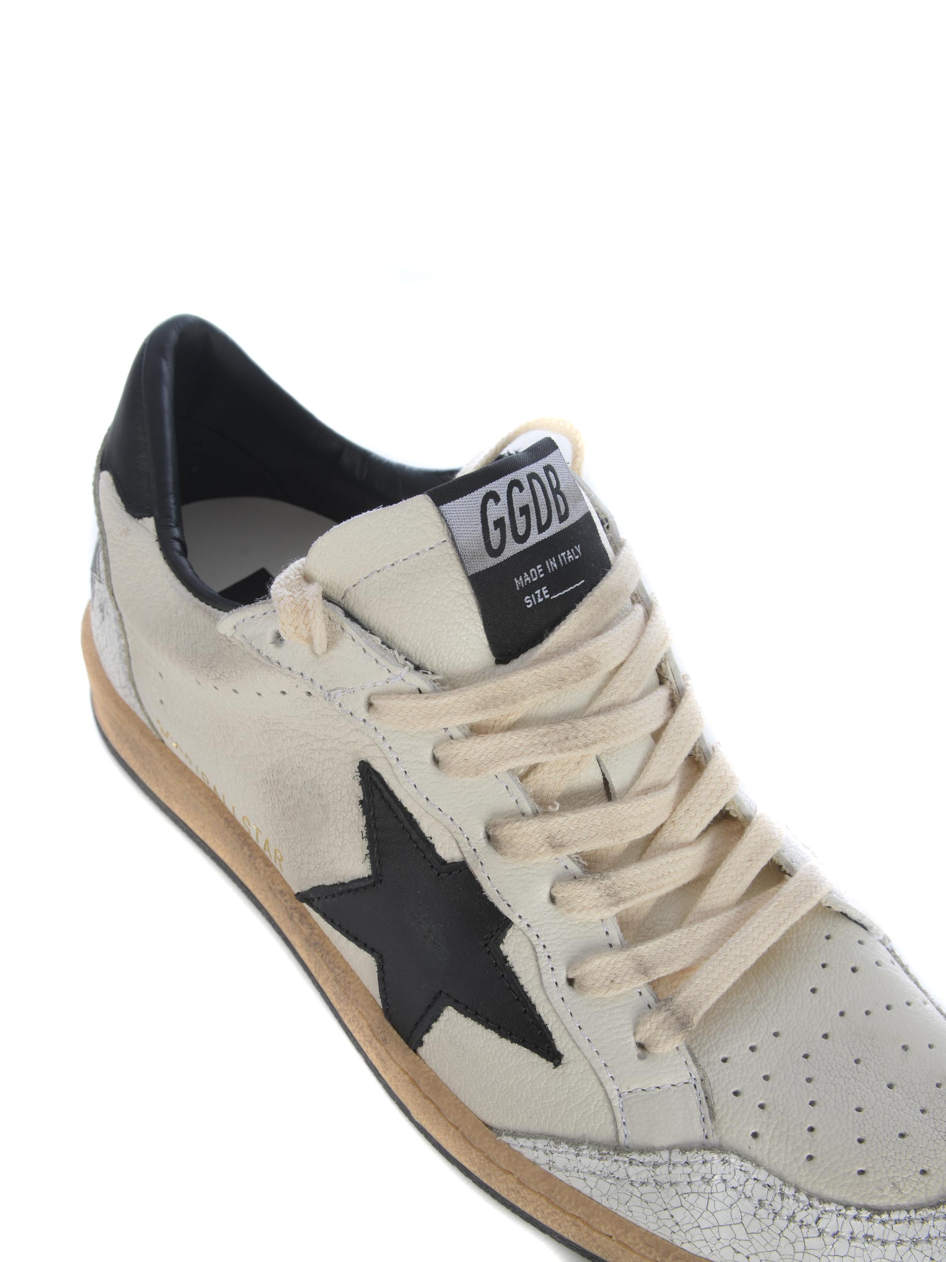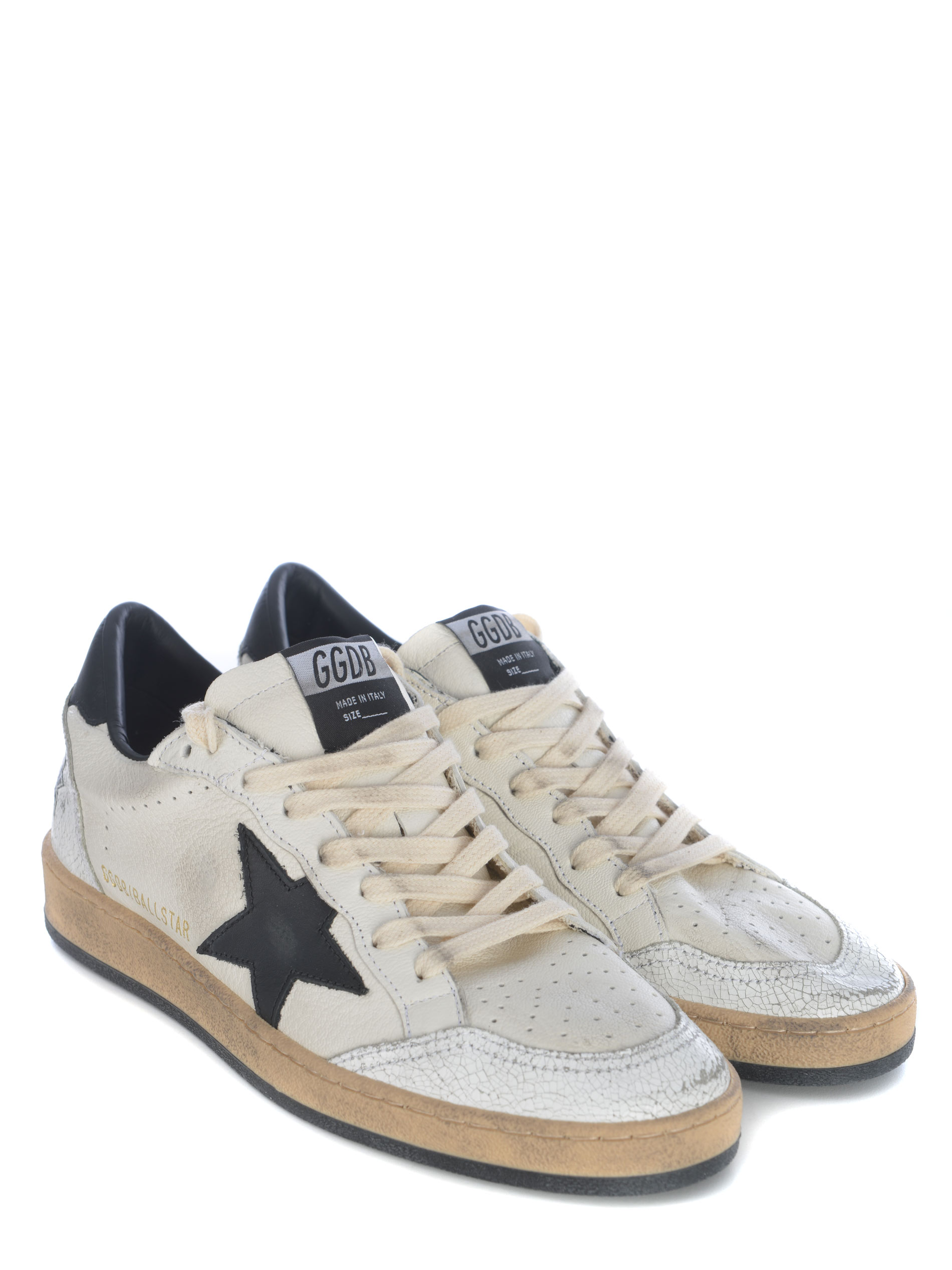 Sneakers Golden Goose "Ball Star" realizzata in pelle di colore Bianco. Inserti in pelle cracklé di colore Bianco. Effetto vintage. Punta tonda, traspirante. Patch logo applicato sulla linguetta. Stringata.