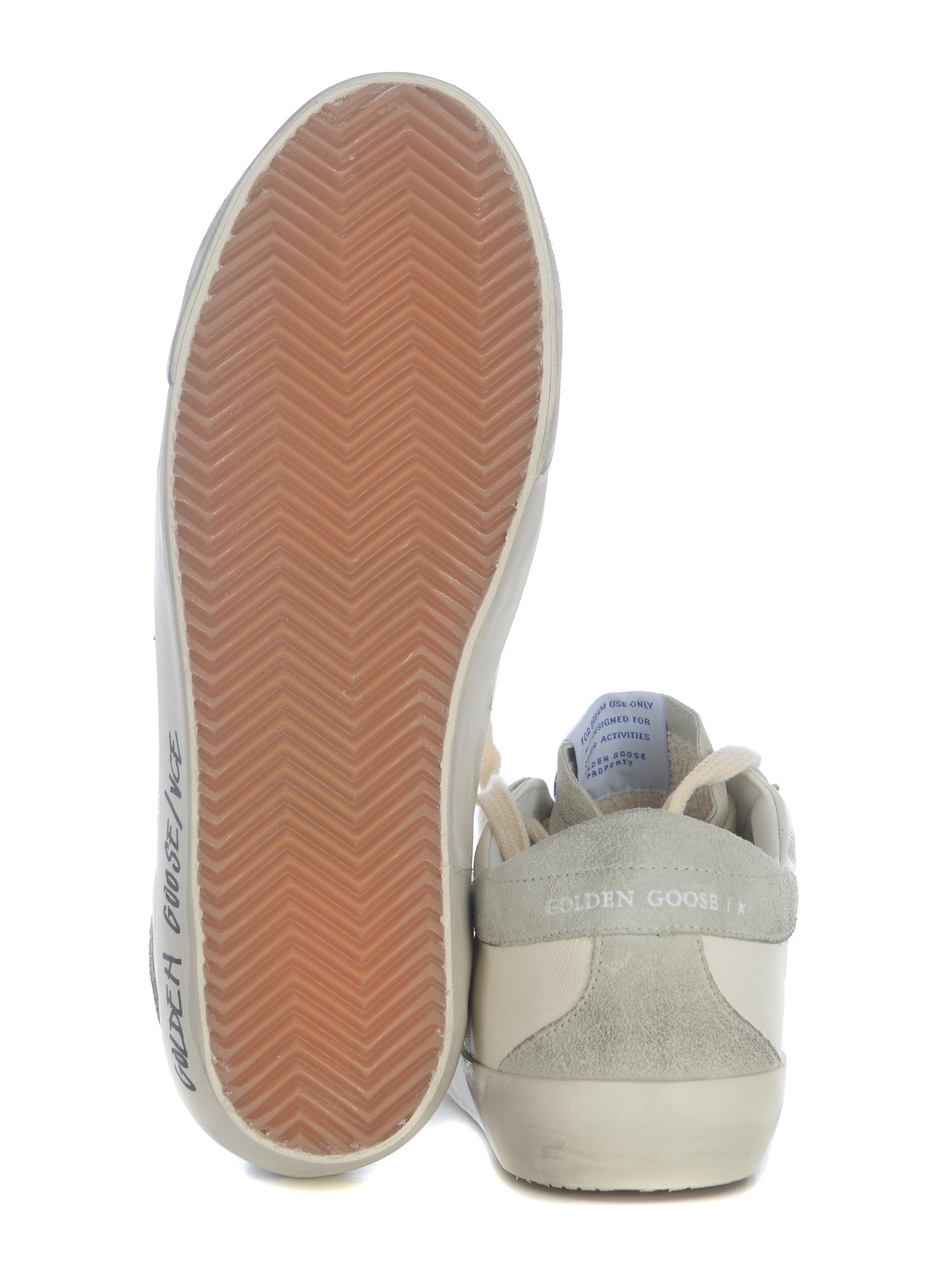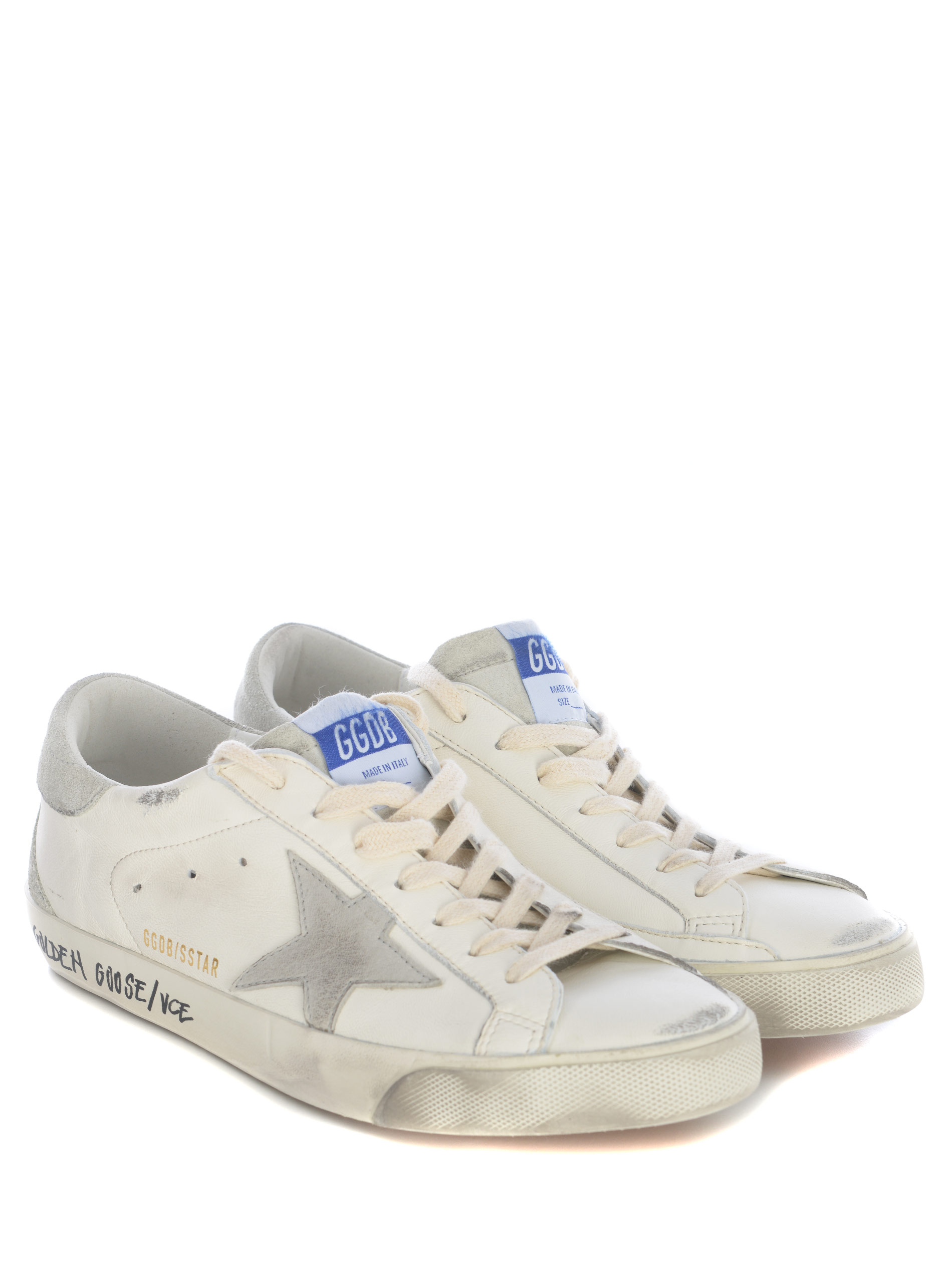 Sneakers Golden Goose "Super Star" realizzata in pelle di colore Bianco. Inserti in pelle camosciata di colore Grigio. Effetto vintage. Punta tonda.