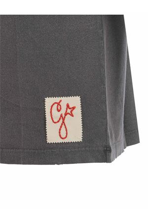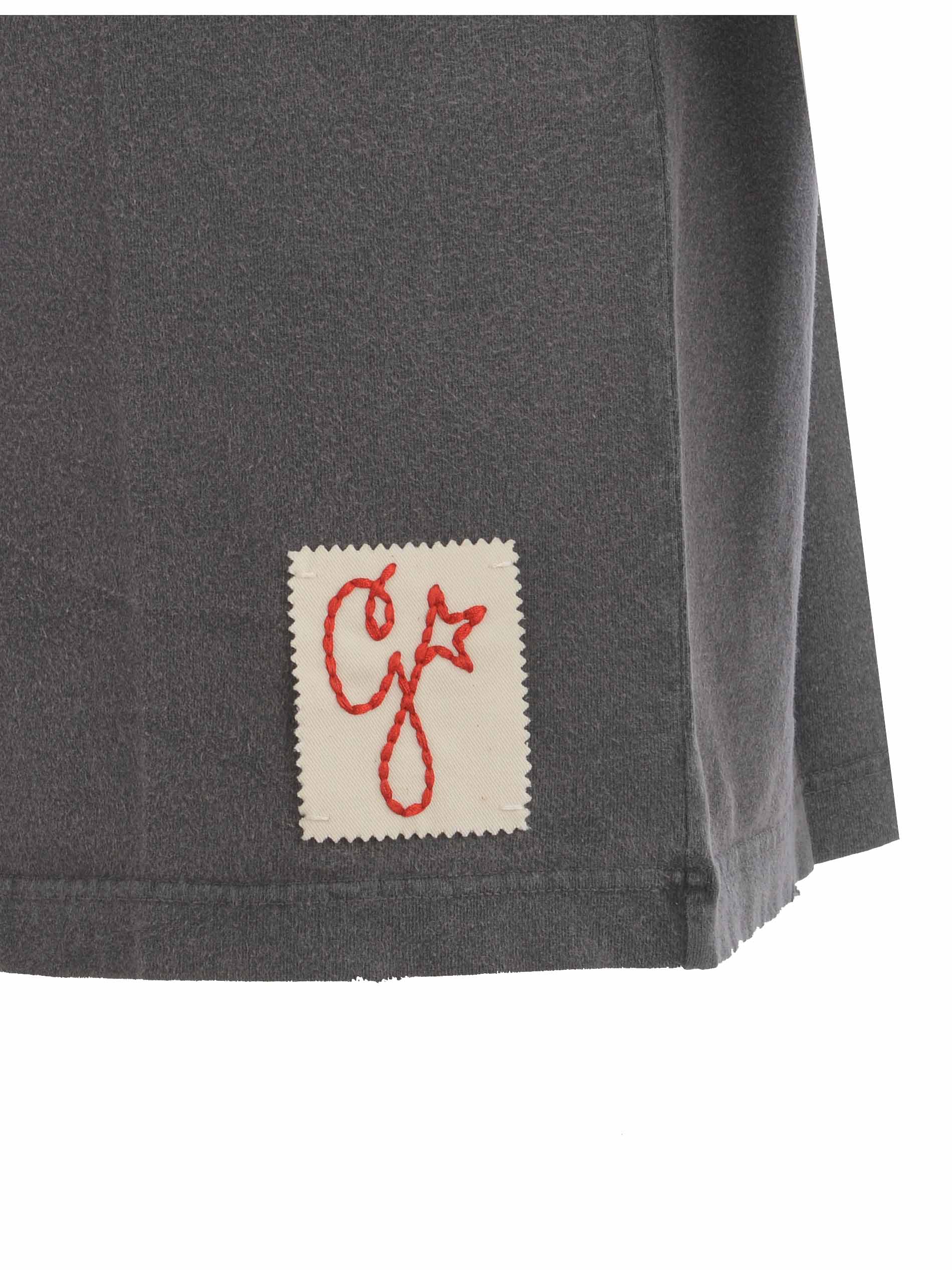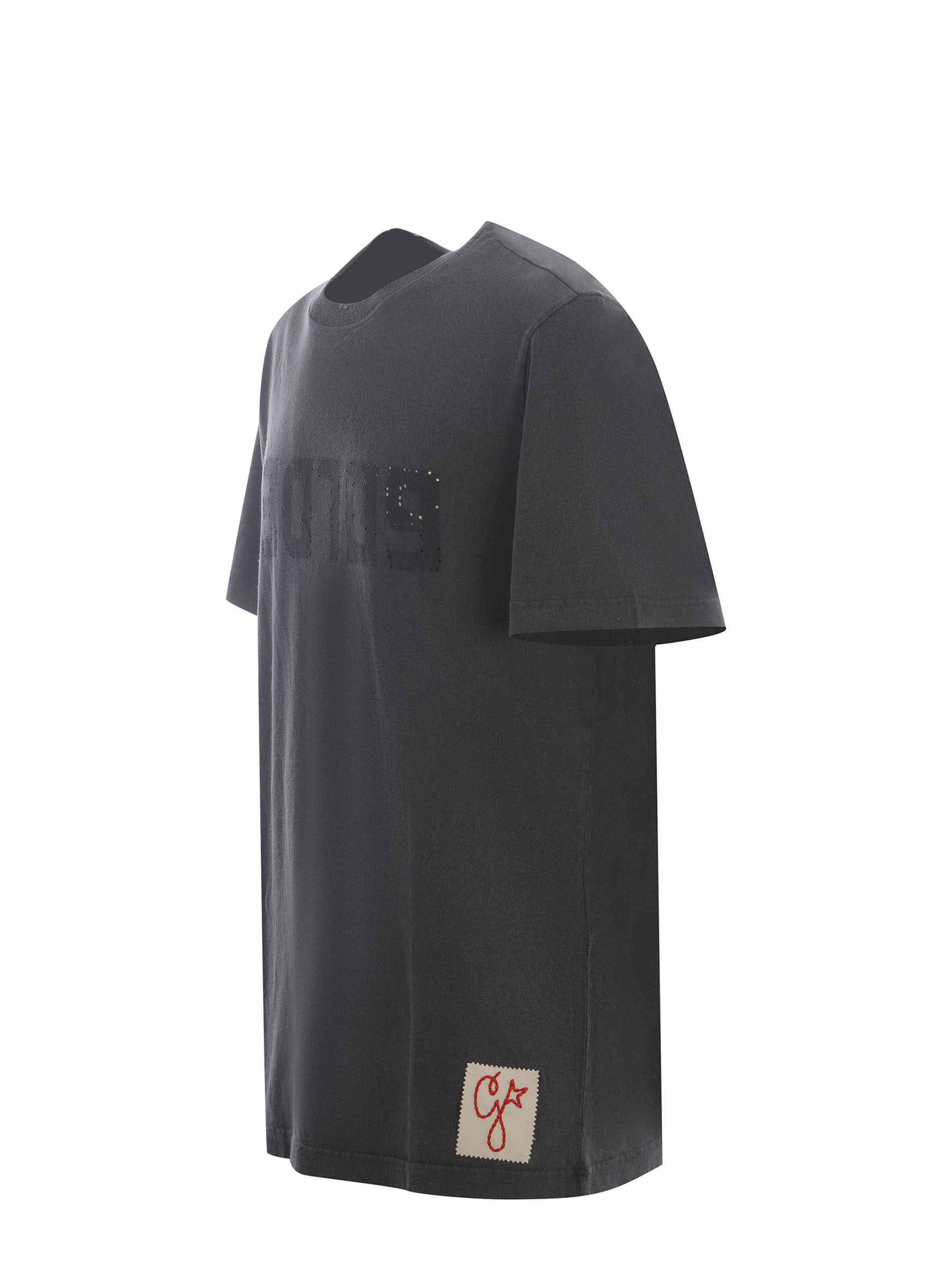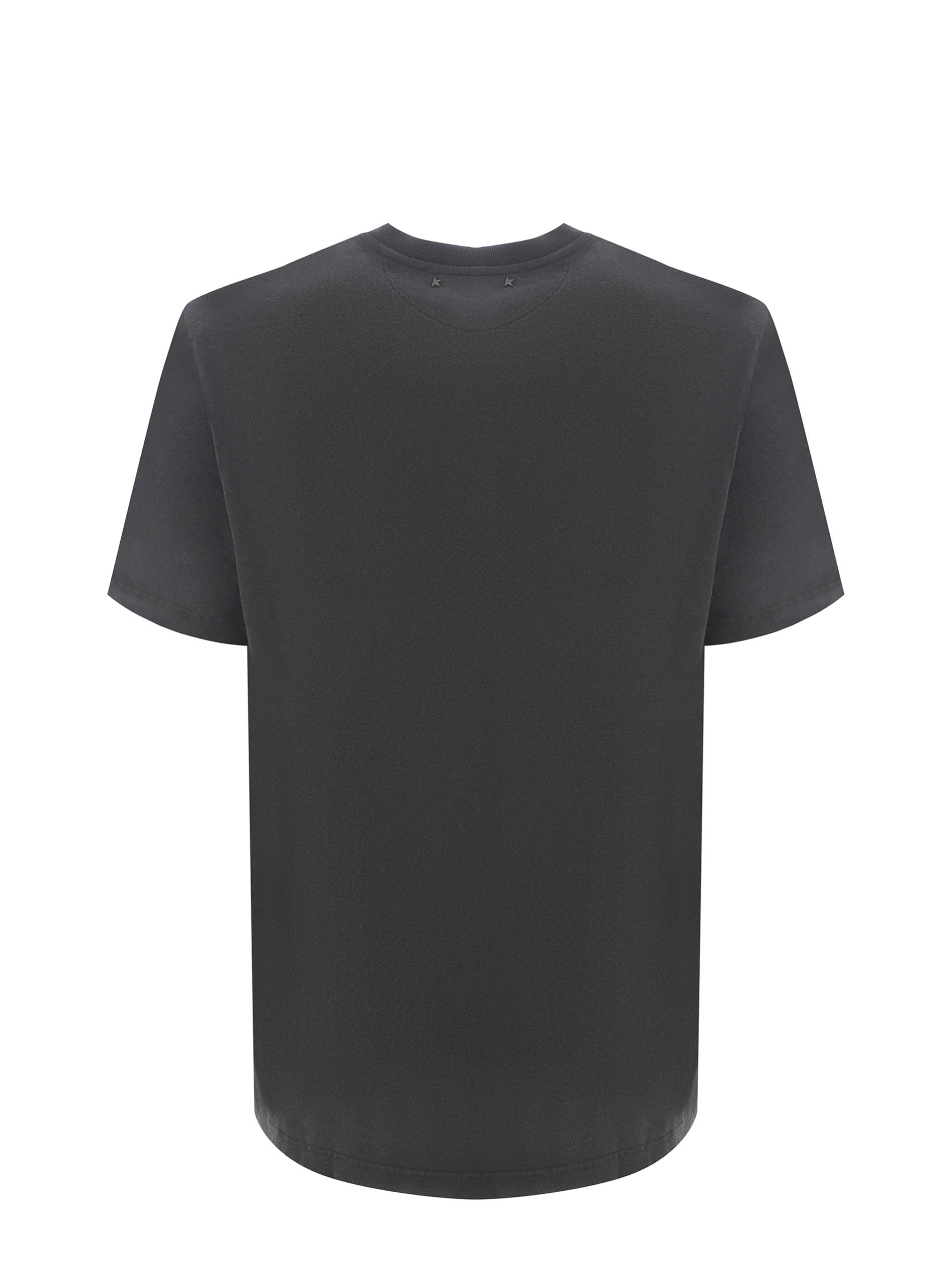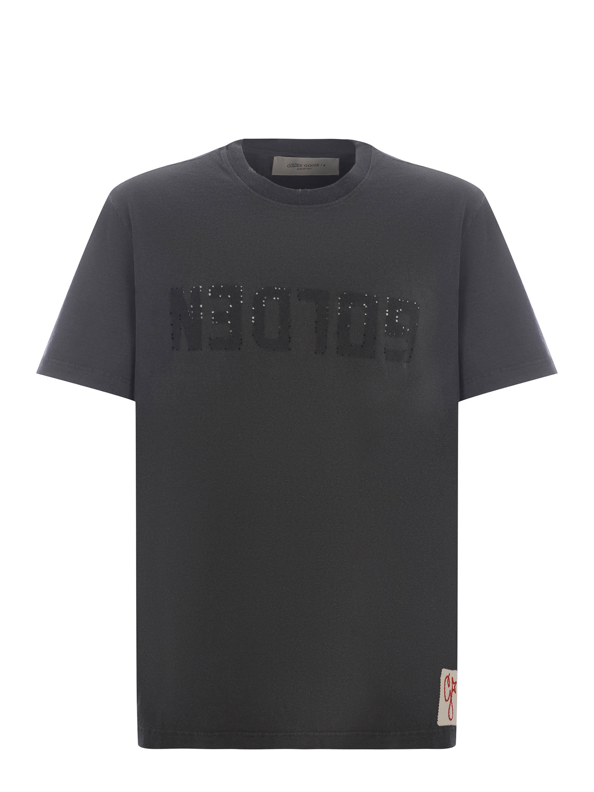 T-shirt Golden Goose in cotone di colore Grigio Antracite. Girocollo a costine. Maniche corte. Lettering logo "Golden" davanti. Francobollo rimovibile di colore Bianco con la lettera "G" Rossa ricamata. Doppia "Star" applicata sotto lo scollo sul retro.