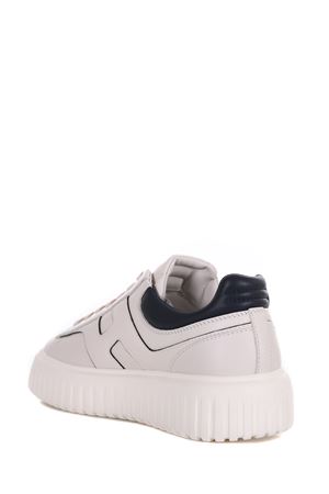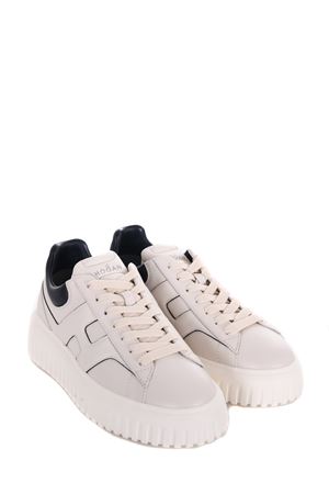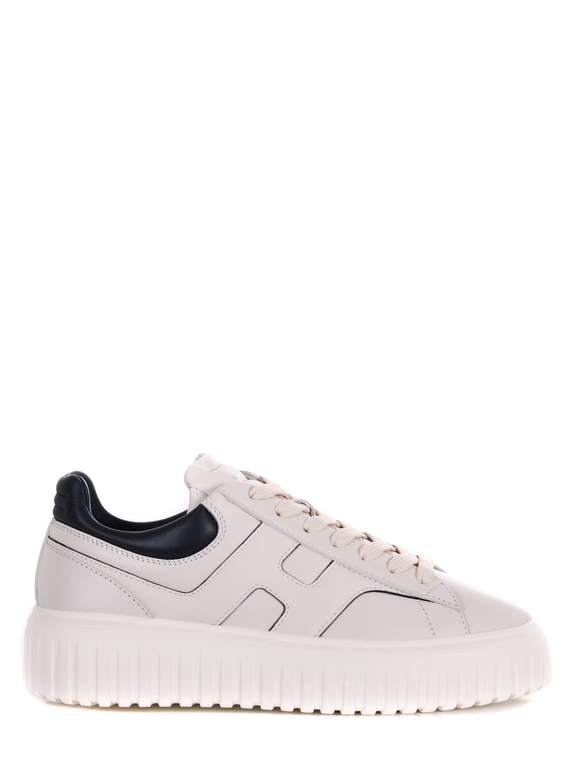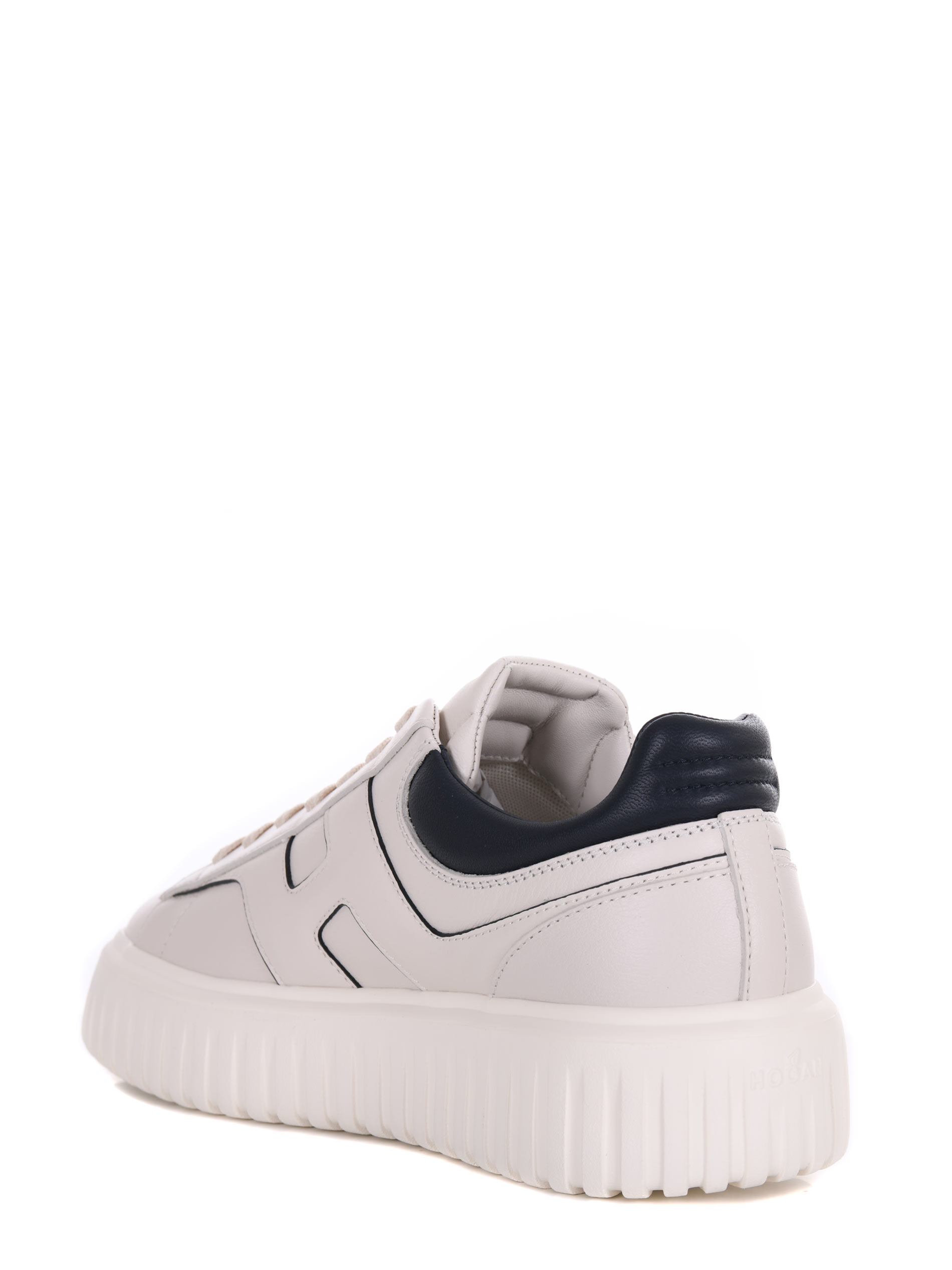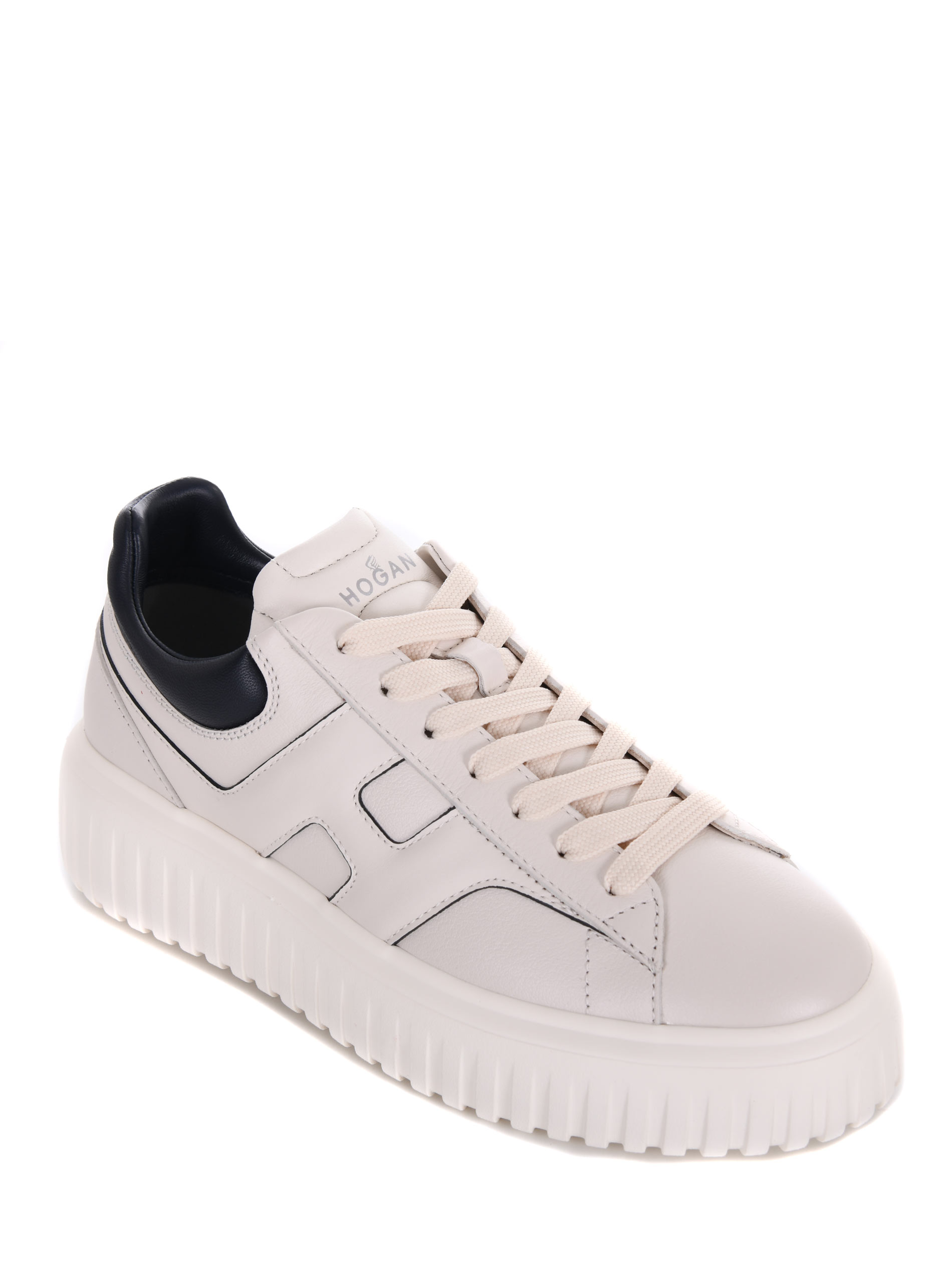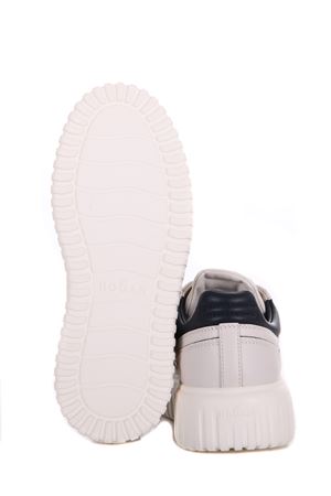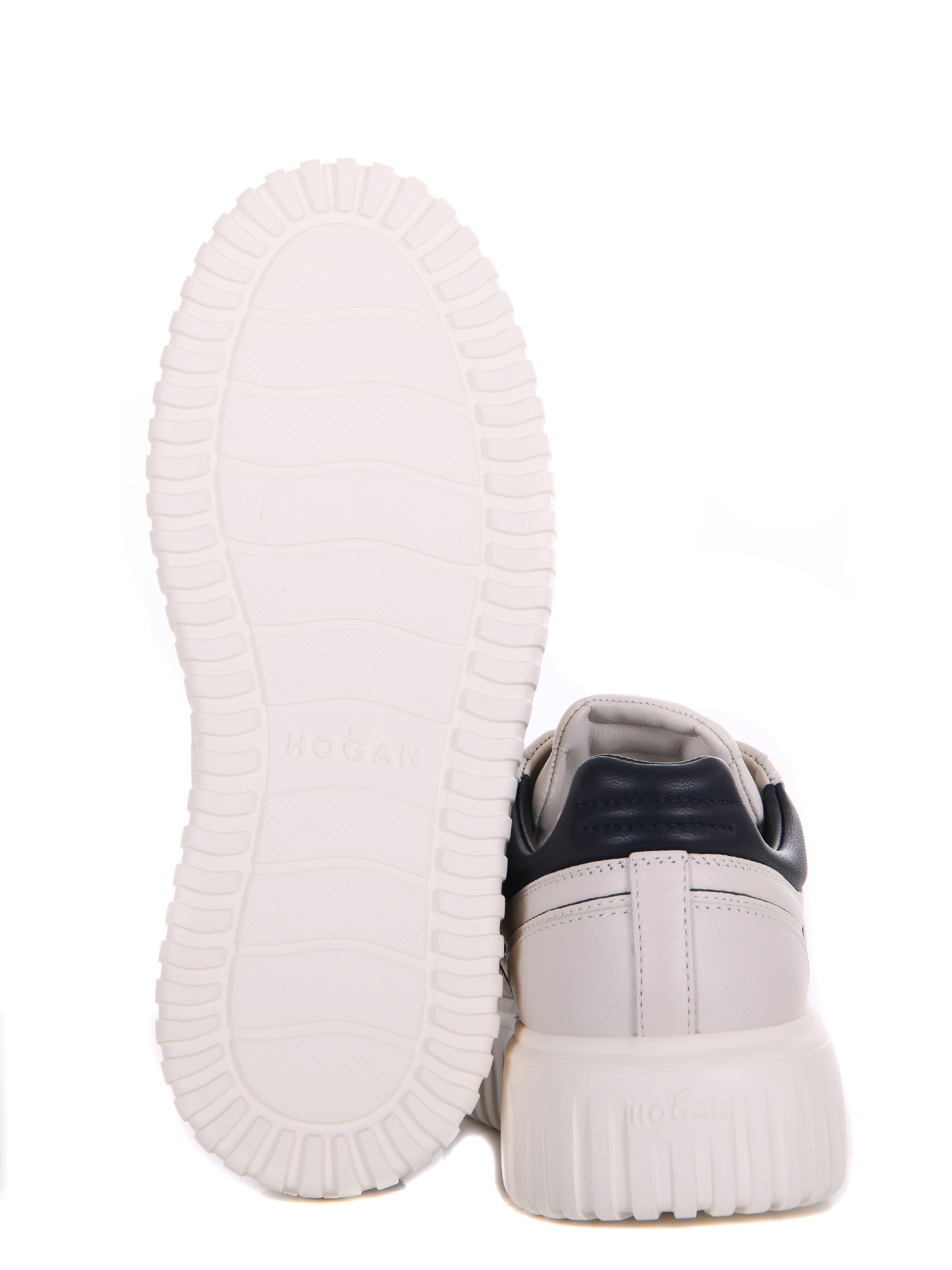 Sneakers Hogan in nappa Avorio. Inserto in pelle Blu. H laterale applicata. Stringate. Soletta interna in memory foam. Suola 50 mm in gomma EVA motivo stripes.
