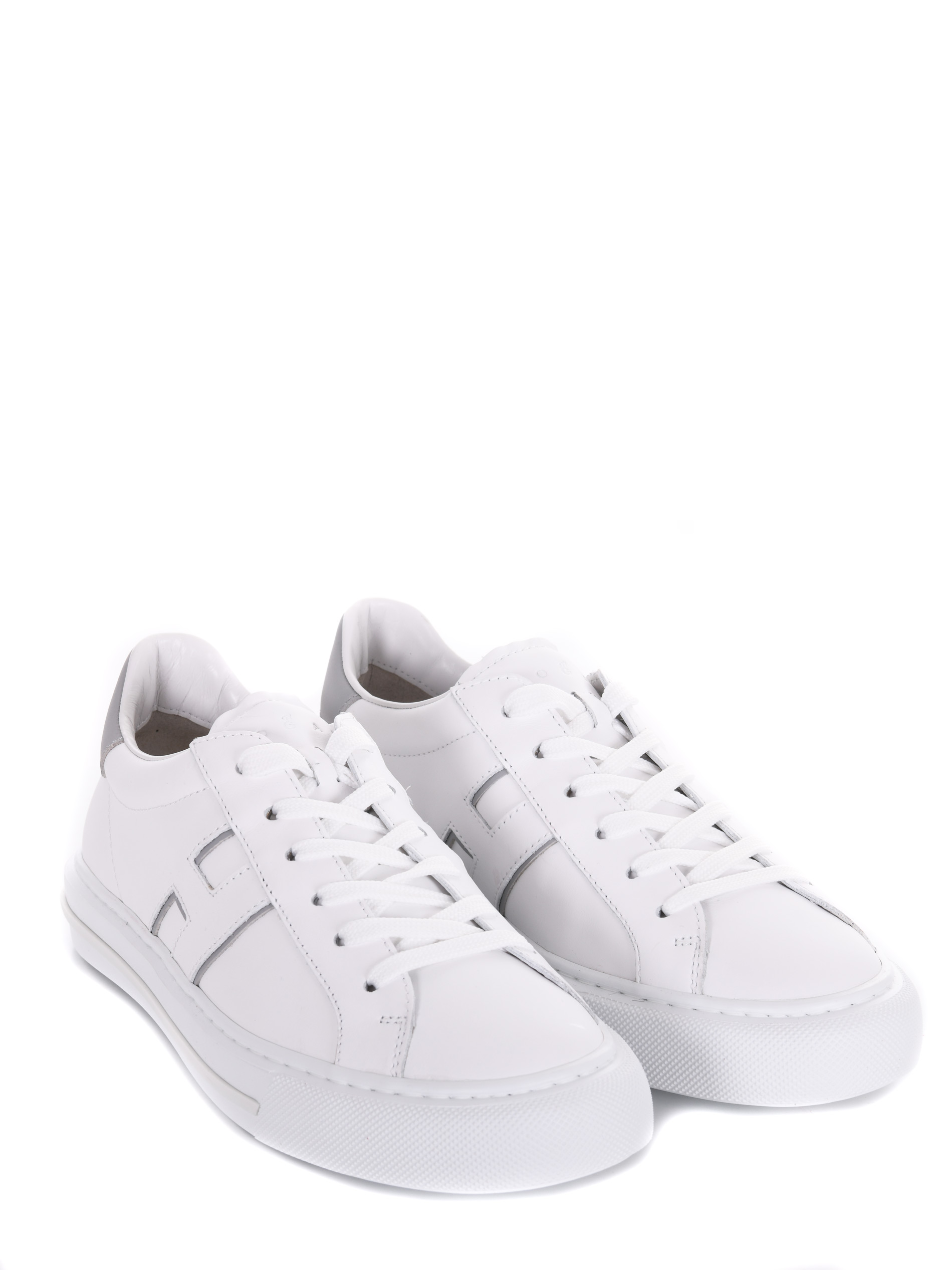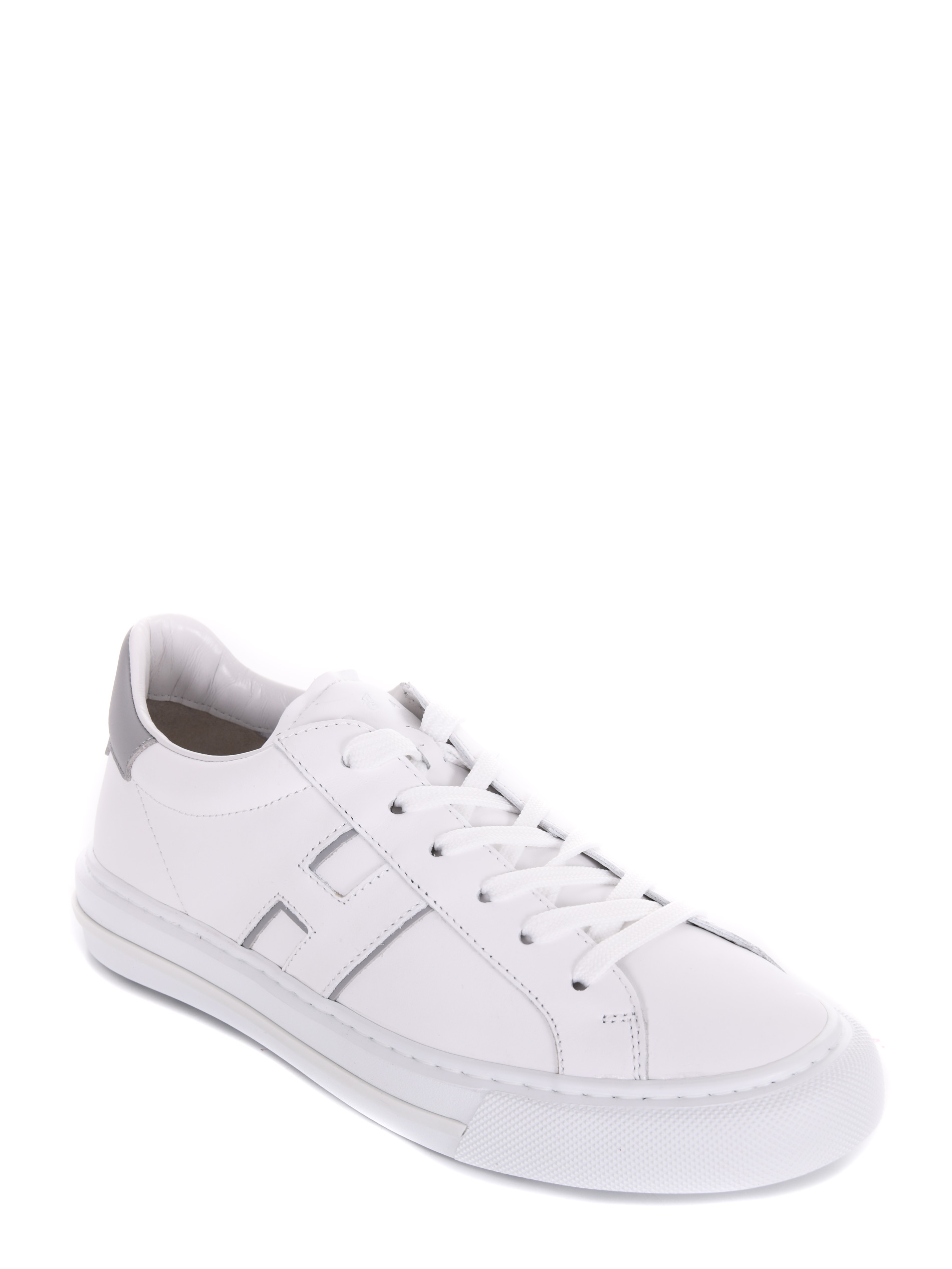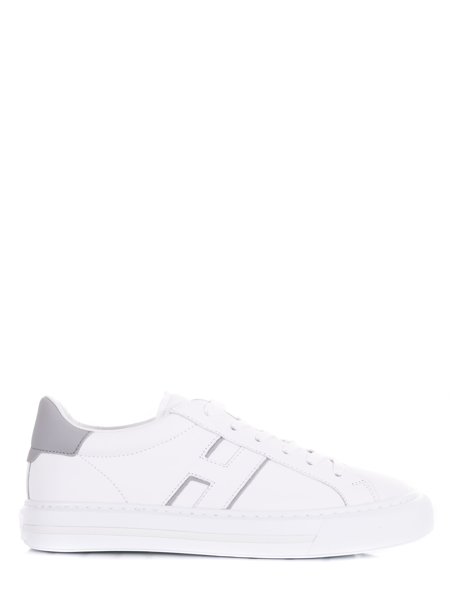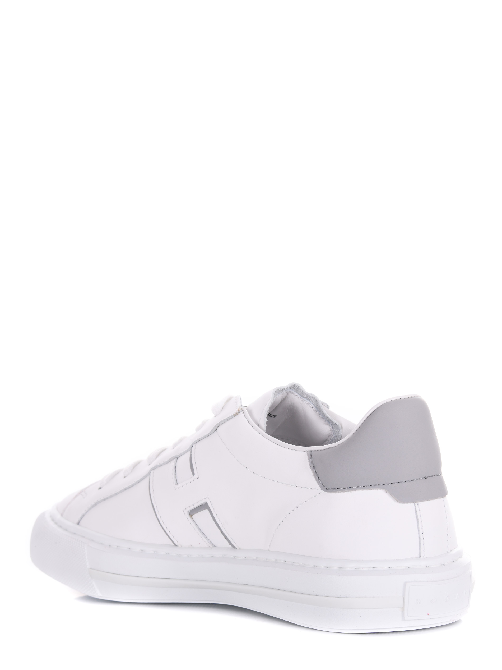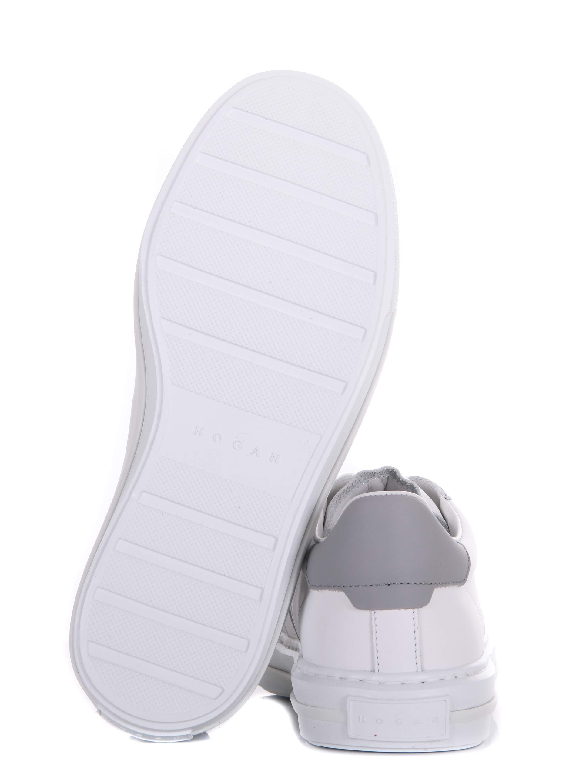 Sneakers Hogan in pelle bianca. Punta tonda. Lettering logo "Hogan" sulla linguetta. Stingata. Logo "H" laterale. Dettagli contrasto grigio. Fussbett in memory foam. Suola in gomma.