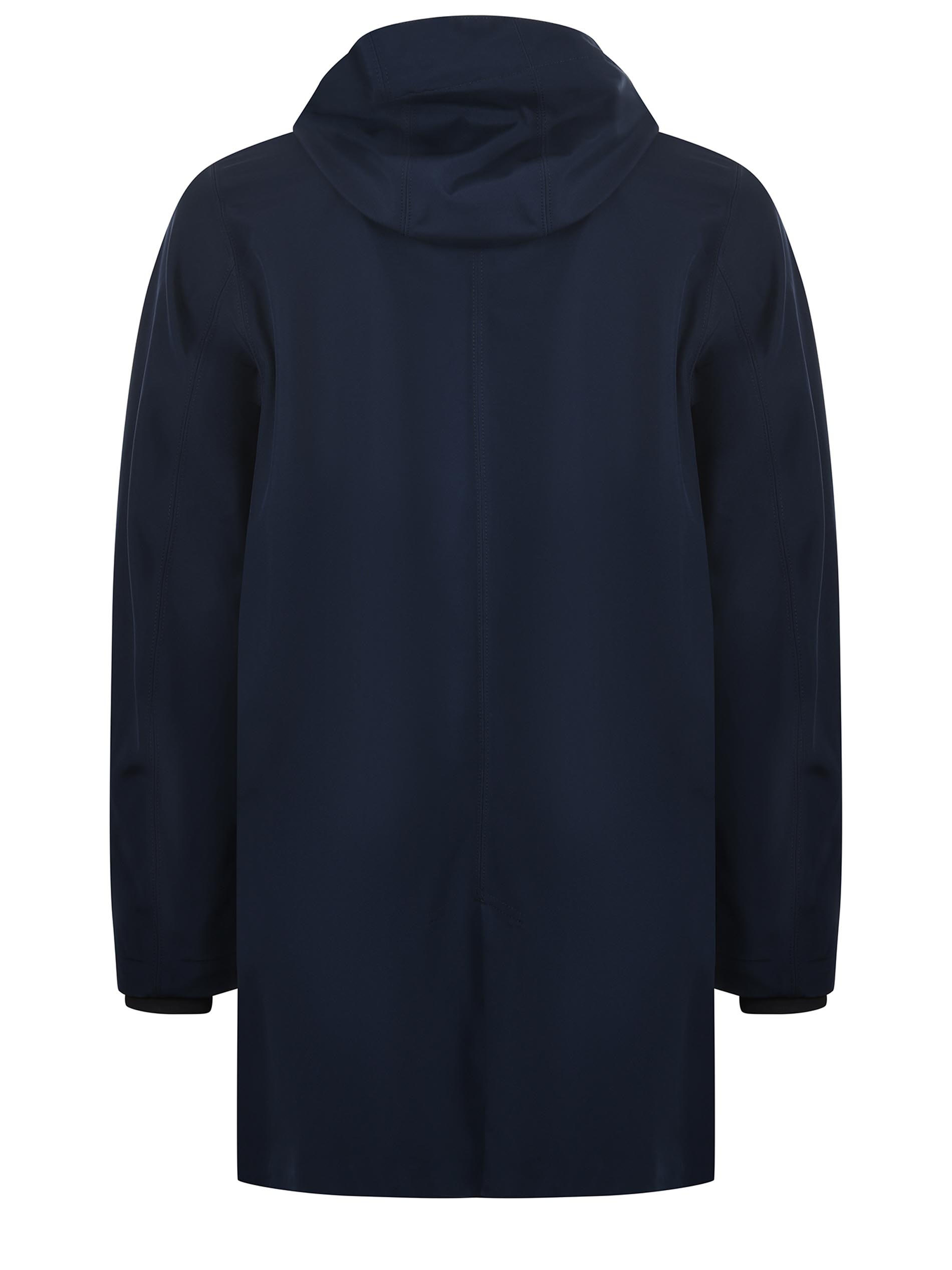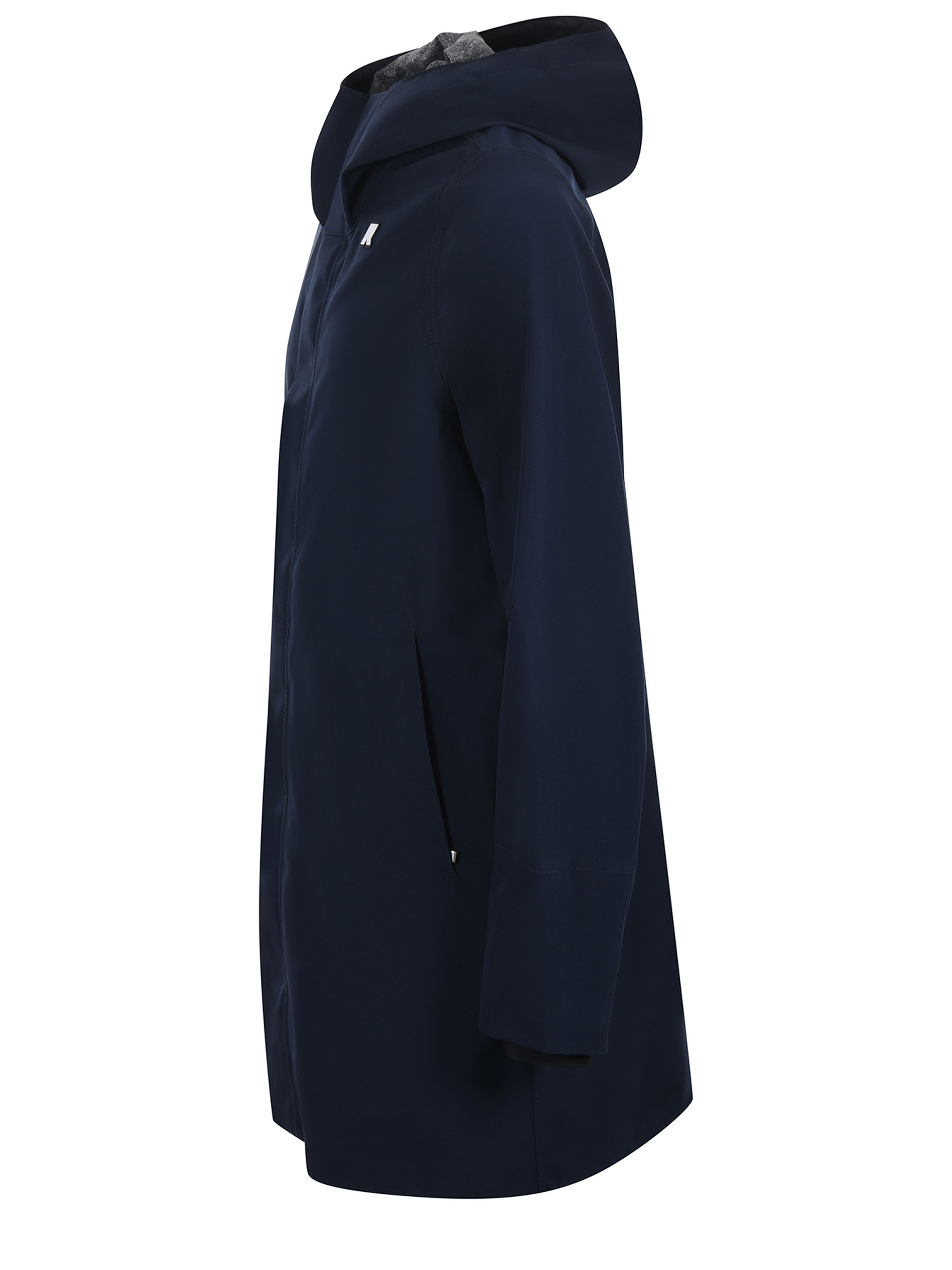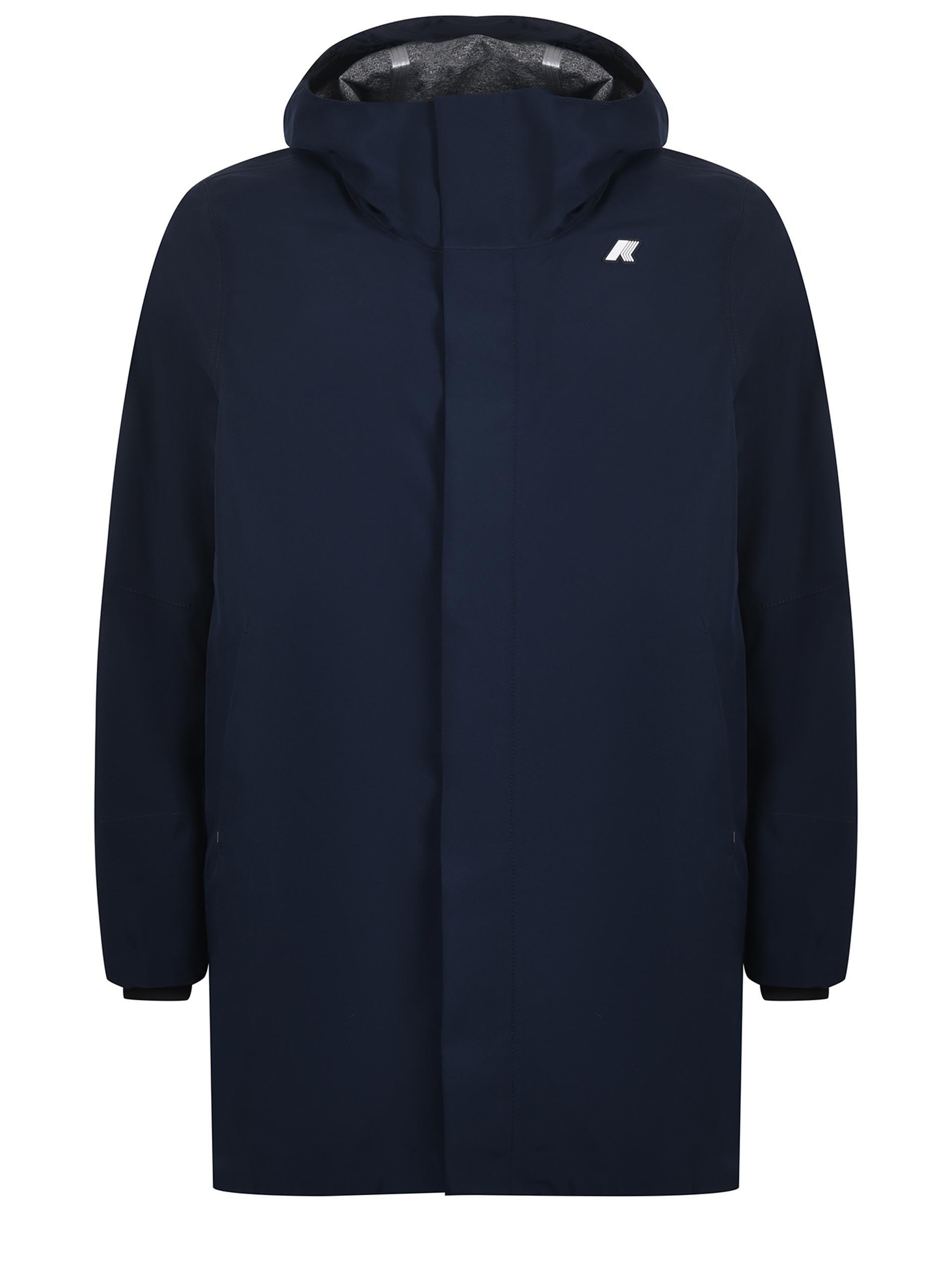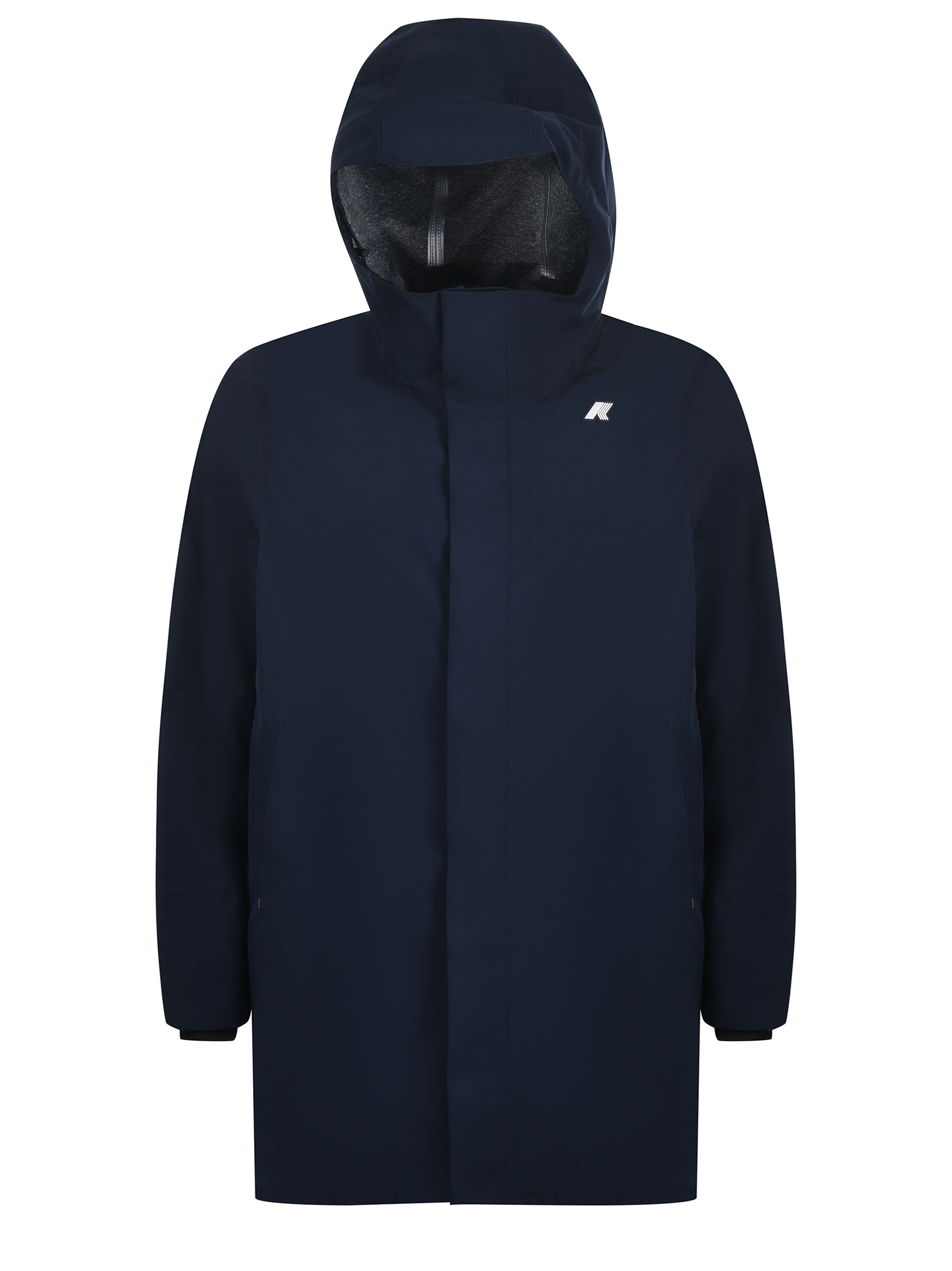 Giaccone 3/4 K-Way in tela di nylon Blu scuro. Cappuccio con coulisse. Chiusura coperta, con zip doppio cursore e bottoni a pressione. Tasche frontali con zip. Polsini in lycra. Logo frontale gommato. Sfoderato.