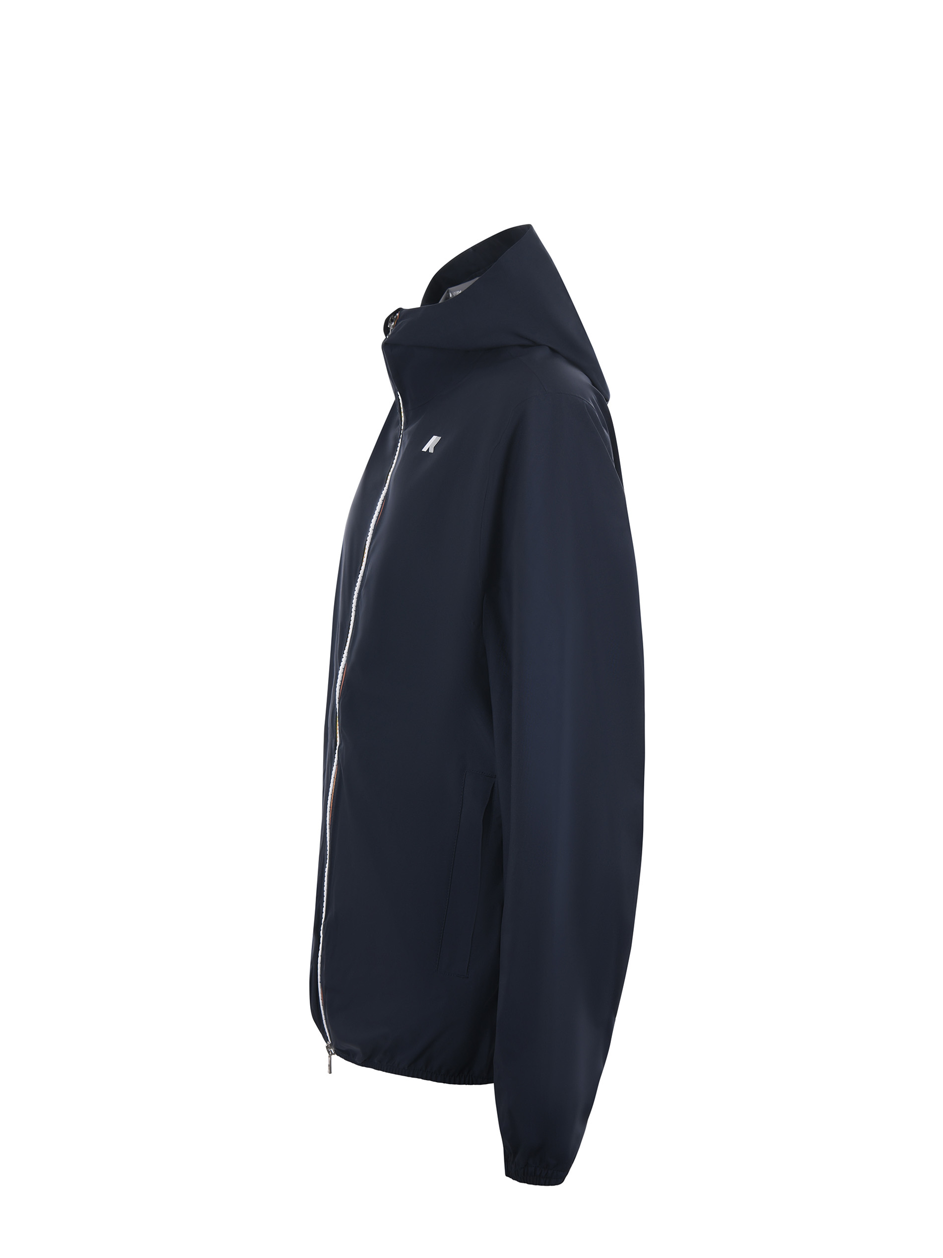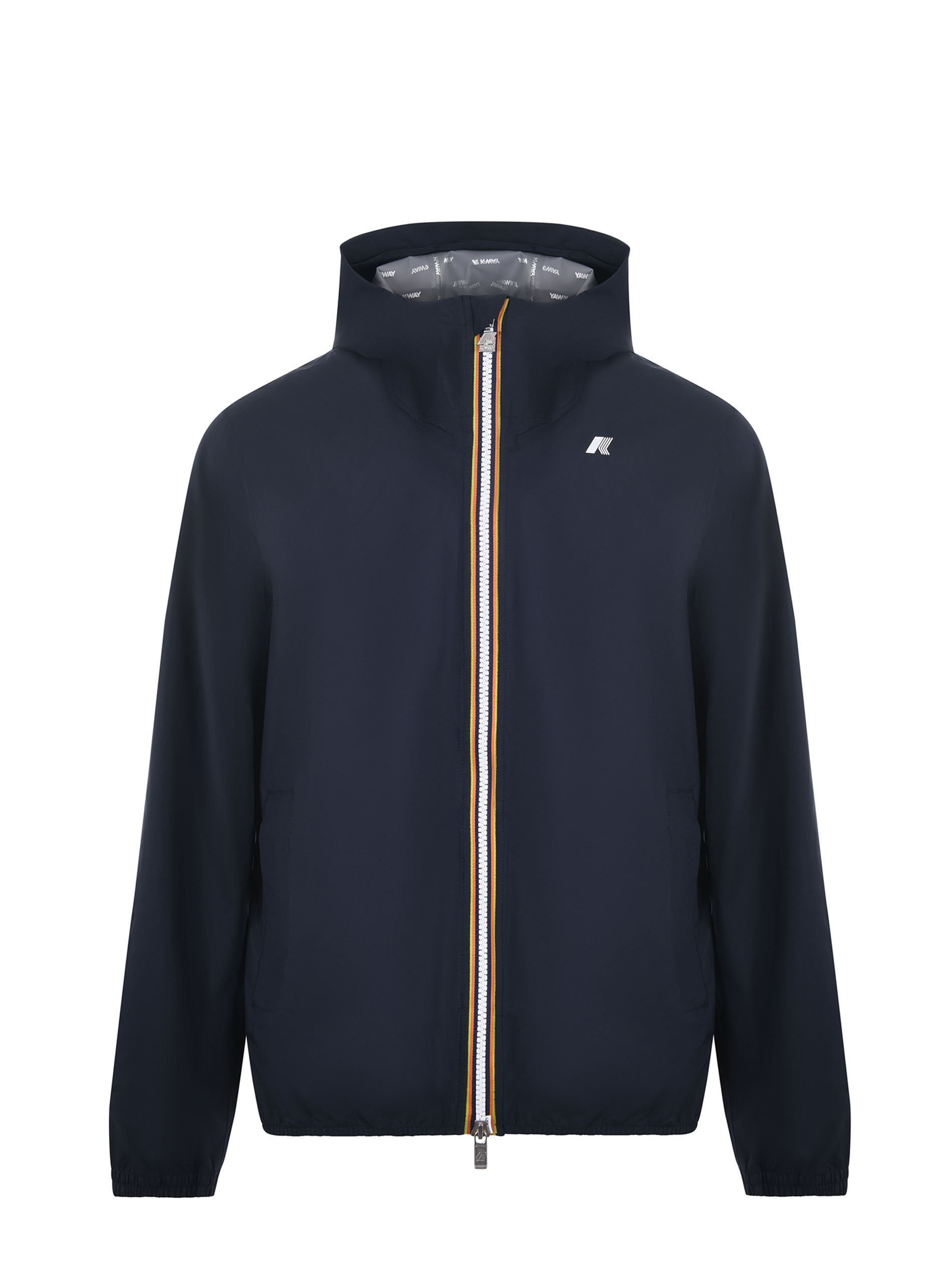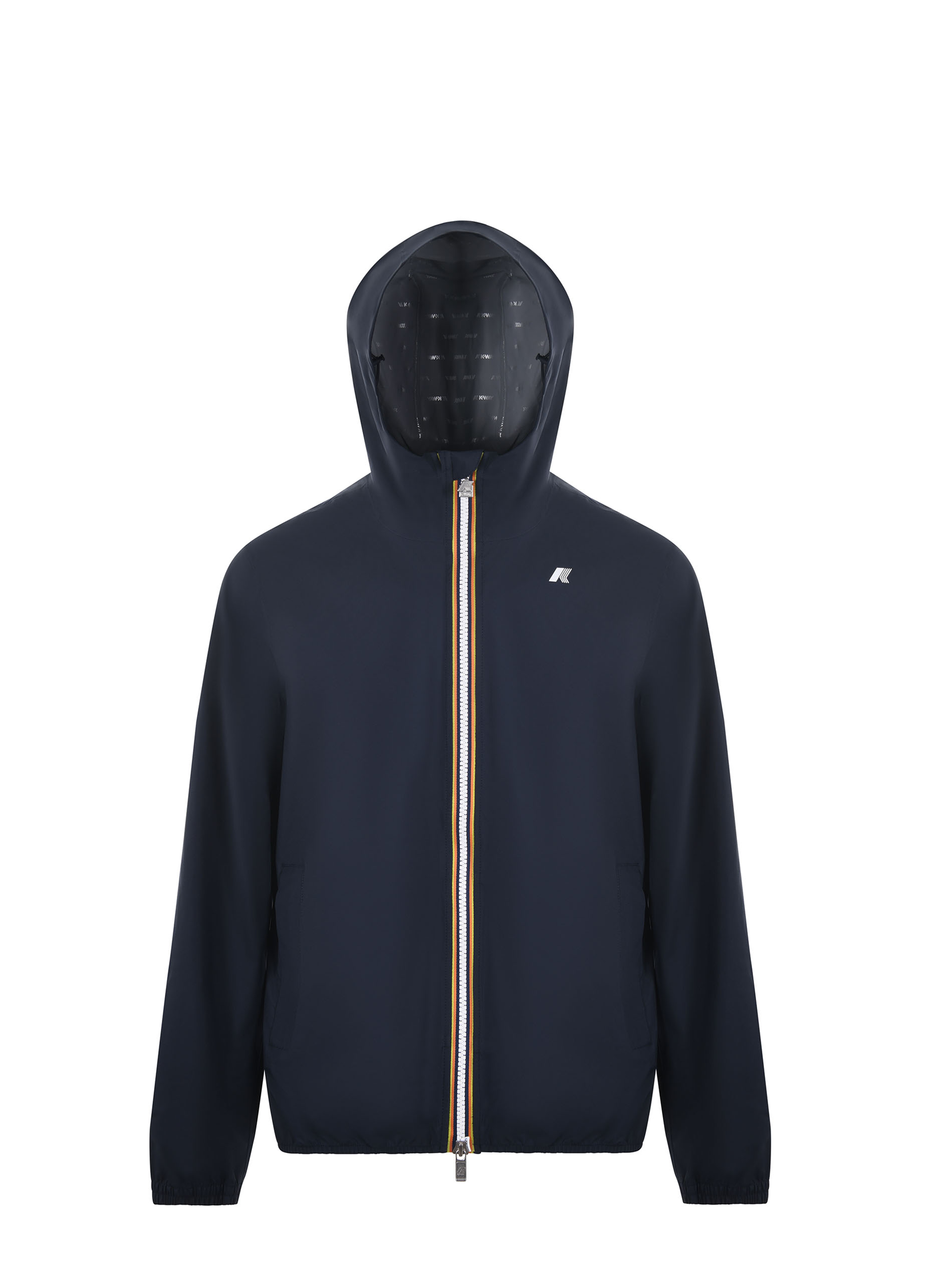 Giubbotto K-Way in tela di nylon Blu scuro. Antivento, antigoccia. Cappuccio. Chiusura con zip doppio cursore. Tasche con zip. Polsini elastici. Logo frontale gommato. Sfoderato.