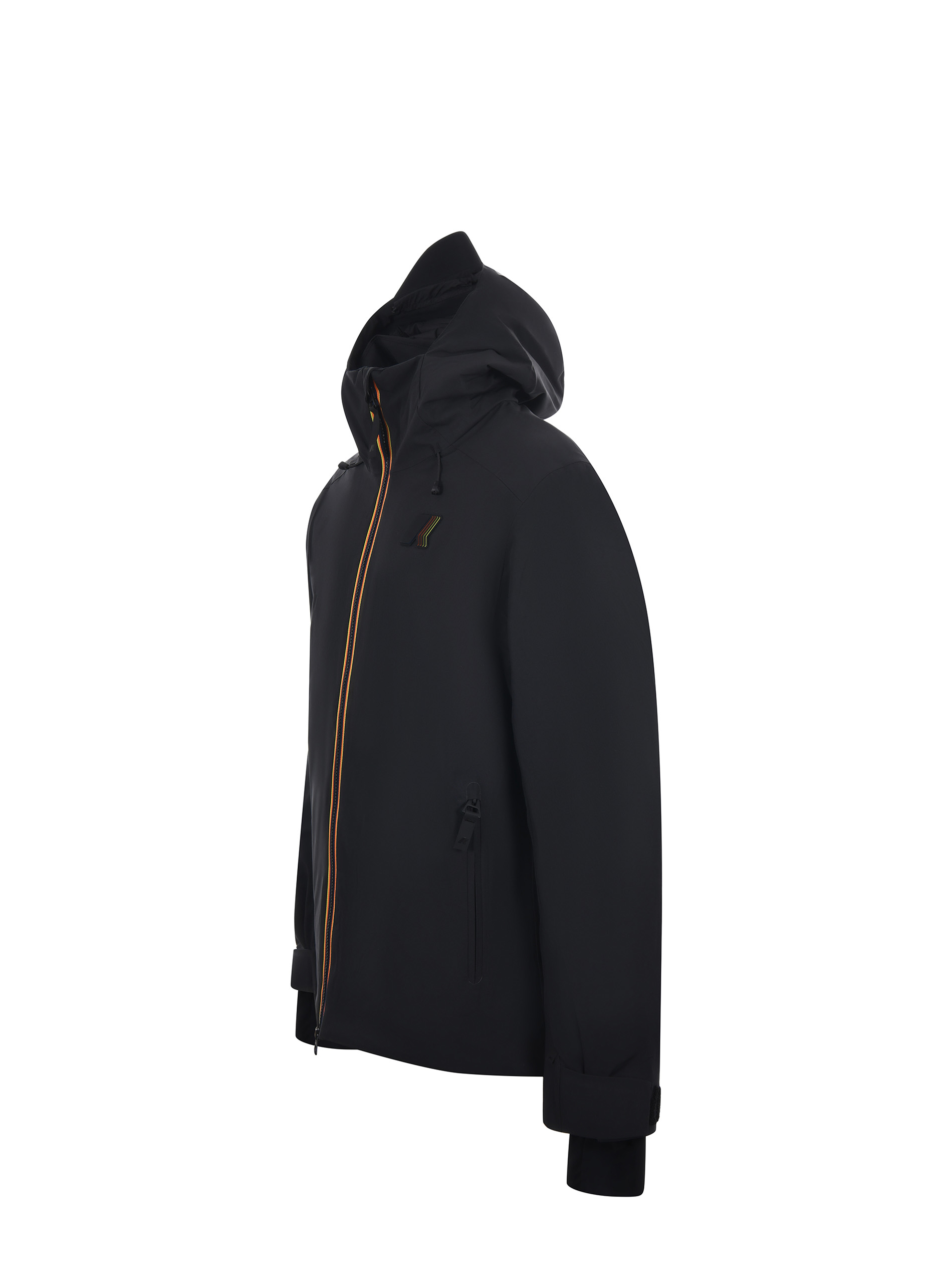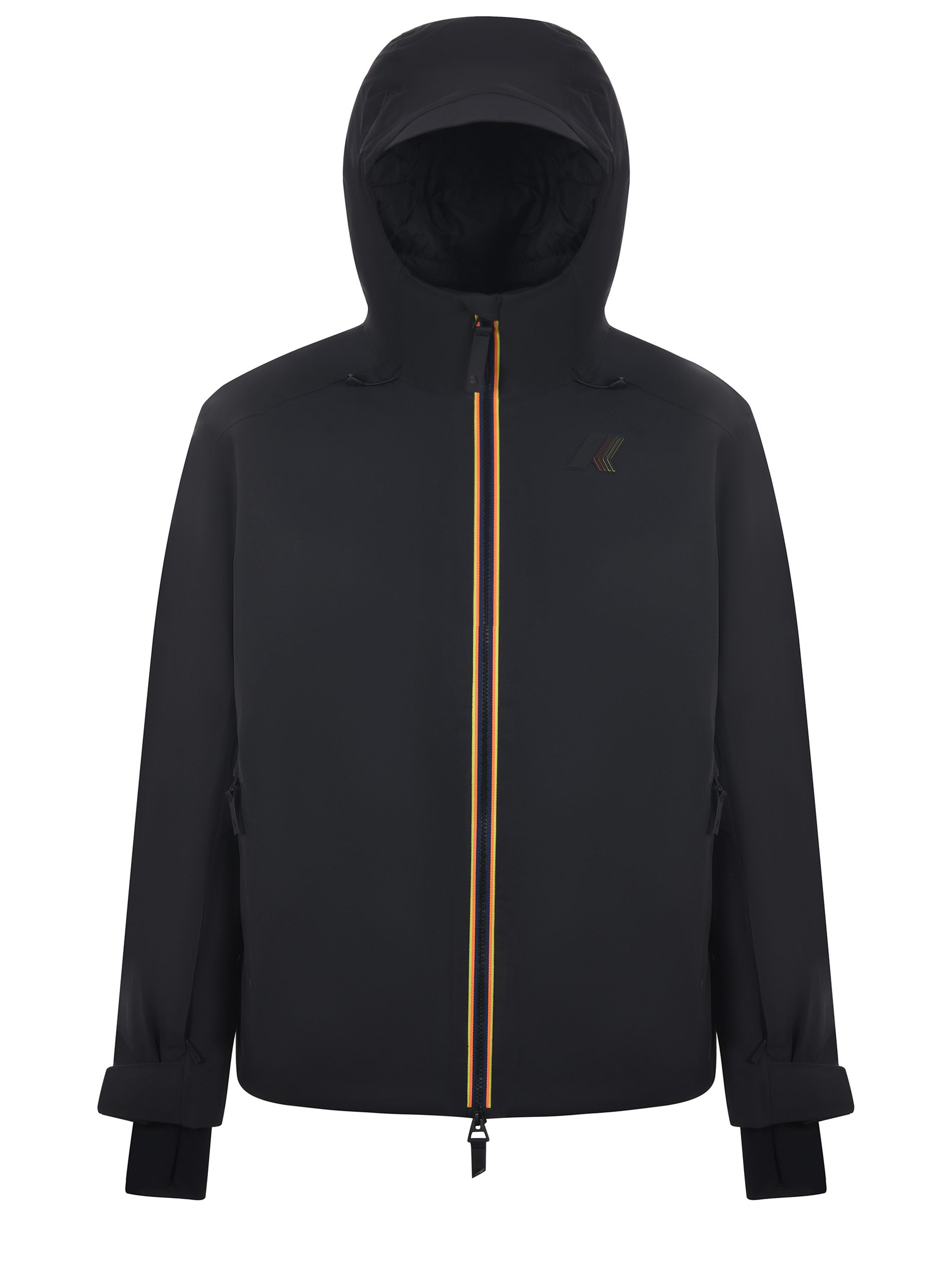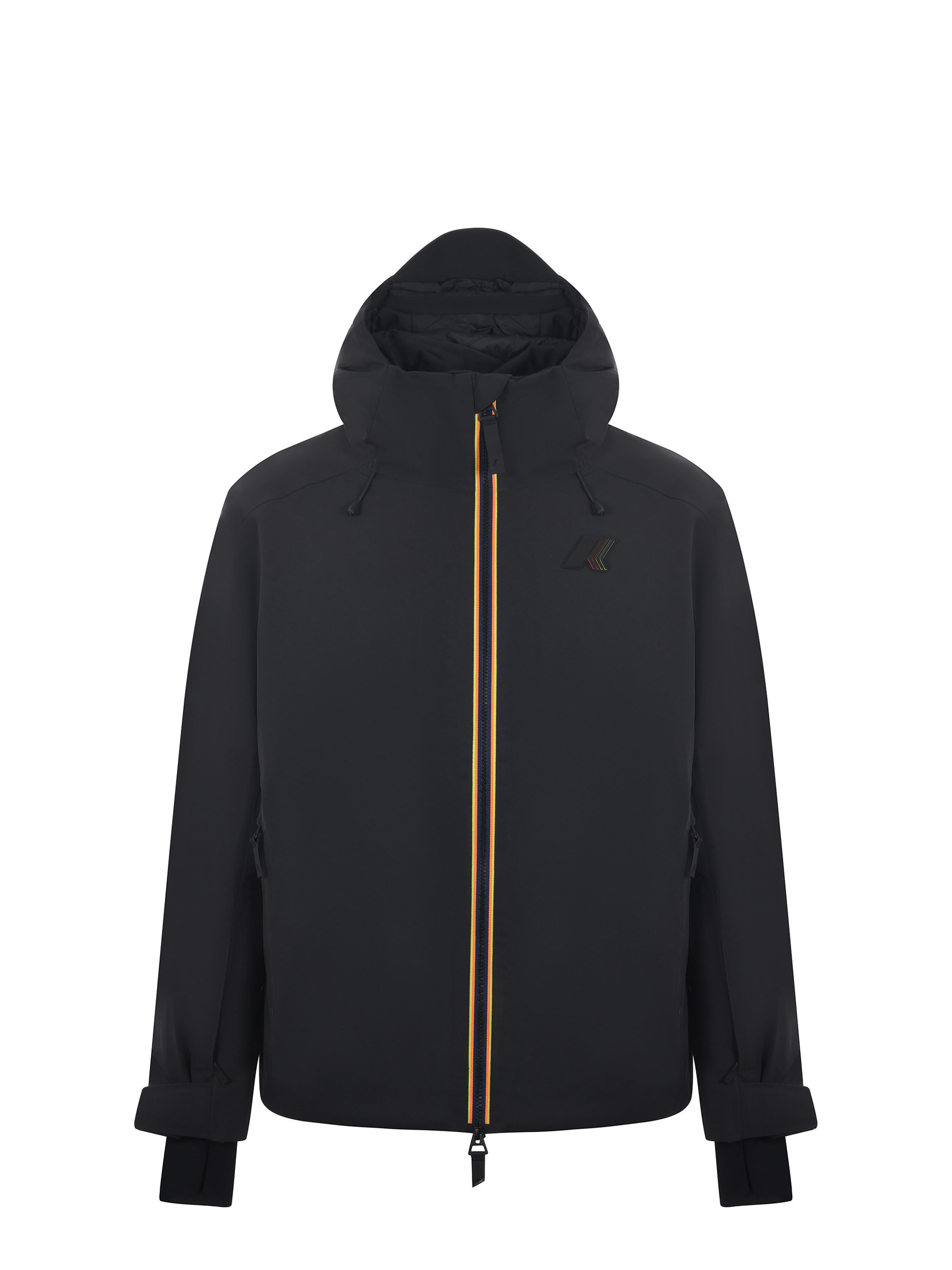 Giubbotto K-Way in tessuto tecnico Nero. Leggermente imbottito con uno strato di PrimaLoft. Chiusura con zip doppio cursore. Cappuccio. Tasche con zip. Logo gommato applicato sul petto. Polsini in lycra. Tasca sulla manica. Polsi regolabili. Coulisse al fondo.