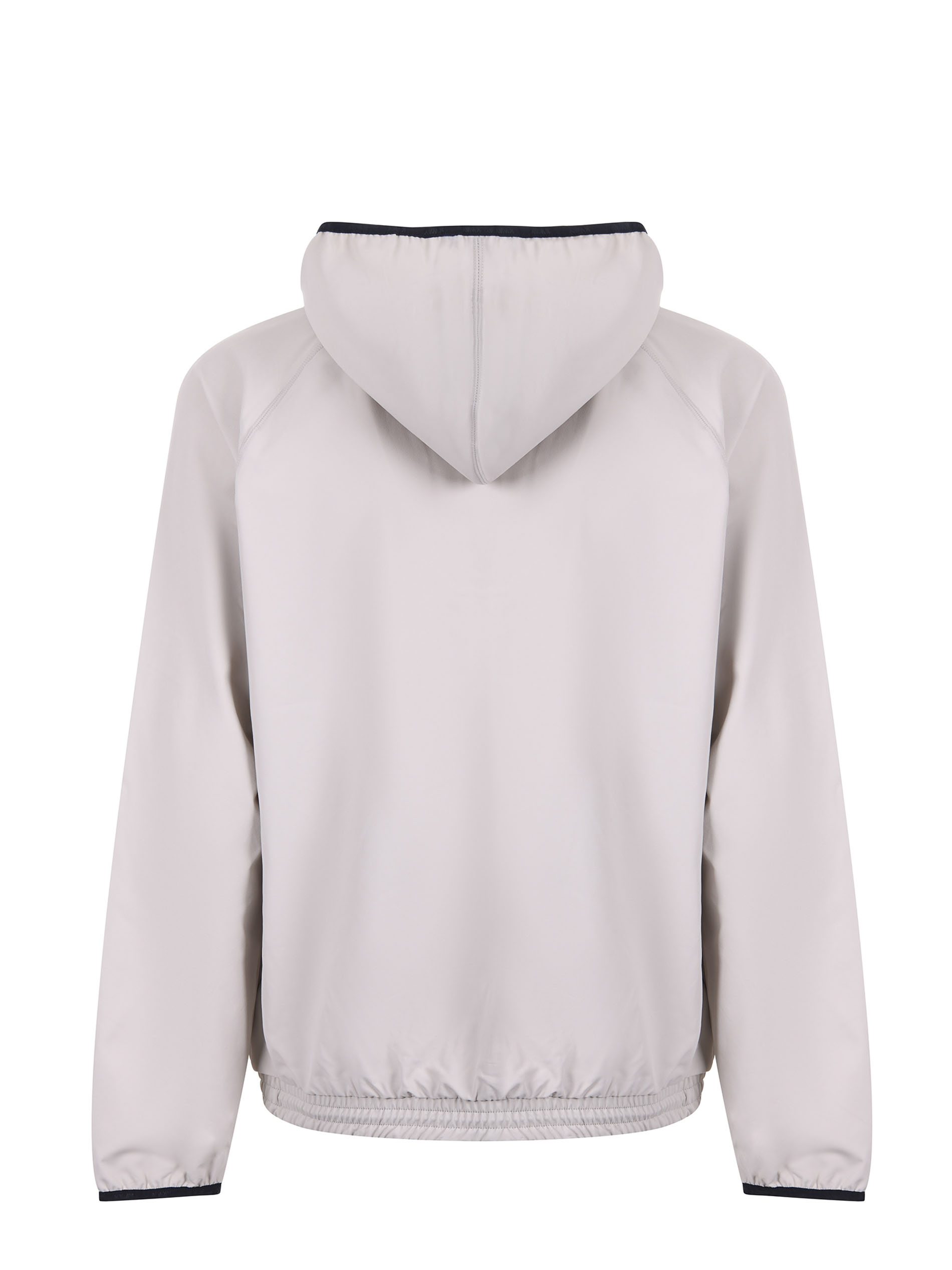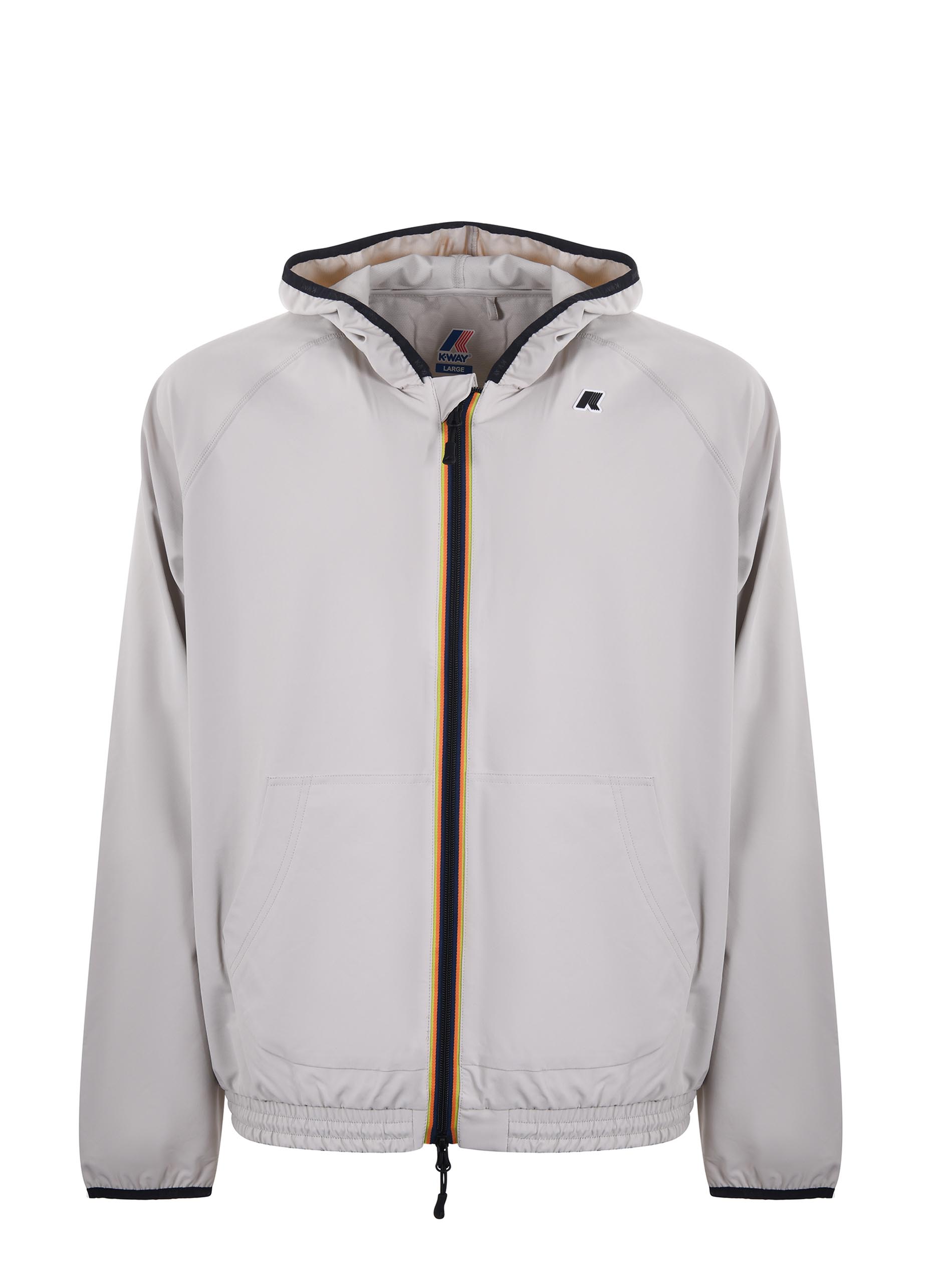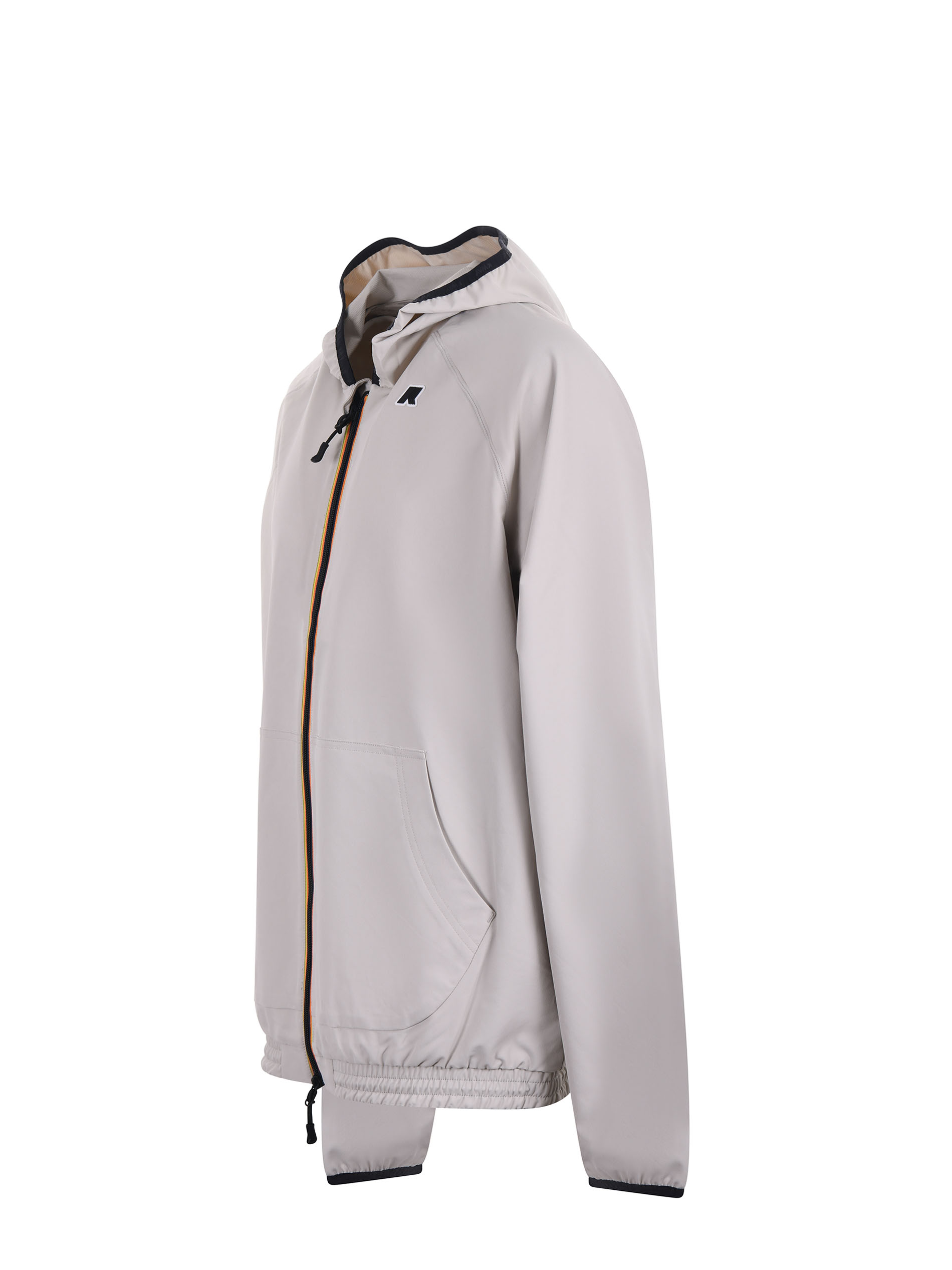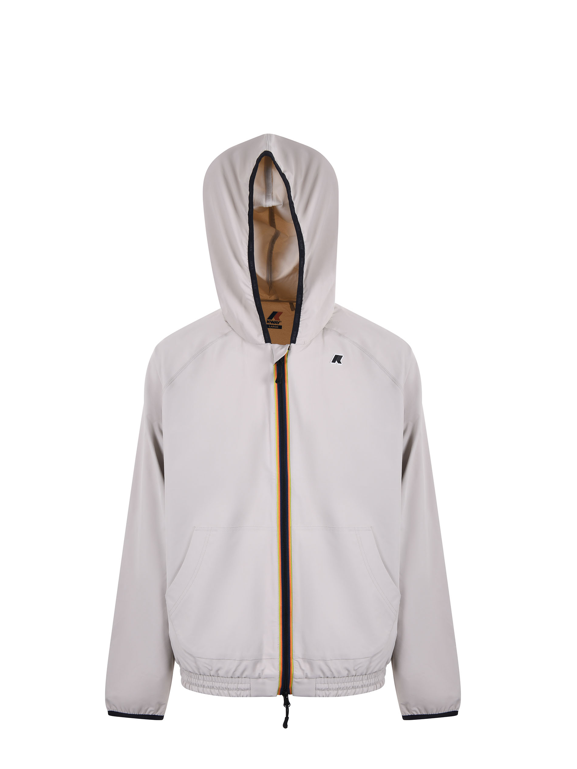 Giubbotto K-Way in jersey stretch Tortora. Cappuccio con bordino nero. Chiusura con zip doppio cursore. Tasche a marsupio. Polsini elastici. Logo frontale gommato. Sfoderato.