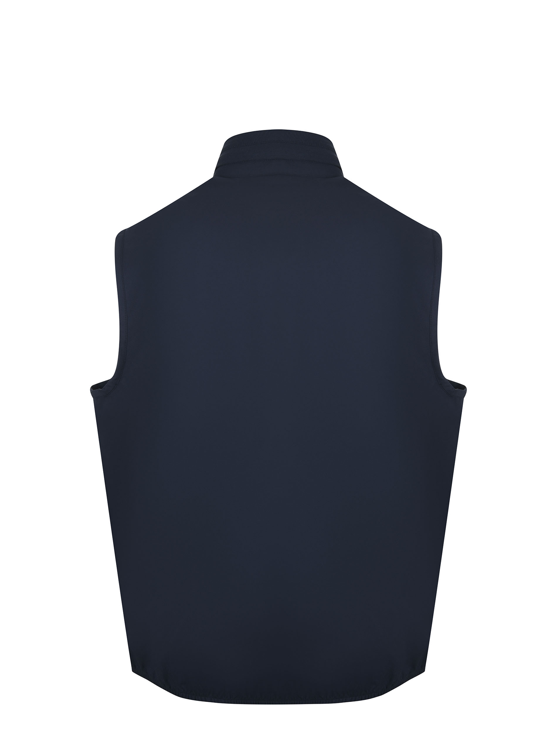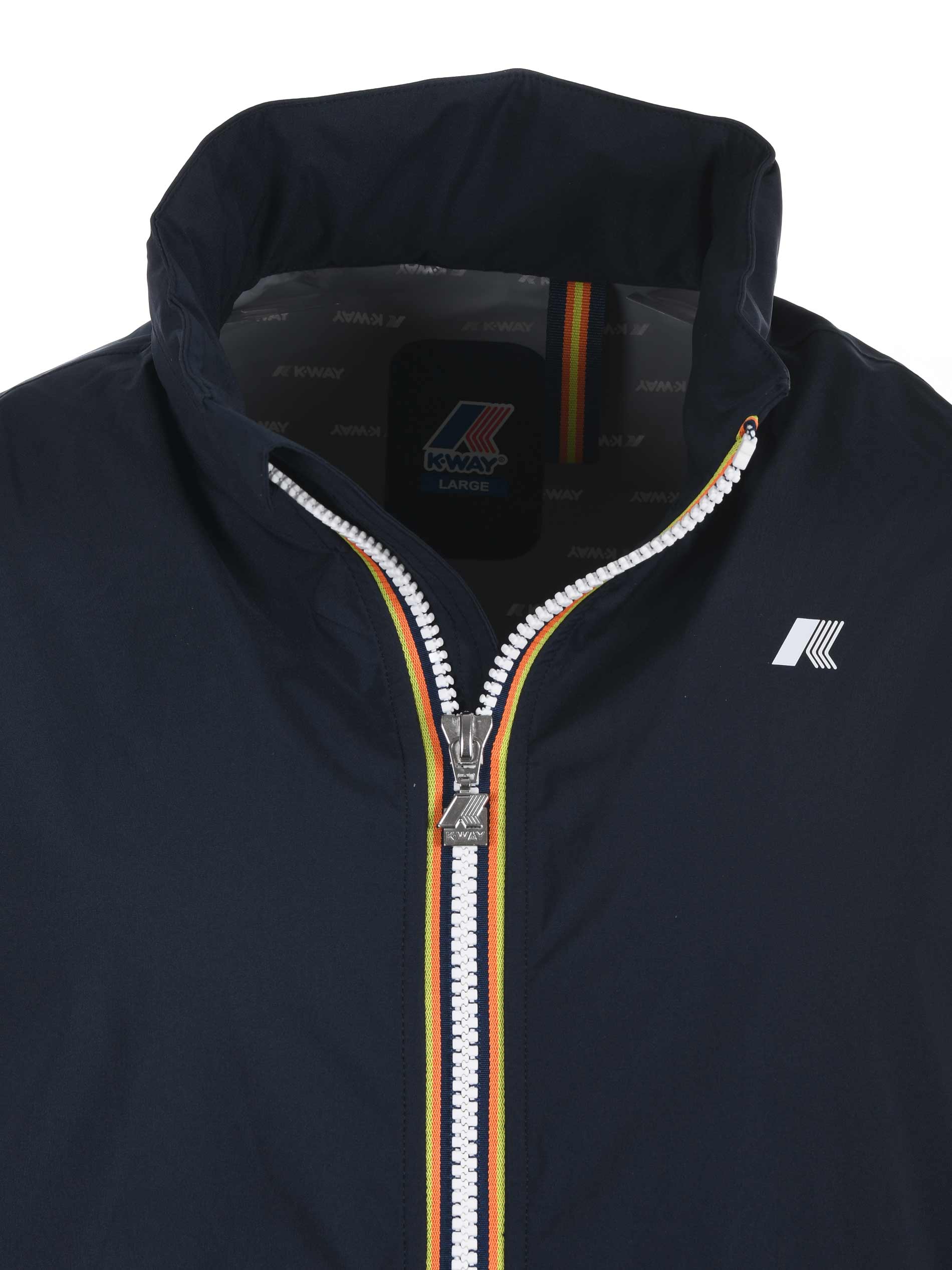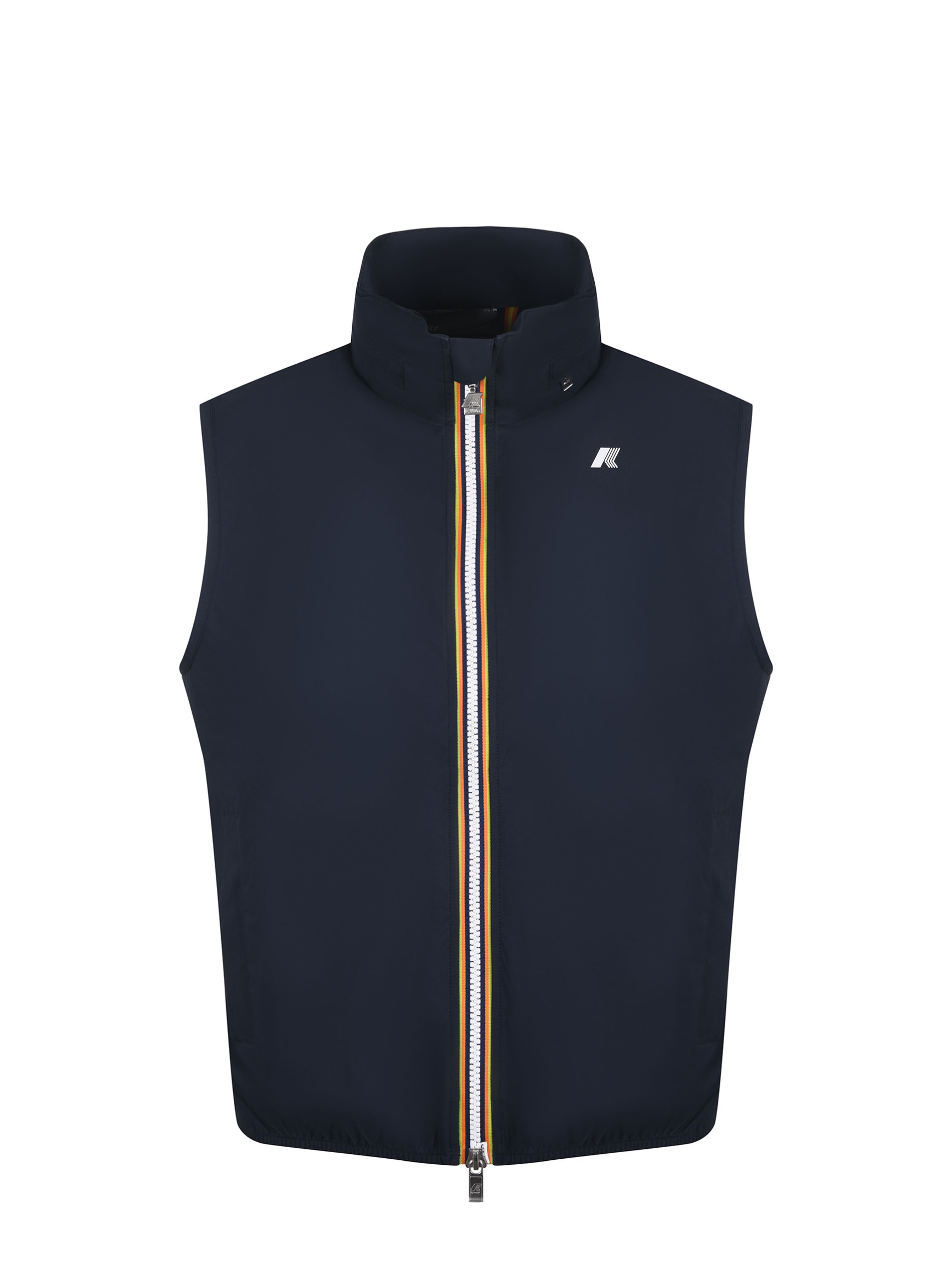 Giubbotto smanicato K-Way in nylon stretch Blu scuro. Impermeabile. Idrorepellente. Antivento. Non imbottito. Non foderato. Collo alto. Cappuccio estraibile. Chiusura con zip doppio cursore. 2 tasche con zip. Logo frontale. Interno logato.