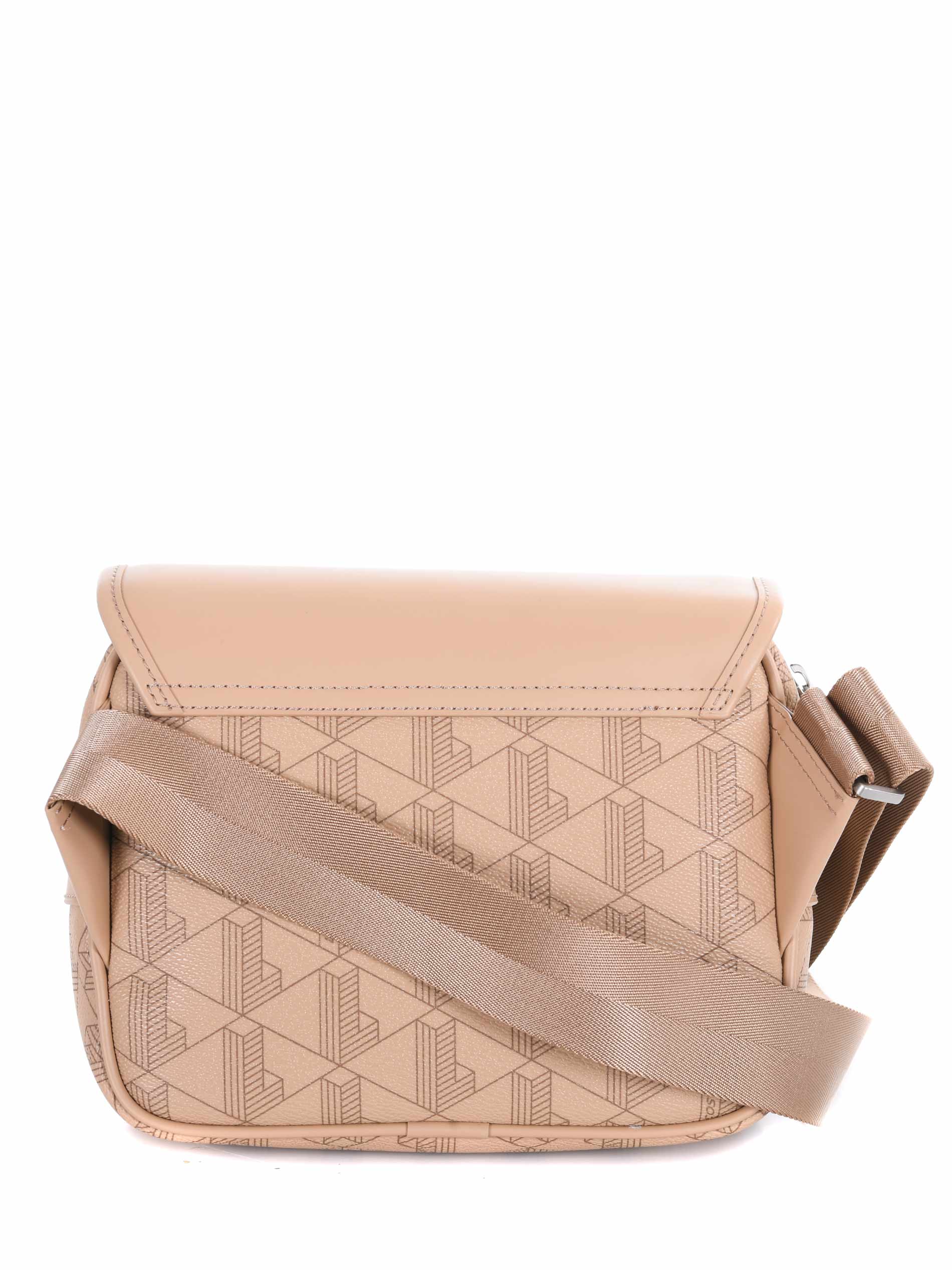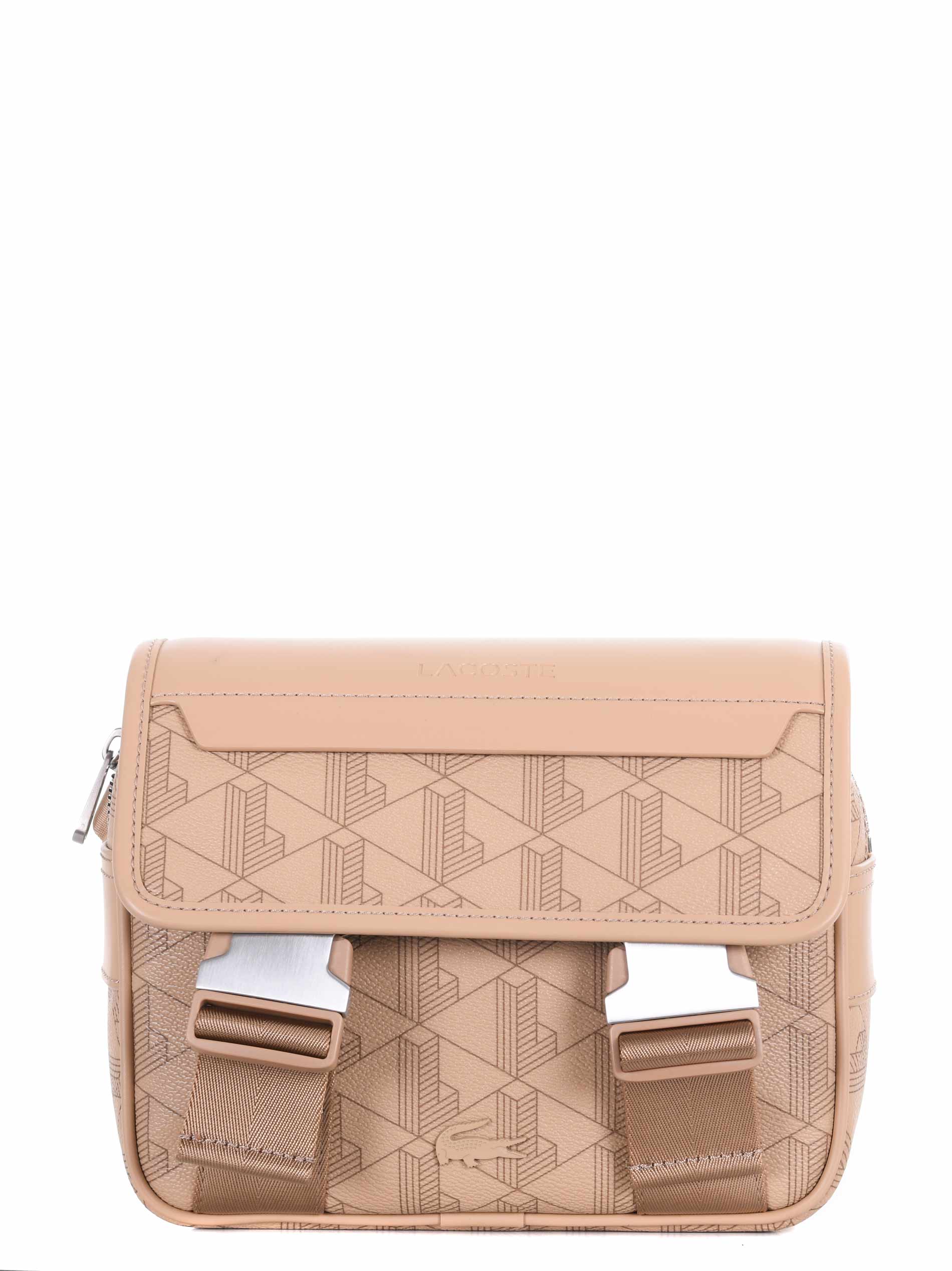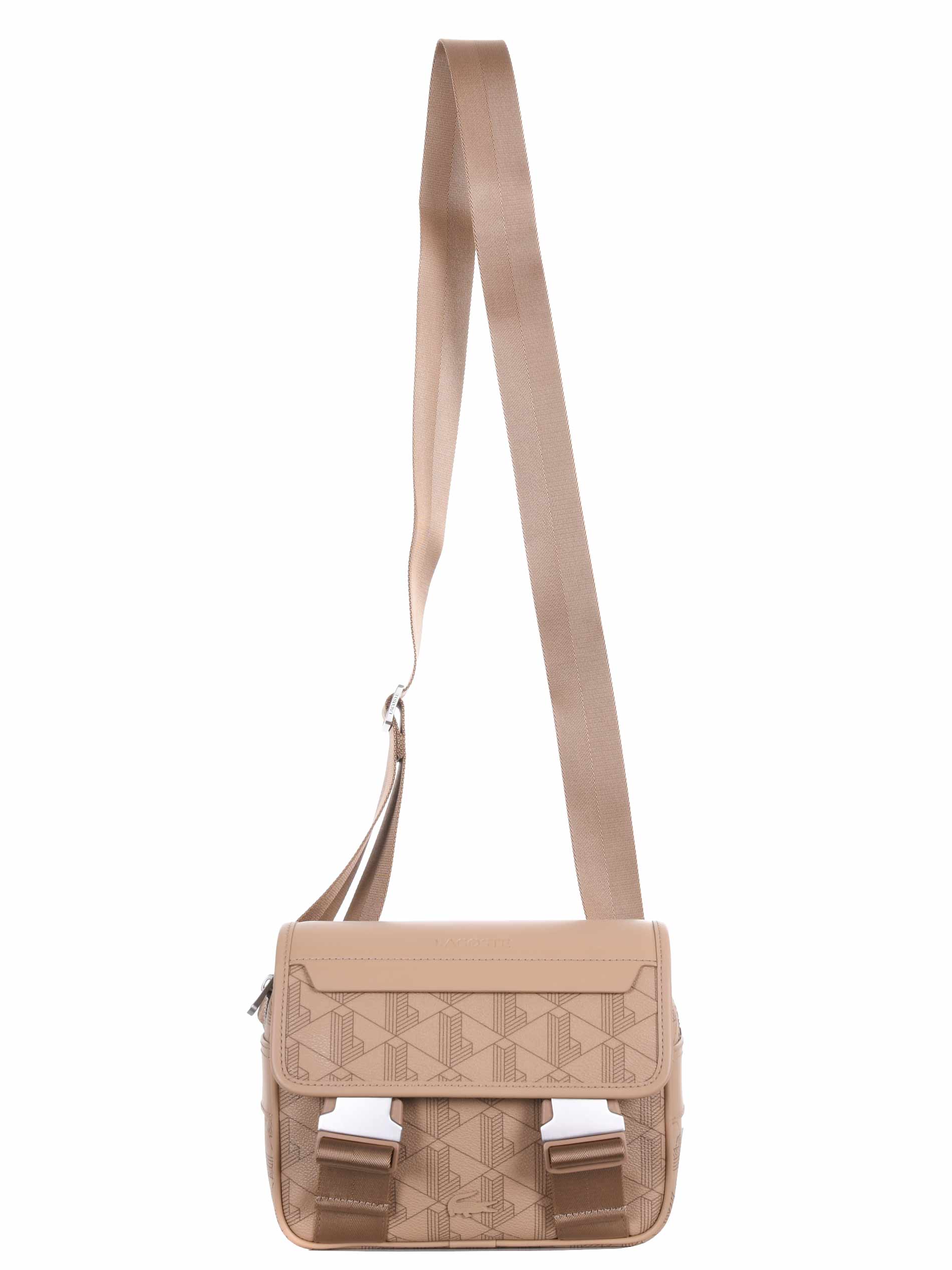 Borsa a tracolla Lacoste in ecopelle Beige stampa monogram. Tracolla in webbing regolabile. Patta frontale con doppia fibbia. Tasca interna. Chiusura interna con zip. Logo impresso davanti.