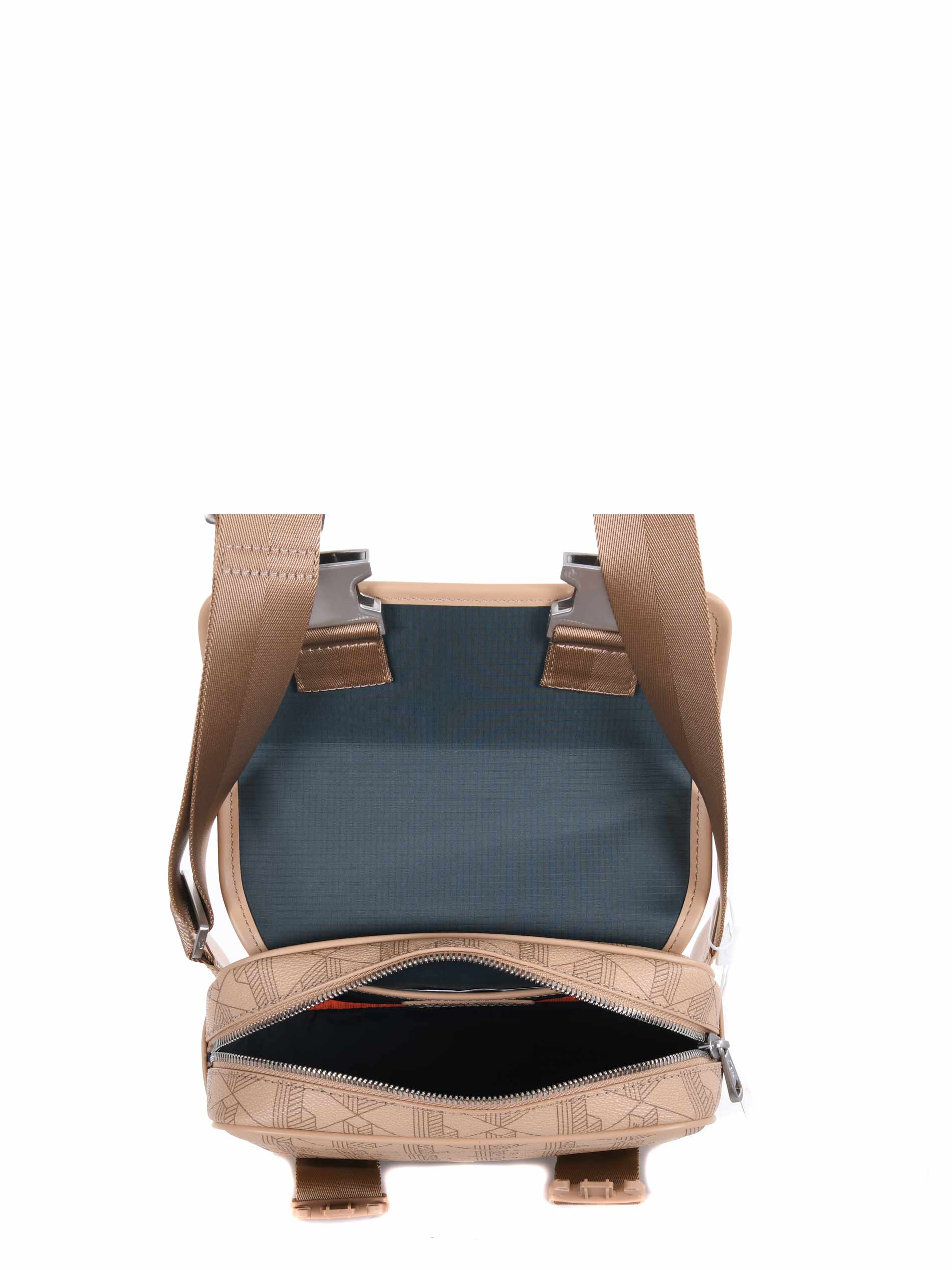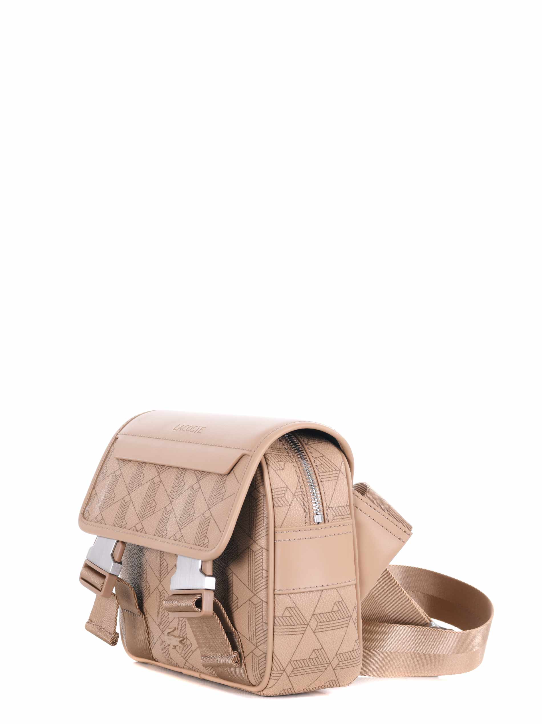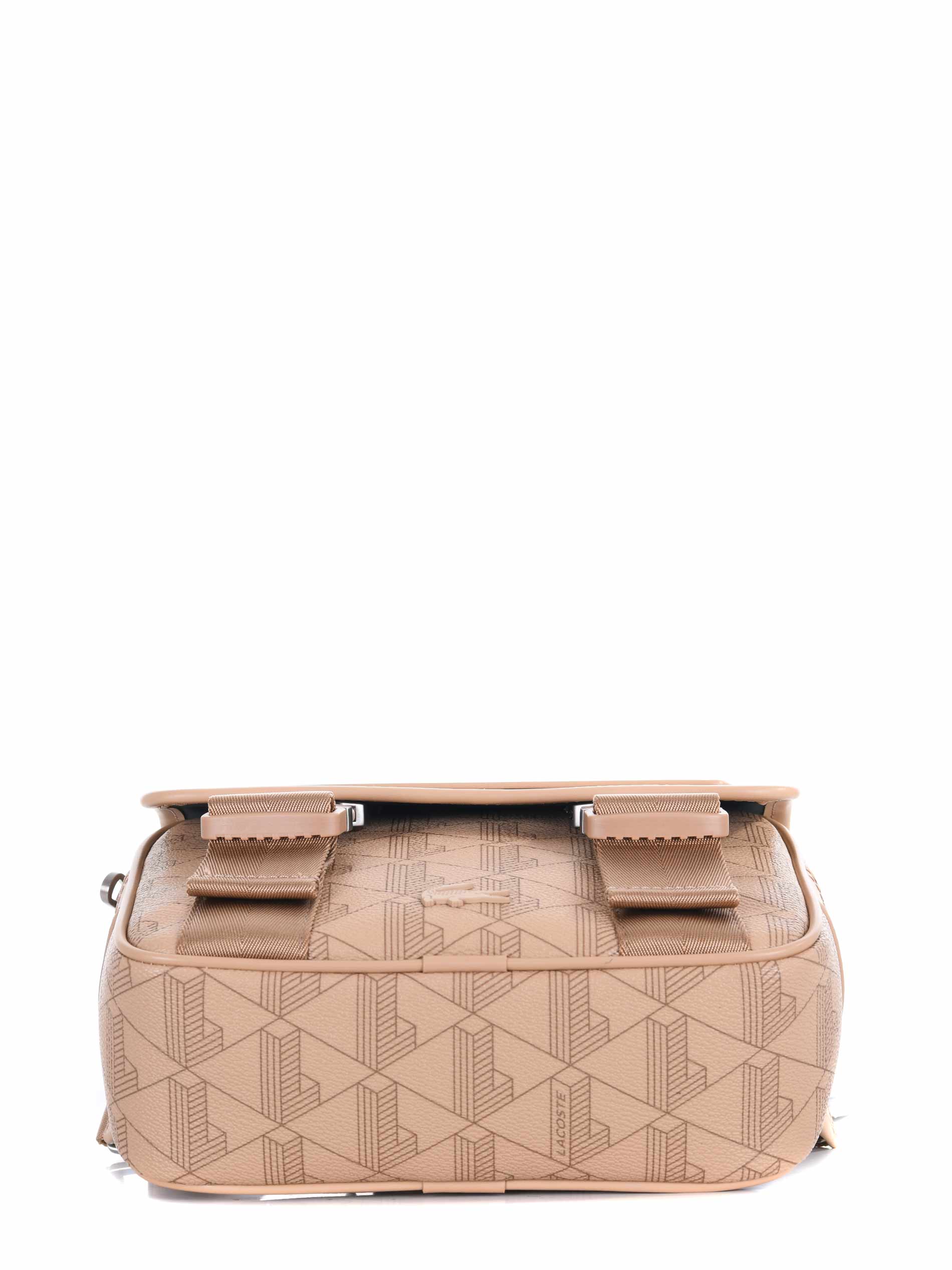 Borsa a tracolla Lacoste in ecopelle Beige stampa monogram. Tracolla in webbing regolabile. Patta frontale con doppia fibbia. Tasca interna. Chiusura interna con zip. Logo impresso davanti.