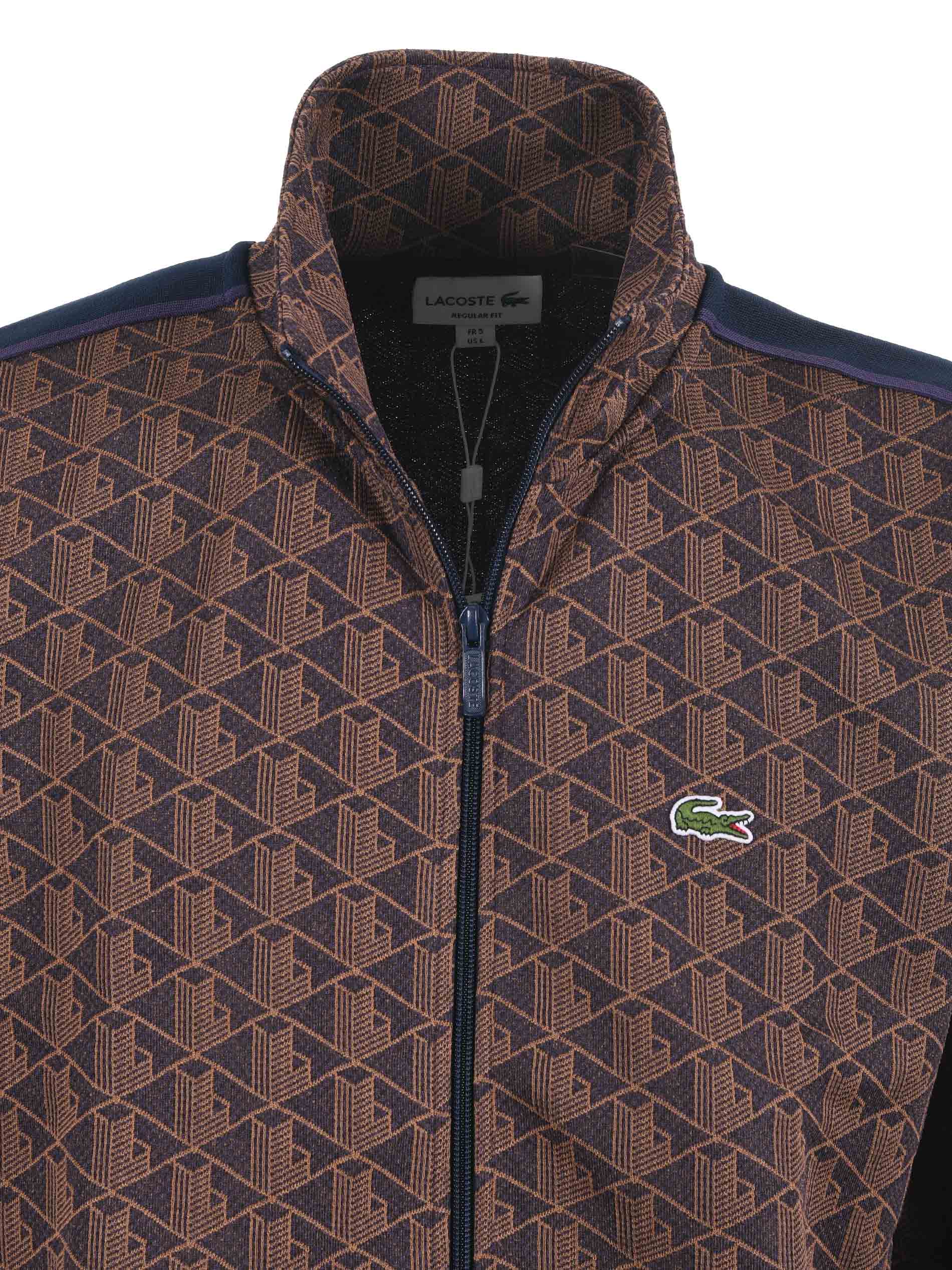 Felpa Lacoste in cotone jacquard color Caramello trama monogram. Bande tricolore lungo le maniche. Collo alto. Tasche a filo. Polsi e fondo a costine marrone. Chiusura con zip. Logo frontale. Interno garzato.