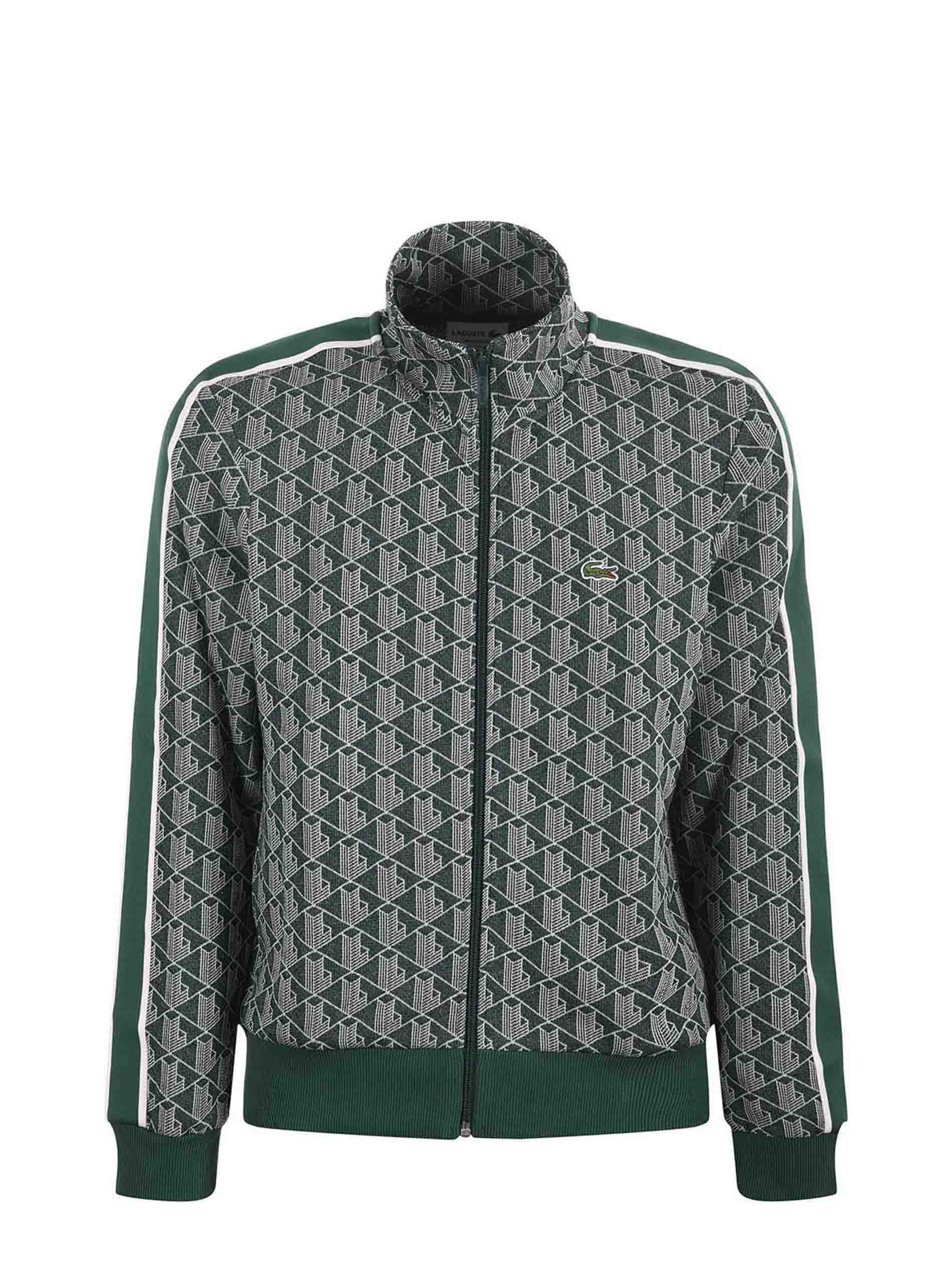 Felpa Lacoste in cotone jacquard Verde scuro trama monogram. Bande tricolore lungo le maniche. Collo alto. Tasche a filo. Polsi e fondo a costine. Chiusura con zip. Logo frontale. Interno garzato.