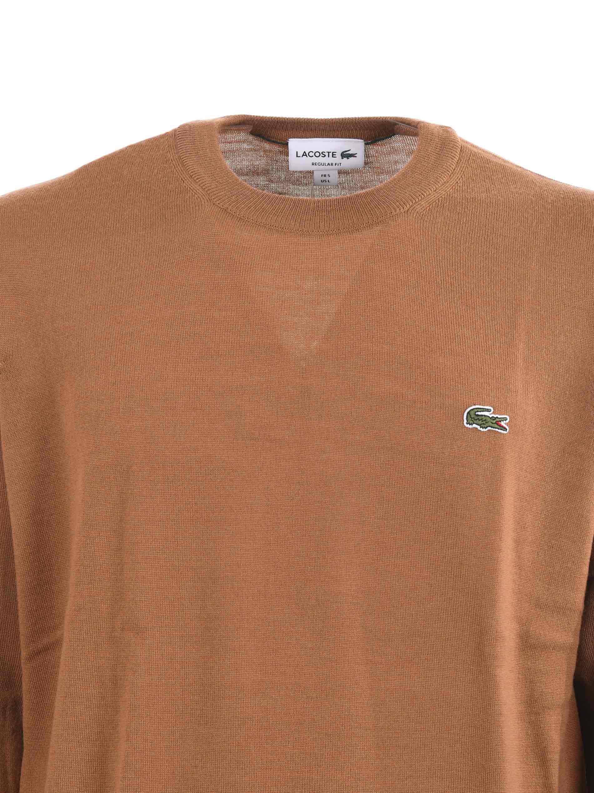 Maglia Lacoste in misto lana color Cammello. Girocollo a costine. Manica lunga. Polsi e fondo a costine. Logo frontale. Regular fit.