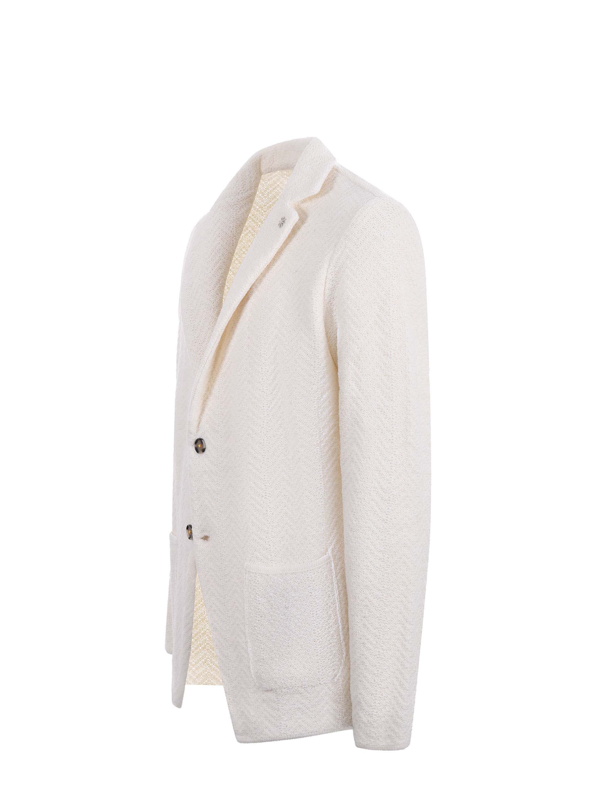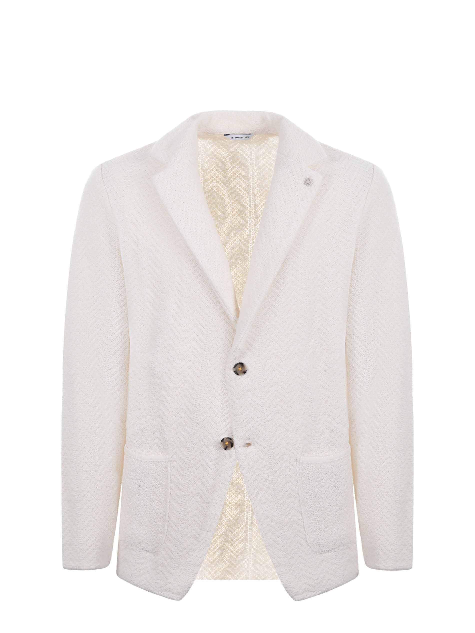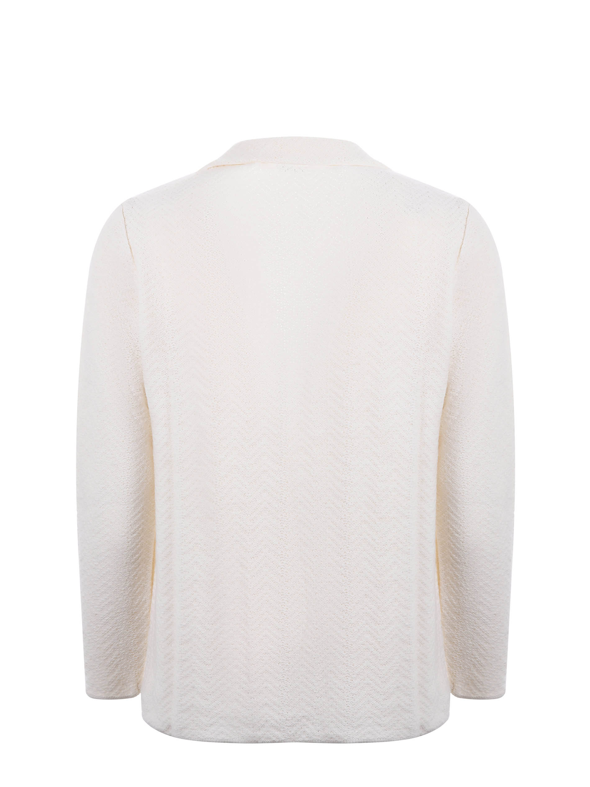 Giacca/cardigan Manuel Ritz in filato di misto lana a trama spigata Panna. Rever classico. Spilla iconica. Tasche a toppa. Chiuaura con 2 bottoni. Sfoderata.