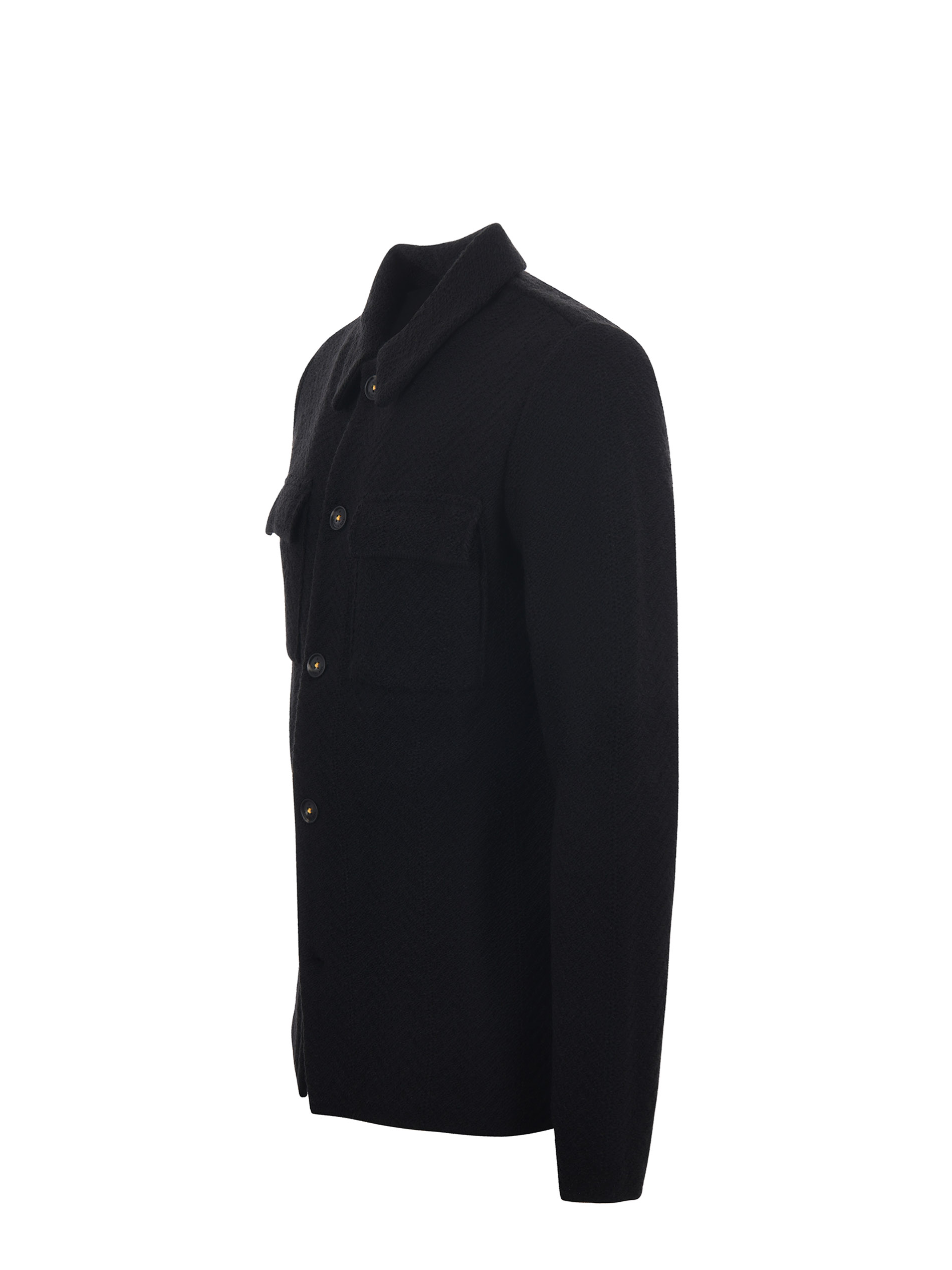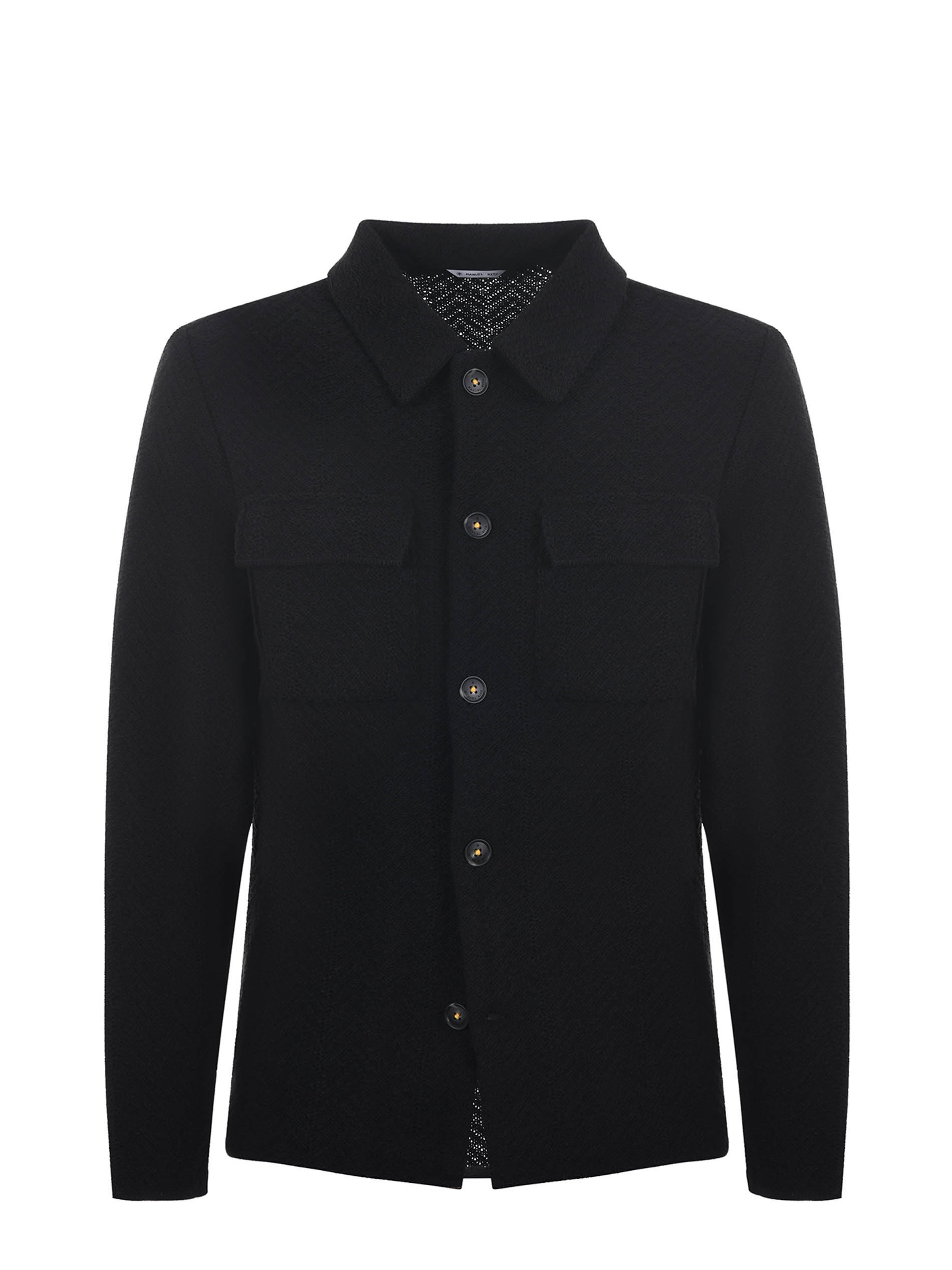 Giacca/cardigan Manuel Ritz in filato di misto lana a trama lavorata Nera. Colletto classico. Spilla iconica. Tasche alte con pattina. Chiusura con bottoni. Sfoderata.