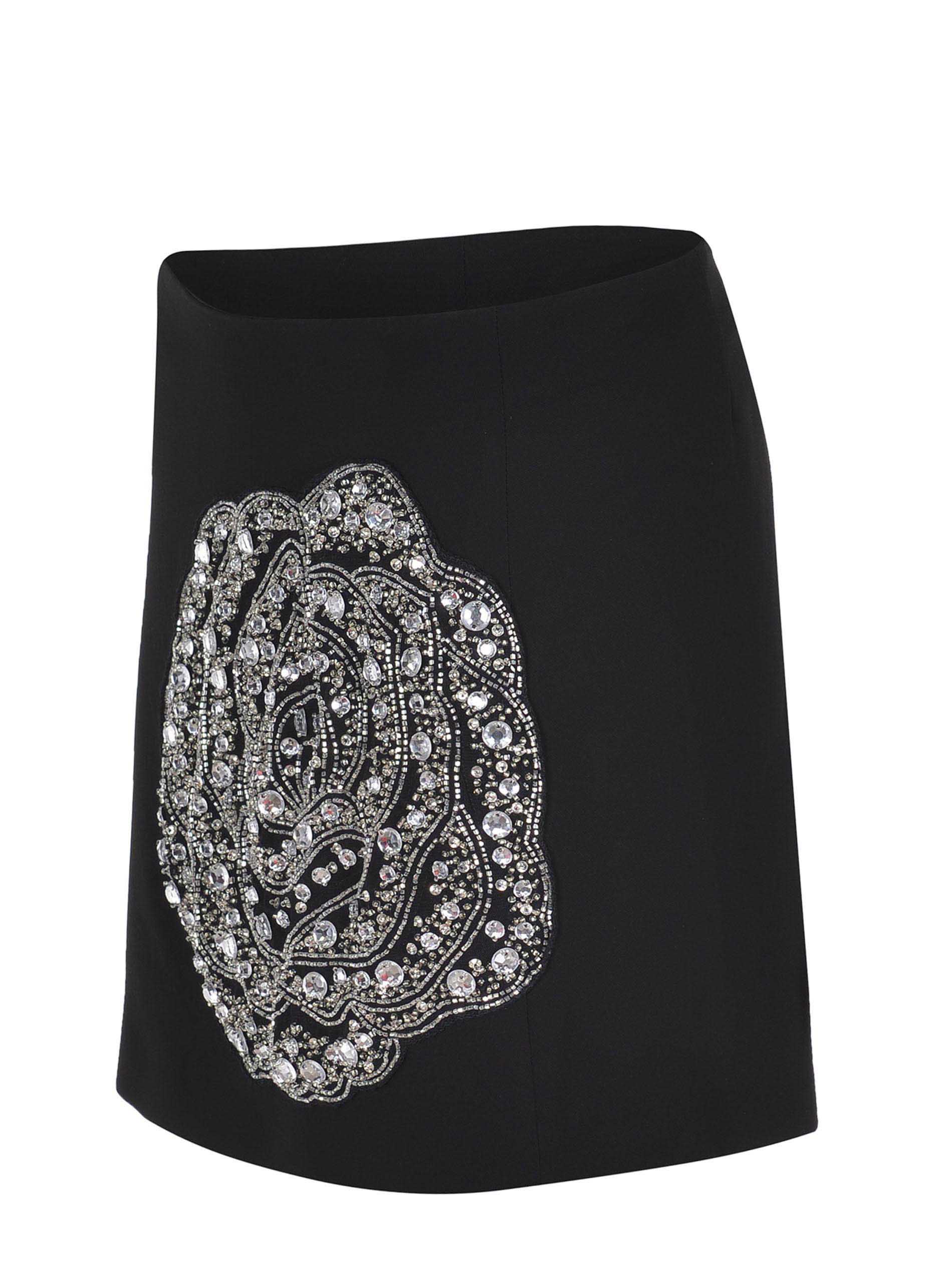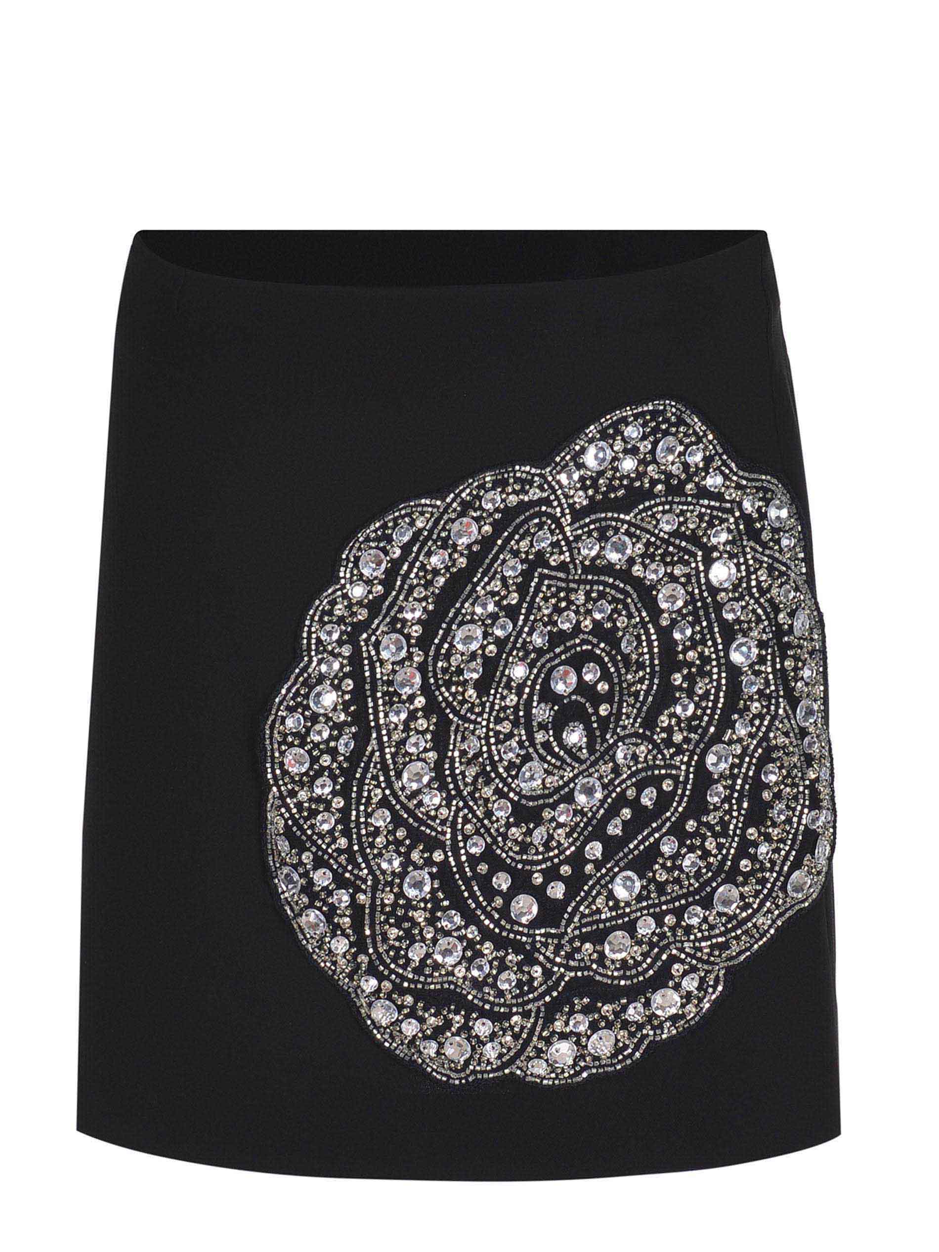 Dettaglio maxi fiore in strass ricamato sul lato.
