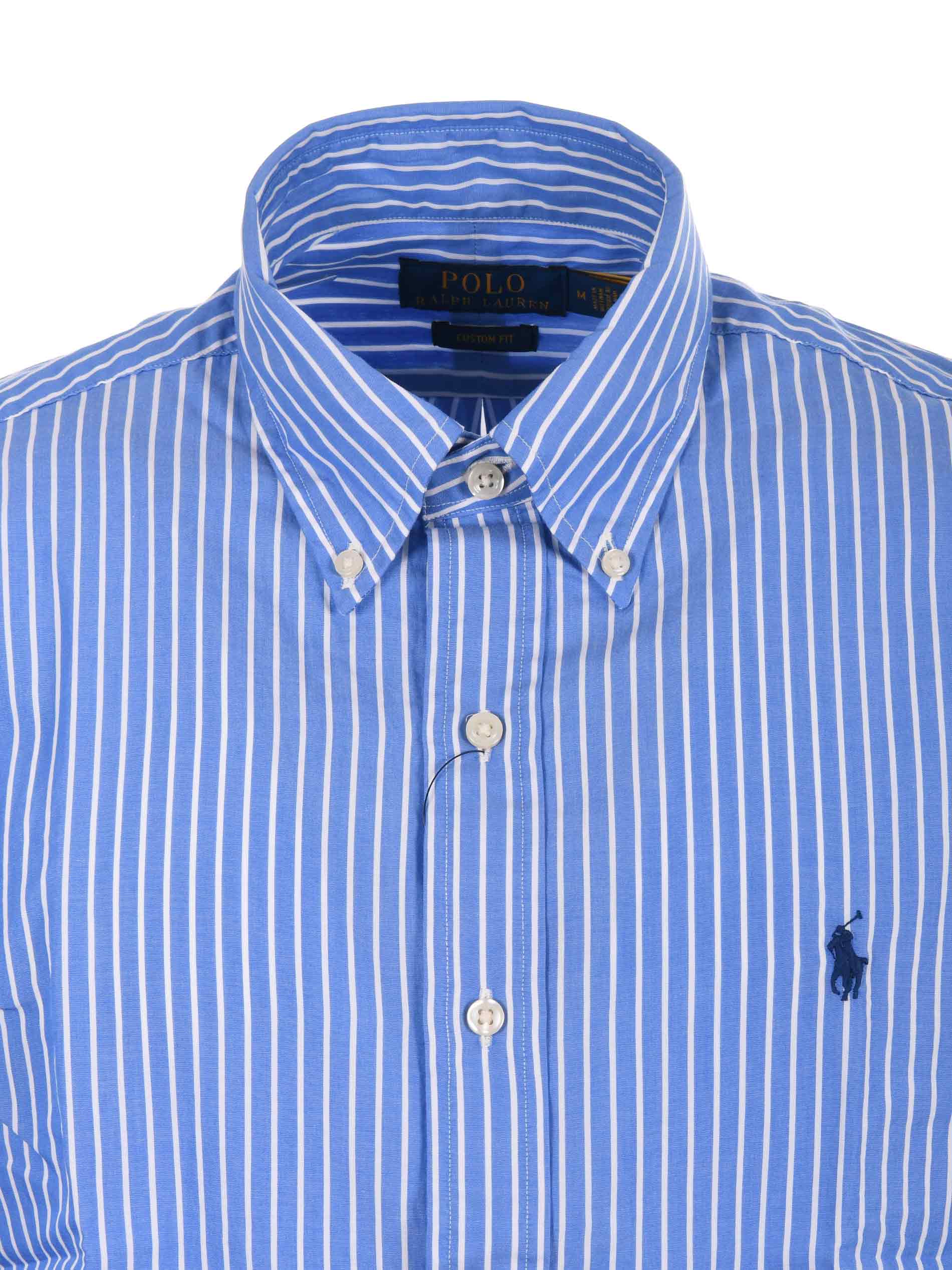 Camicia Polo Ralph Lauren in cotone Blu/Bianco a righe verticali. Colletto button down. Manica lunga. Polsi con bottone. Chiusura con bottoni. Logo frontale ricamato. Cannoncino sul retro. Custom fit.