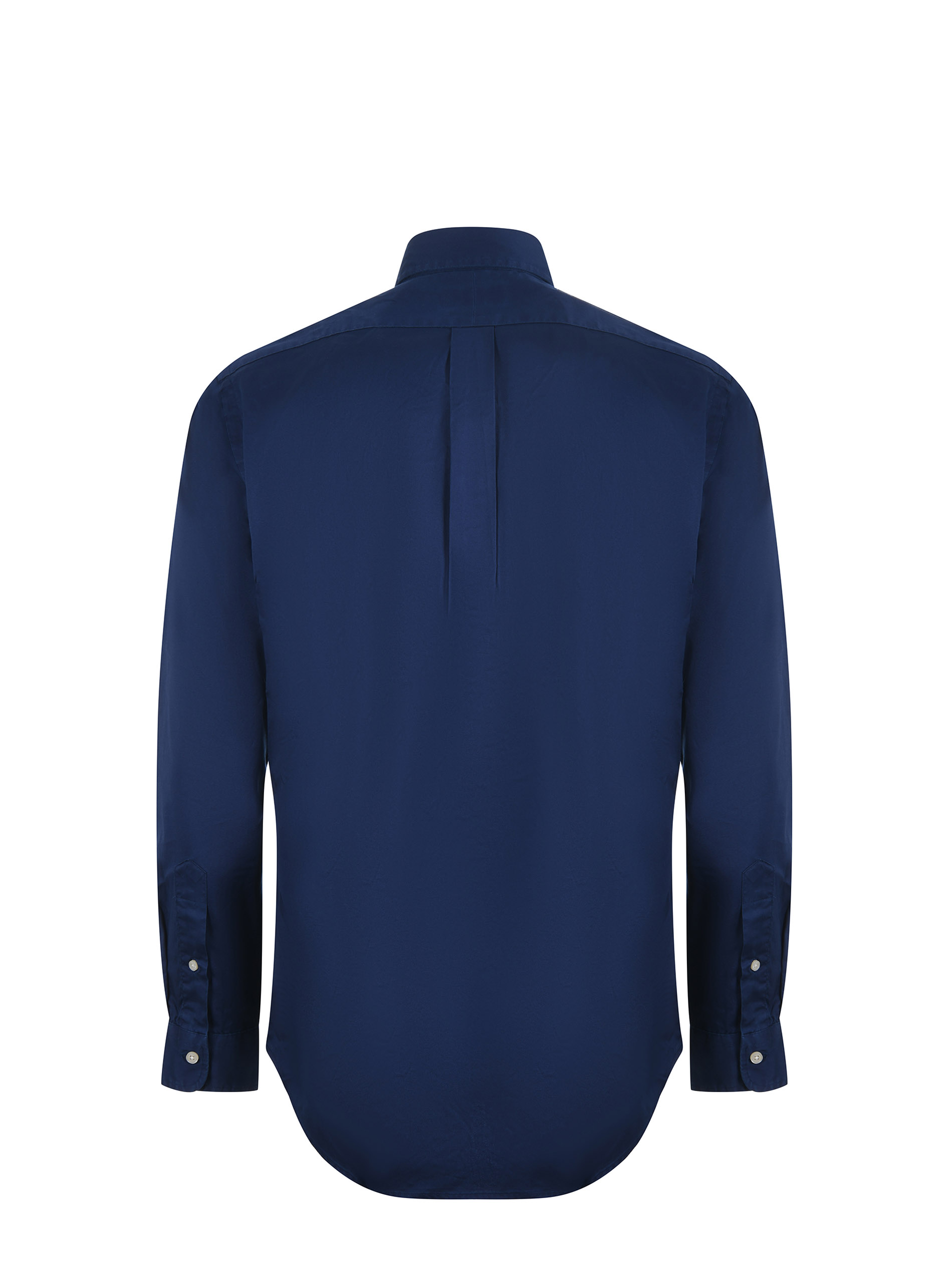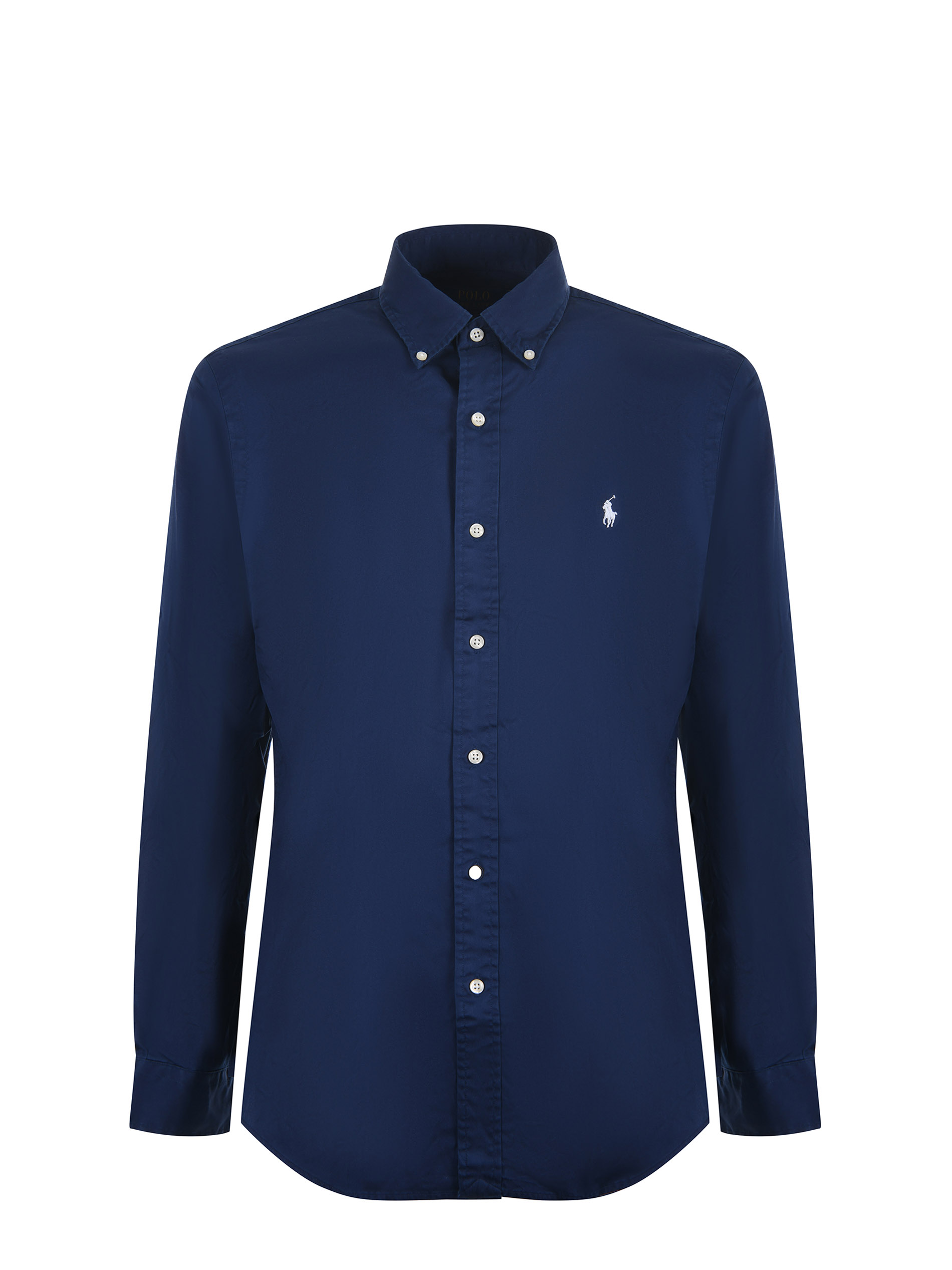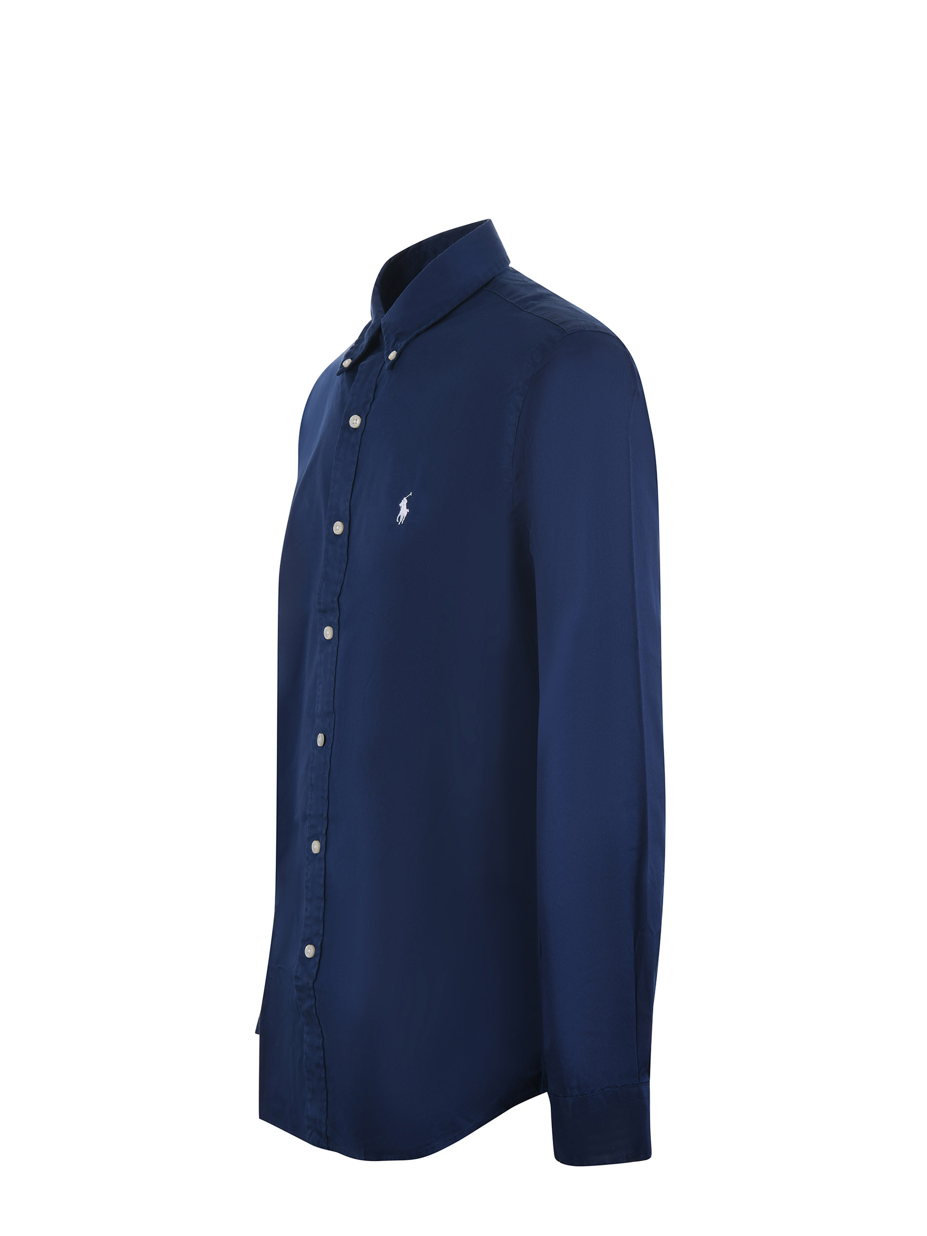 Camicia Polo Ralph Lauren in popeline di cotone Blu. Colletto button down. Manica lunga. Polsi con bottone. Chiusura con bottoni. Logo frontale bianco ricamato. Cannoncino sul retro. Custom fit.