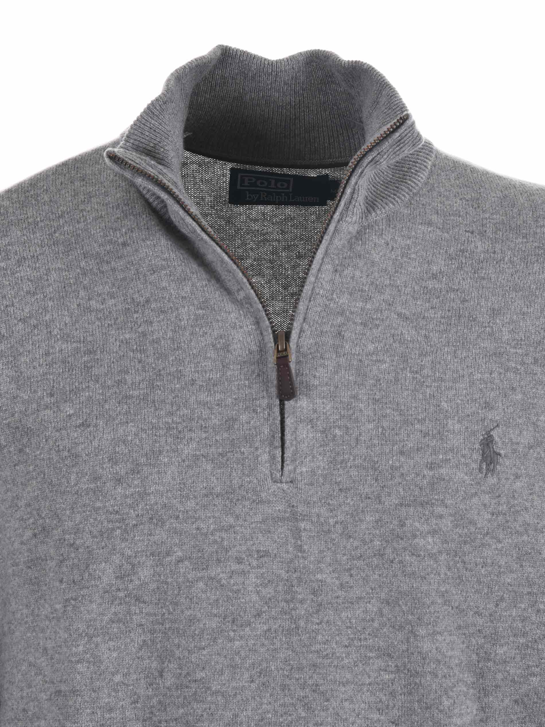 Maglia Polo Ralph Lauren in lana Grigio melange. Collo alto a coste con zip. Manica lunga. Polsi e fondo a coste. Logo frontale ricamato in tono.