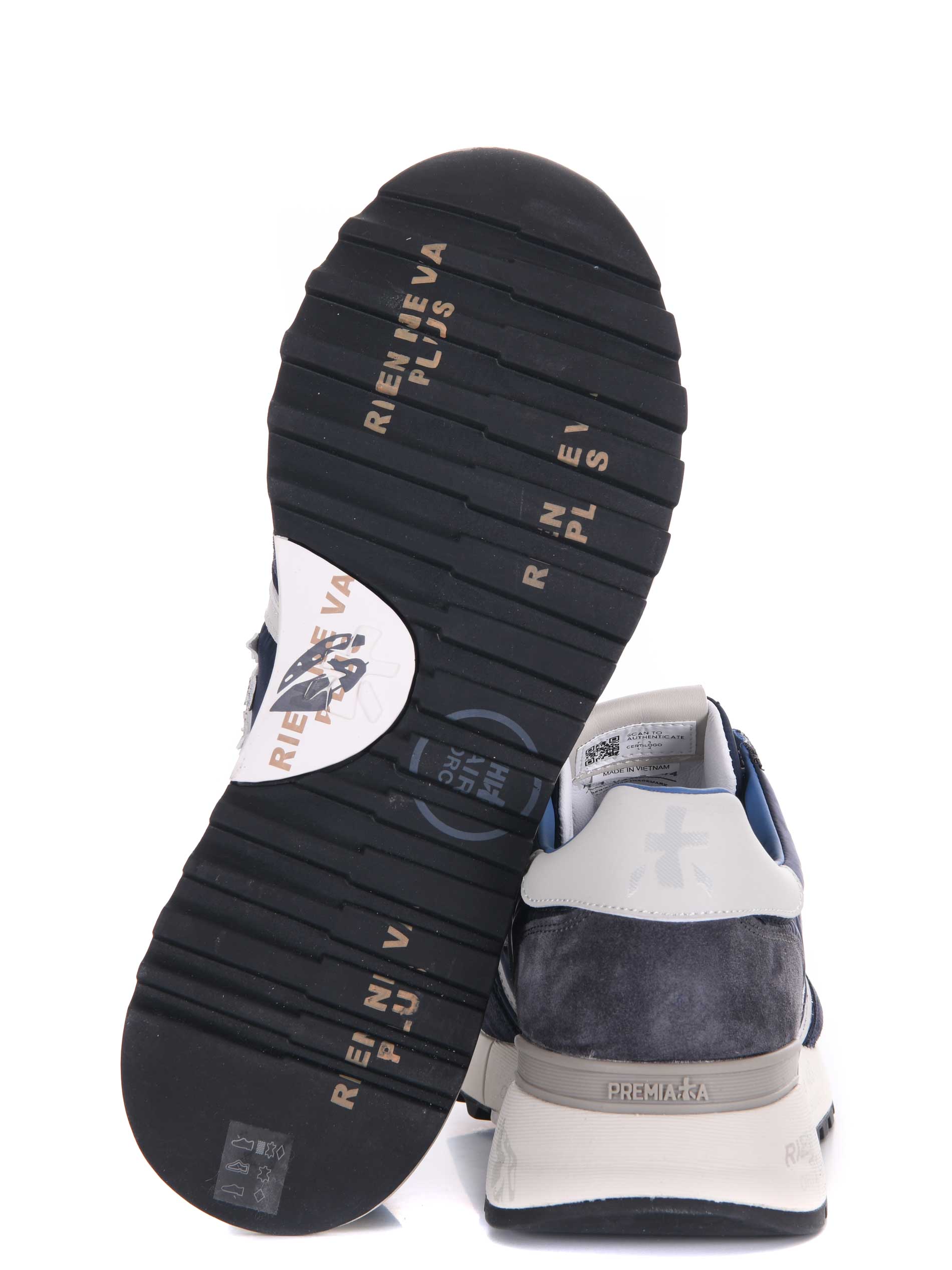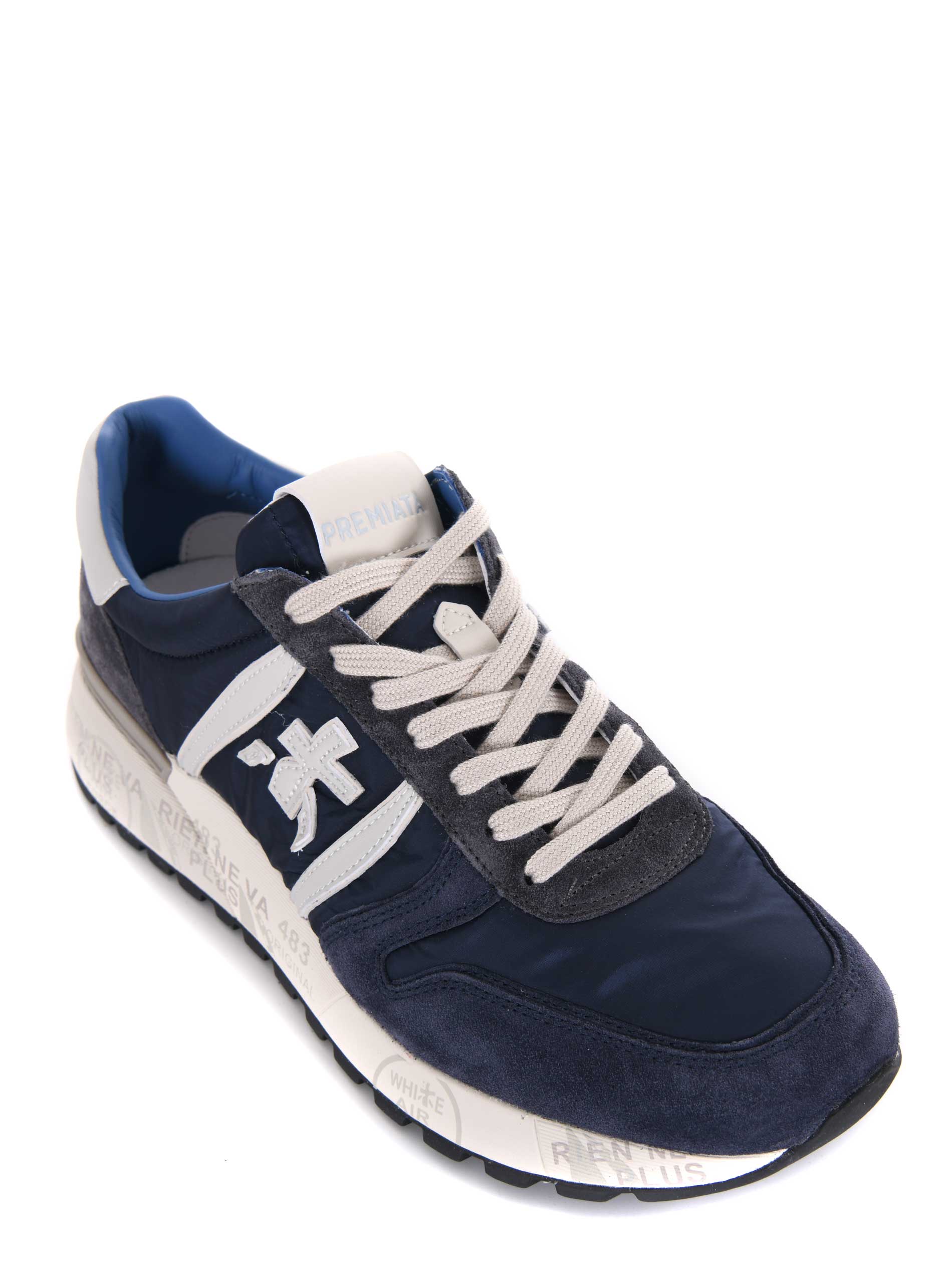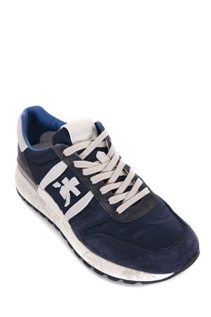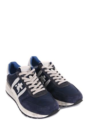 Sneakers Premiata in camoscio e nylon Blu. Inserti in pelle Avorio. Logo laterale in pelle effetto vintage dai bordi irregolari. Stringate. Patch logo sulla linguetta. Suola in gomma 40 mm stampata.