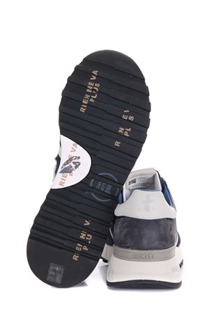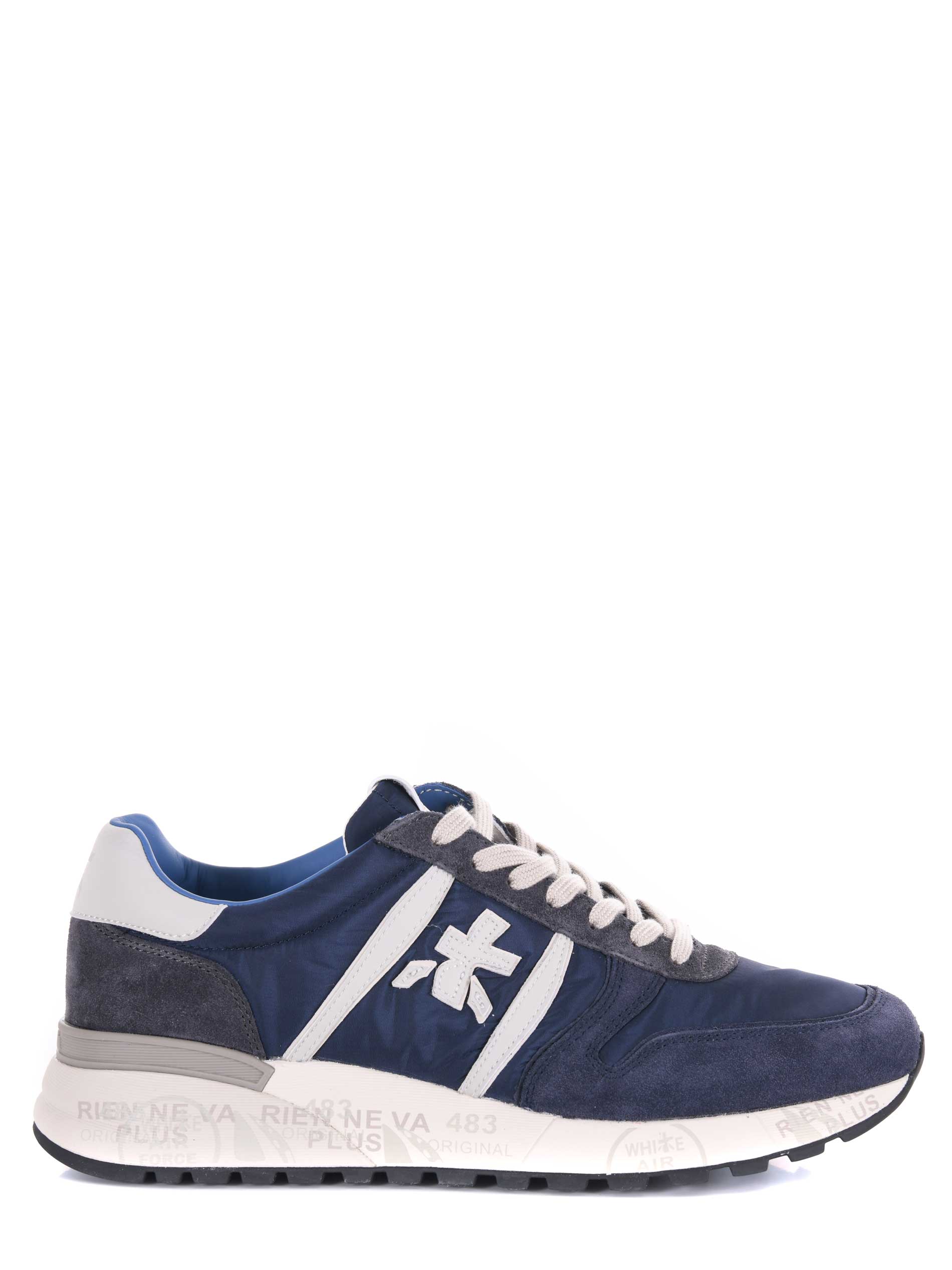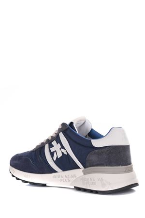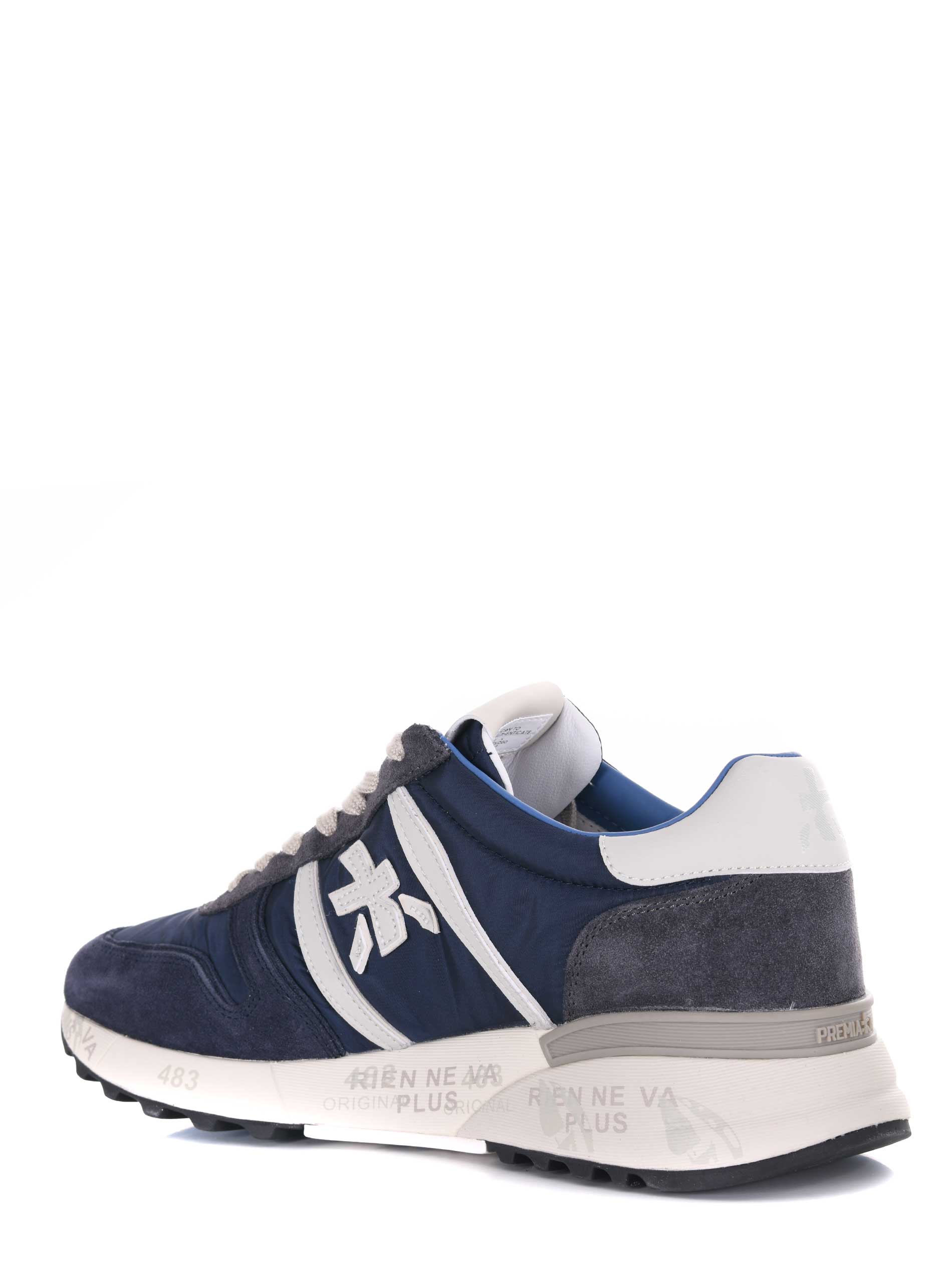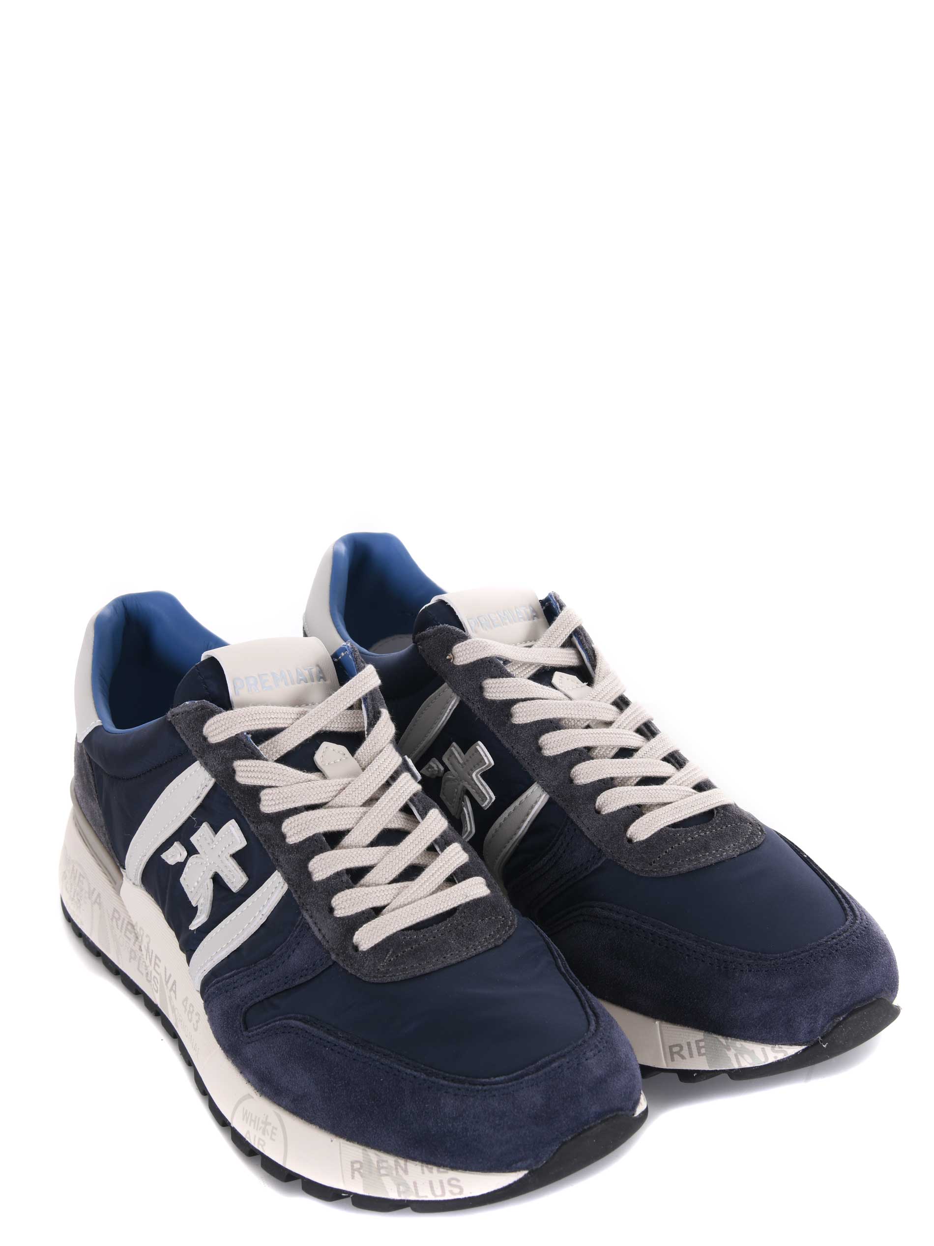 Sneakers Premiata in camoscio e nylon Blu. Inserti in pelle Avorio. Logo laterale in pelle effetto vintage dai bordi irregolari. Stringate. Patch logo sulla linguetta. Suola in gomma 40 mm stampata.