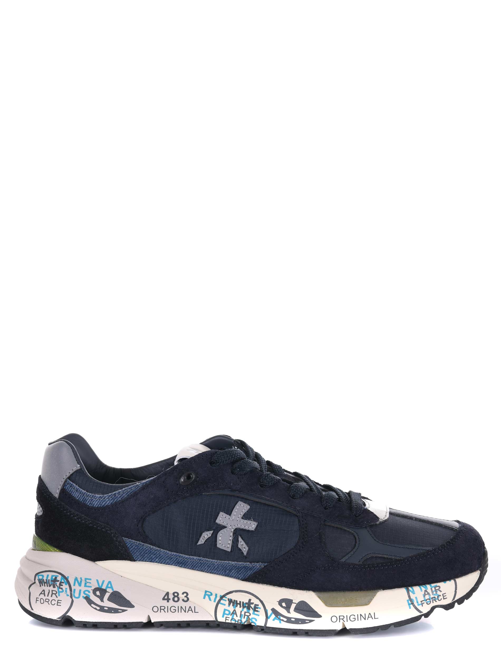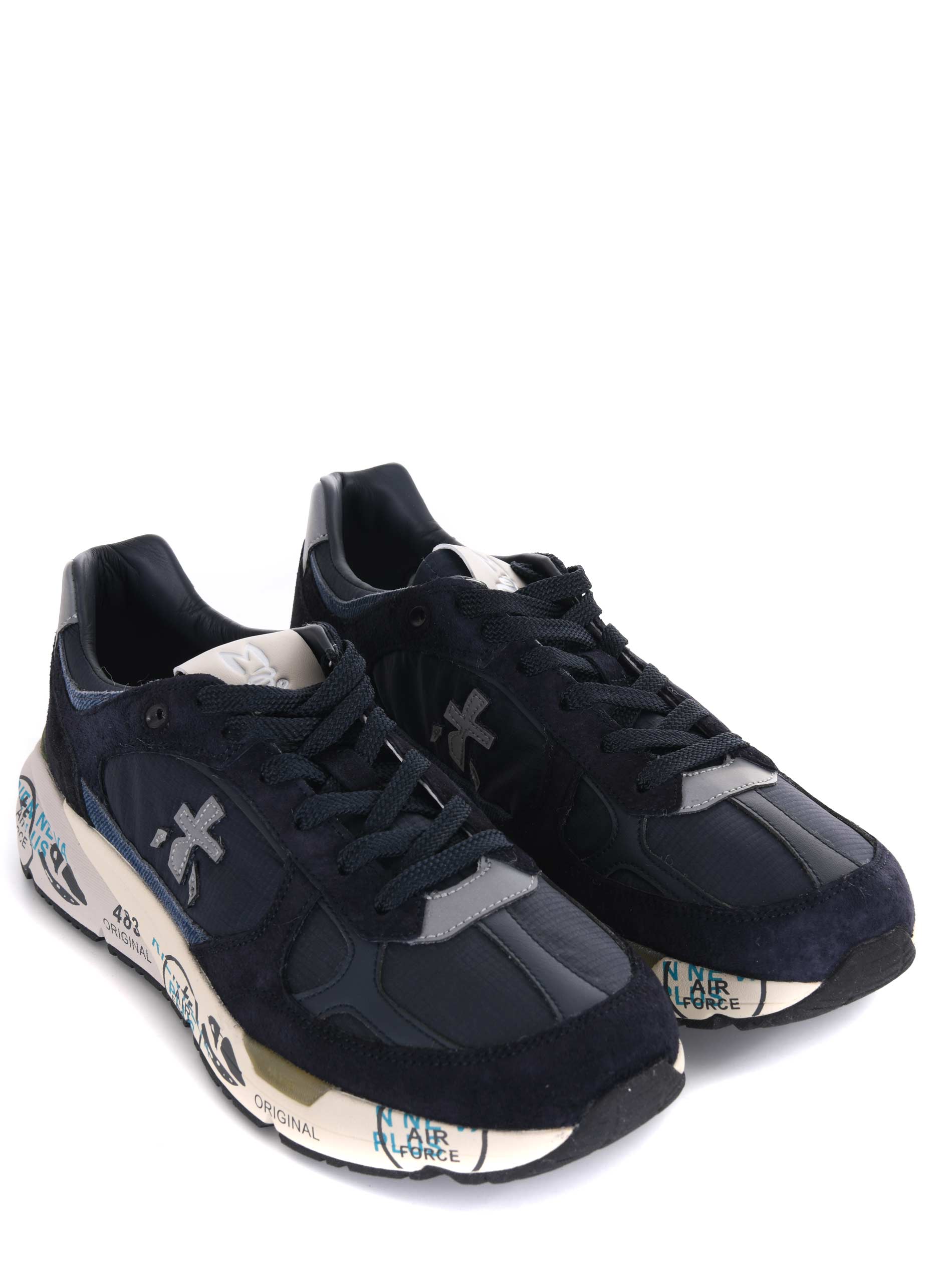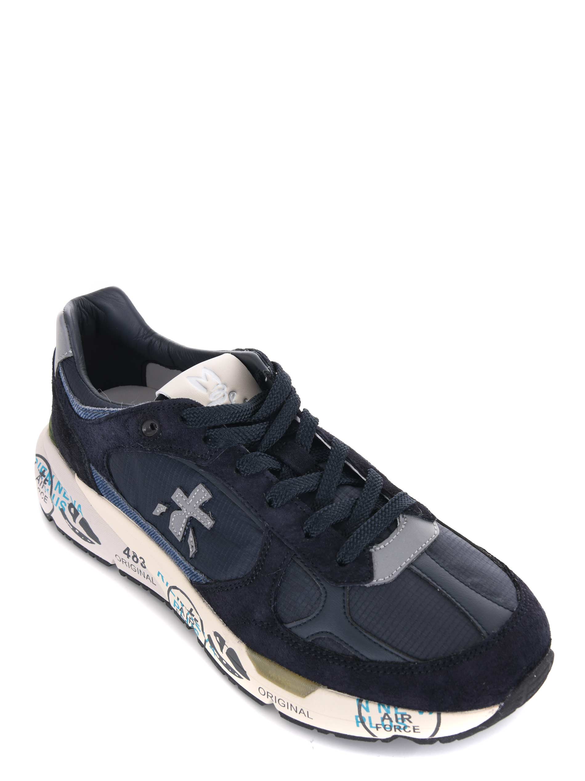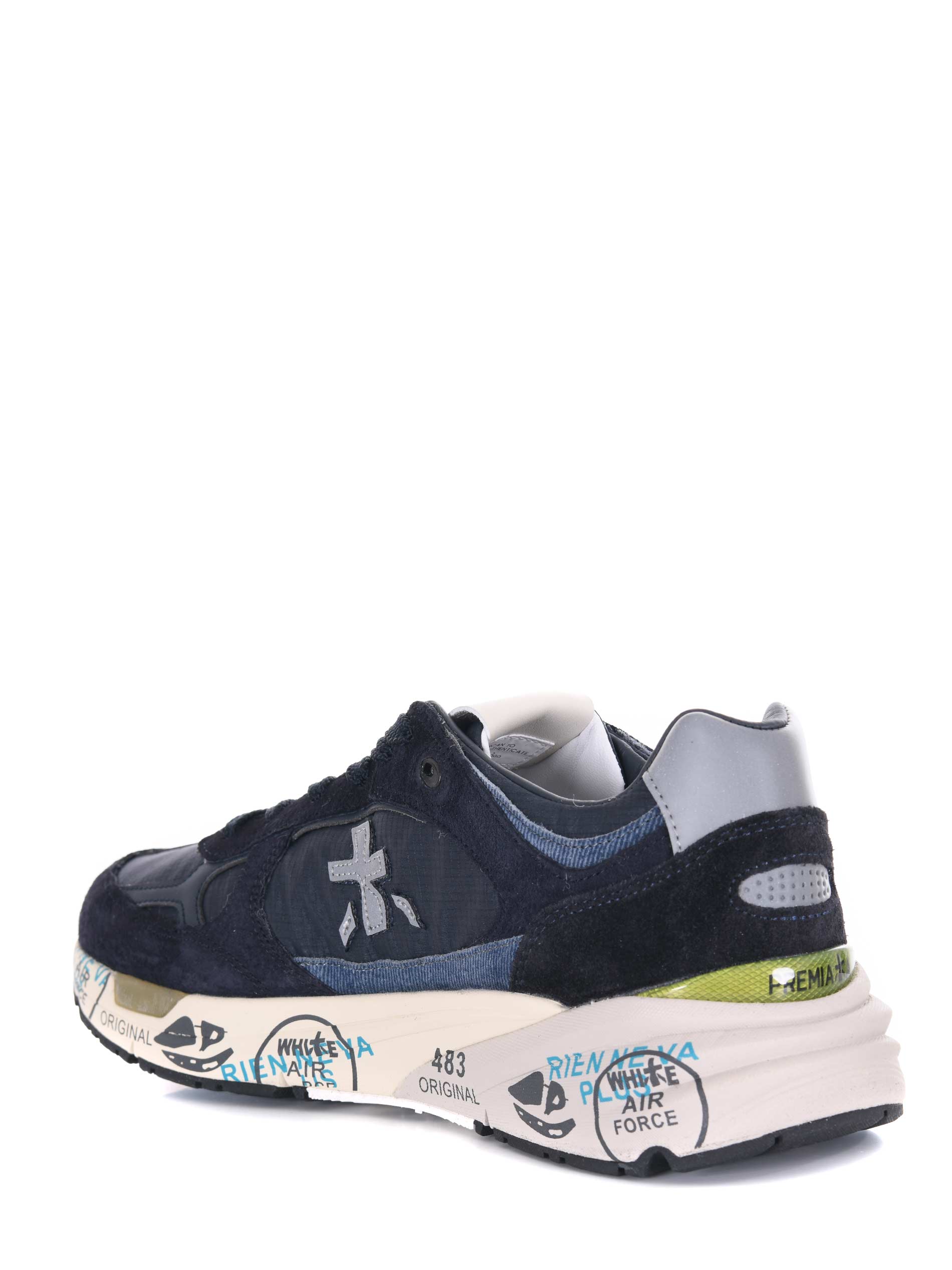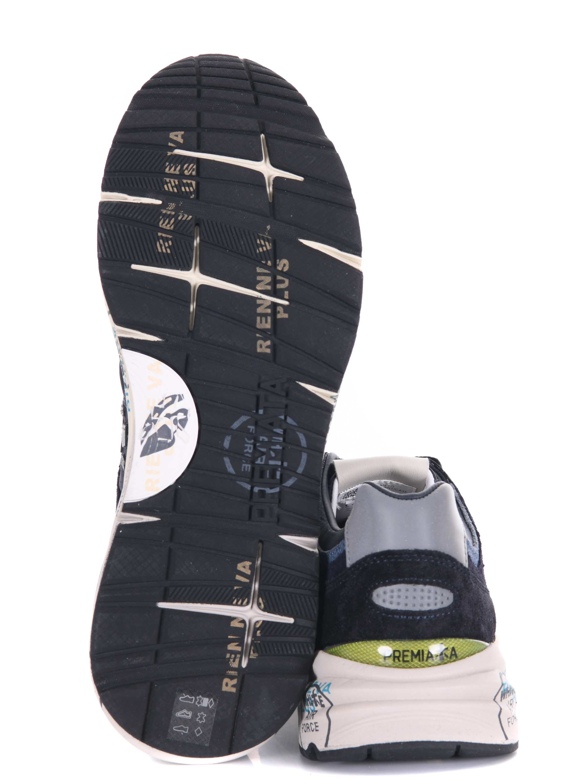 Sneakers Premiata in camoscio e nylon Blu scuro. Effetto used. Inserti a contrasto. Logo laterale catarifrangente. Stringate. Patch logo sulla linguetta. Suola in gomma 40 mm stampata bicolore.