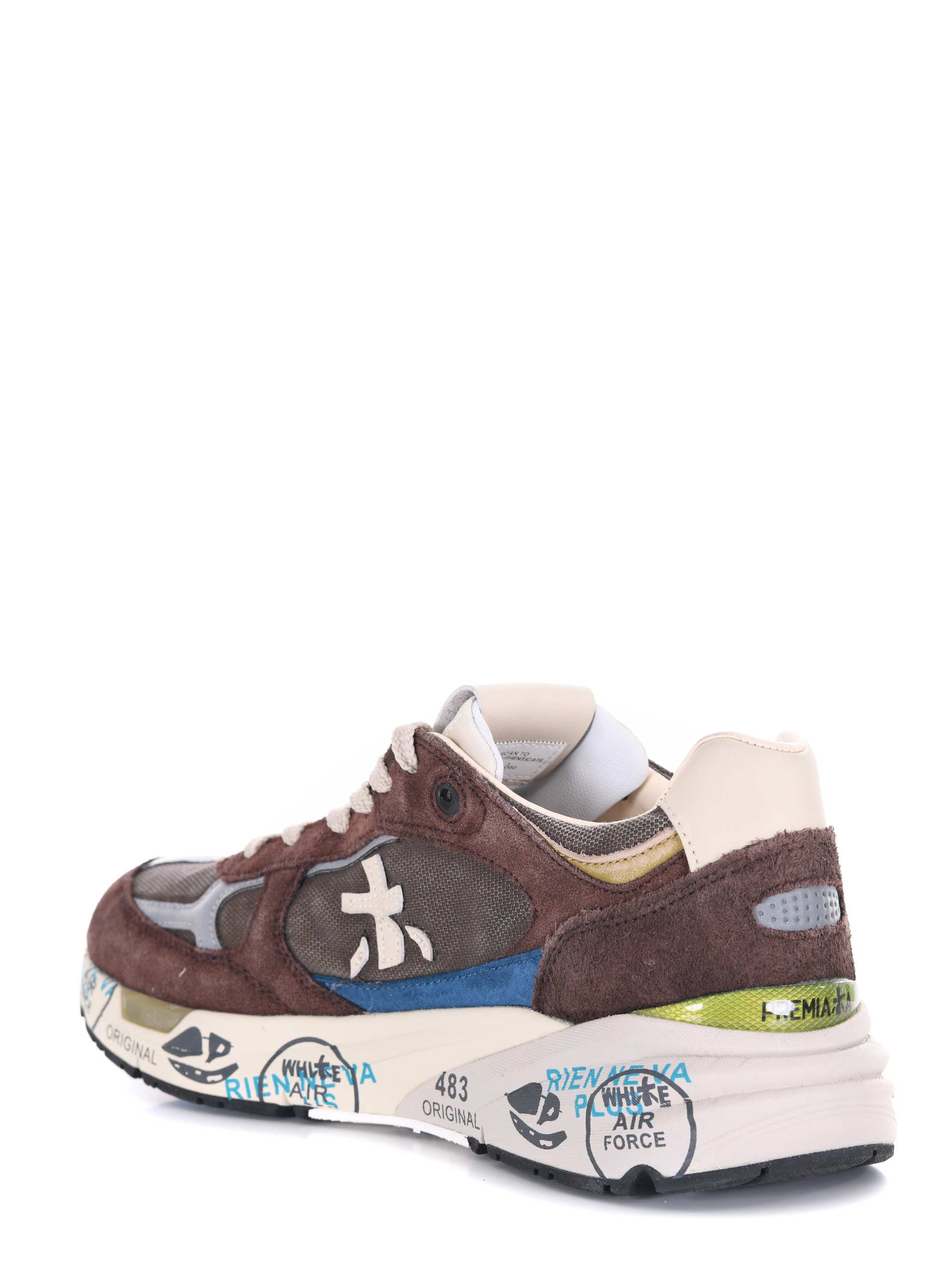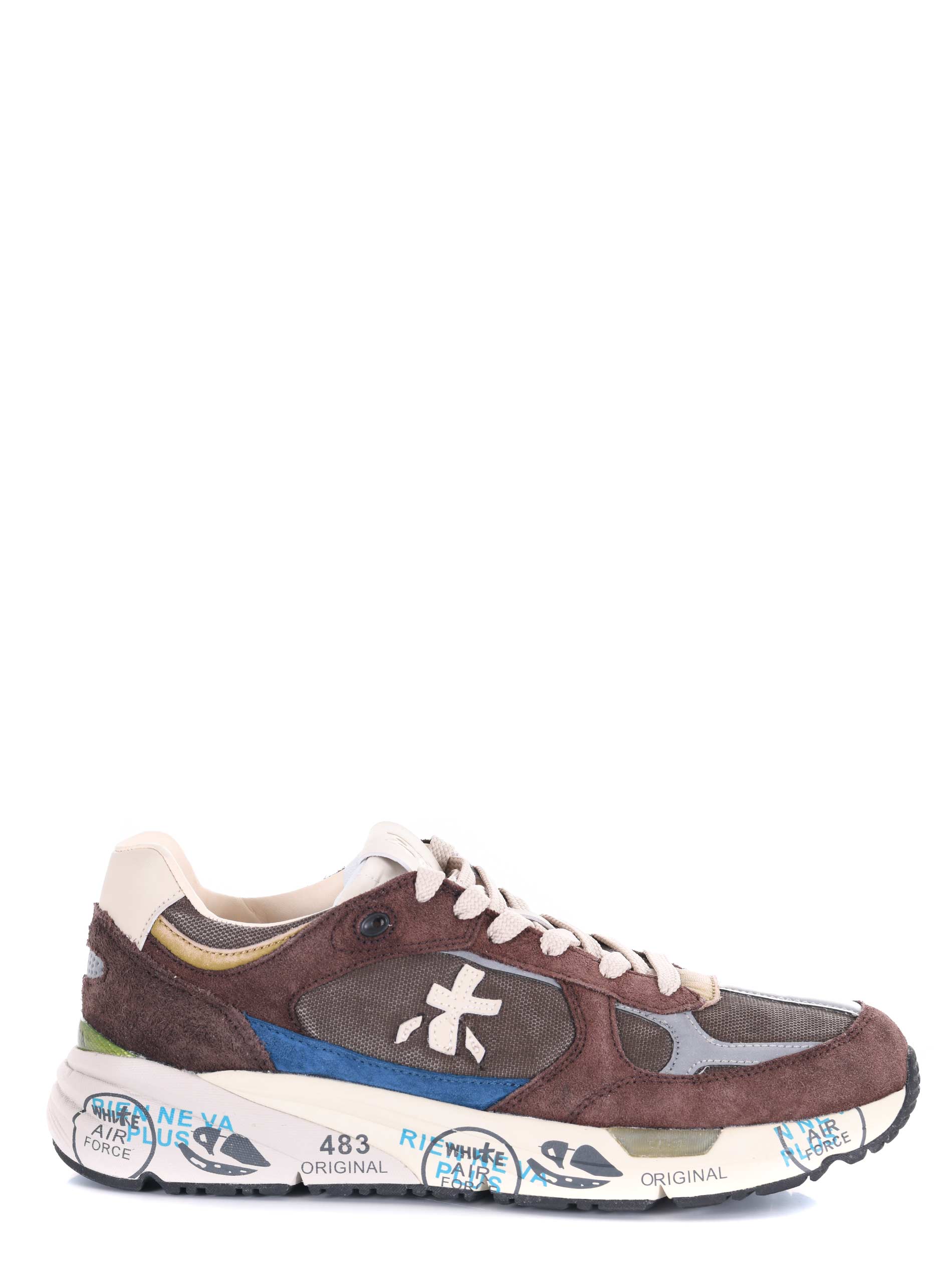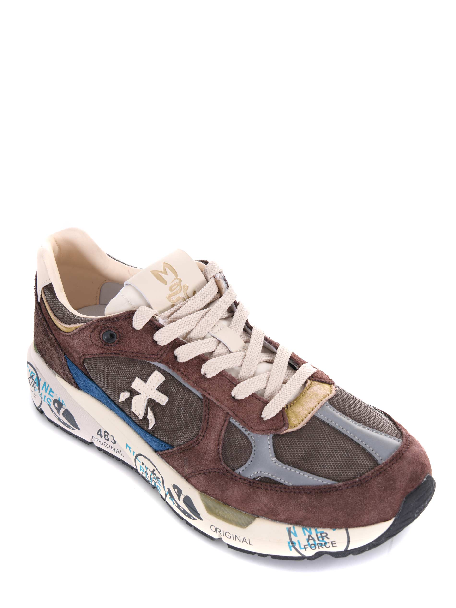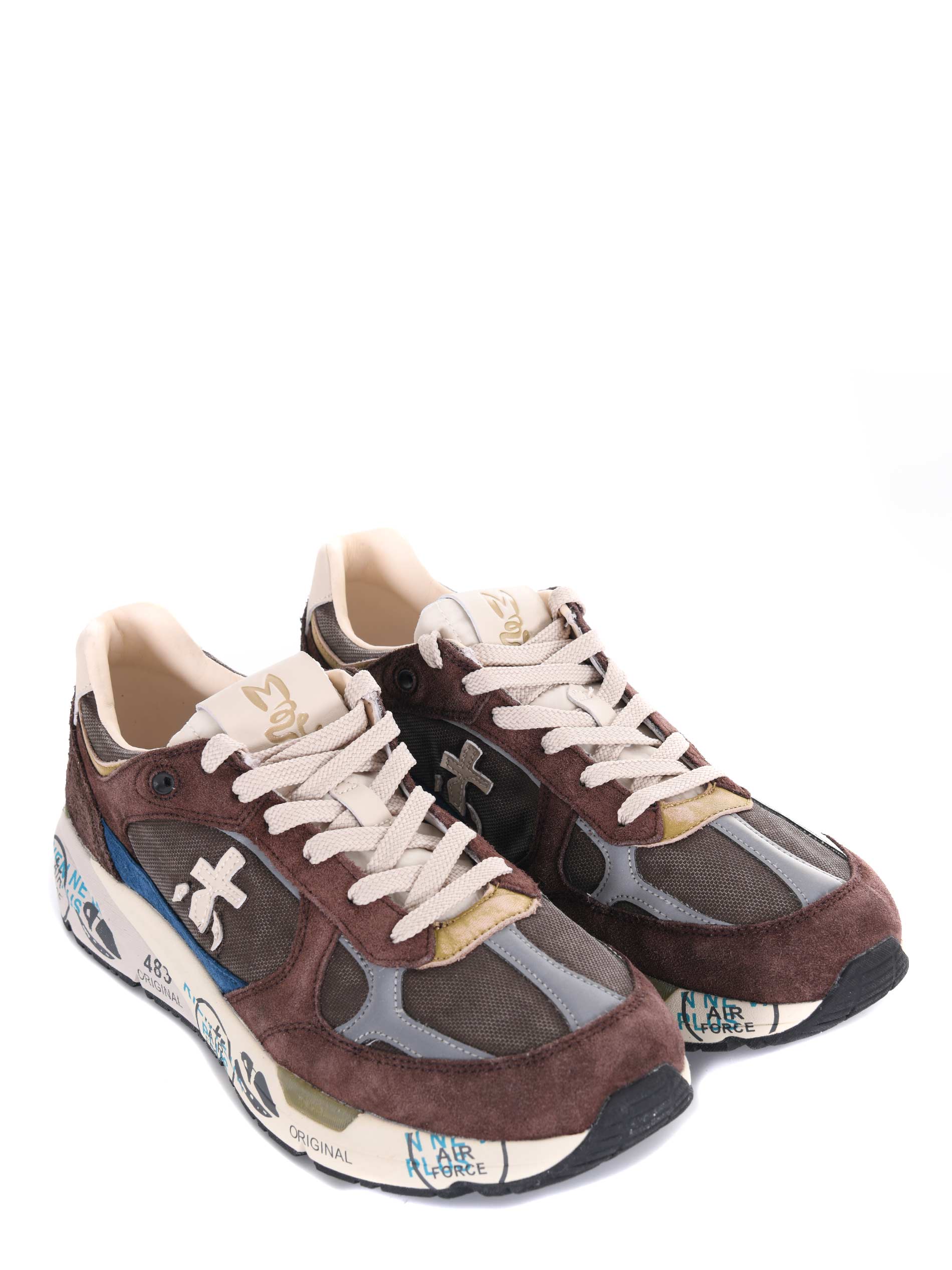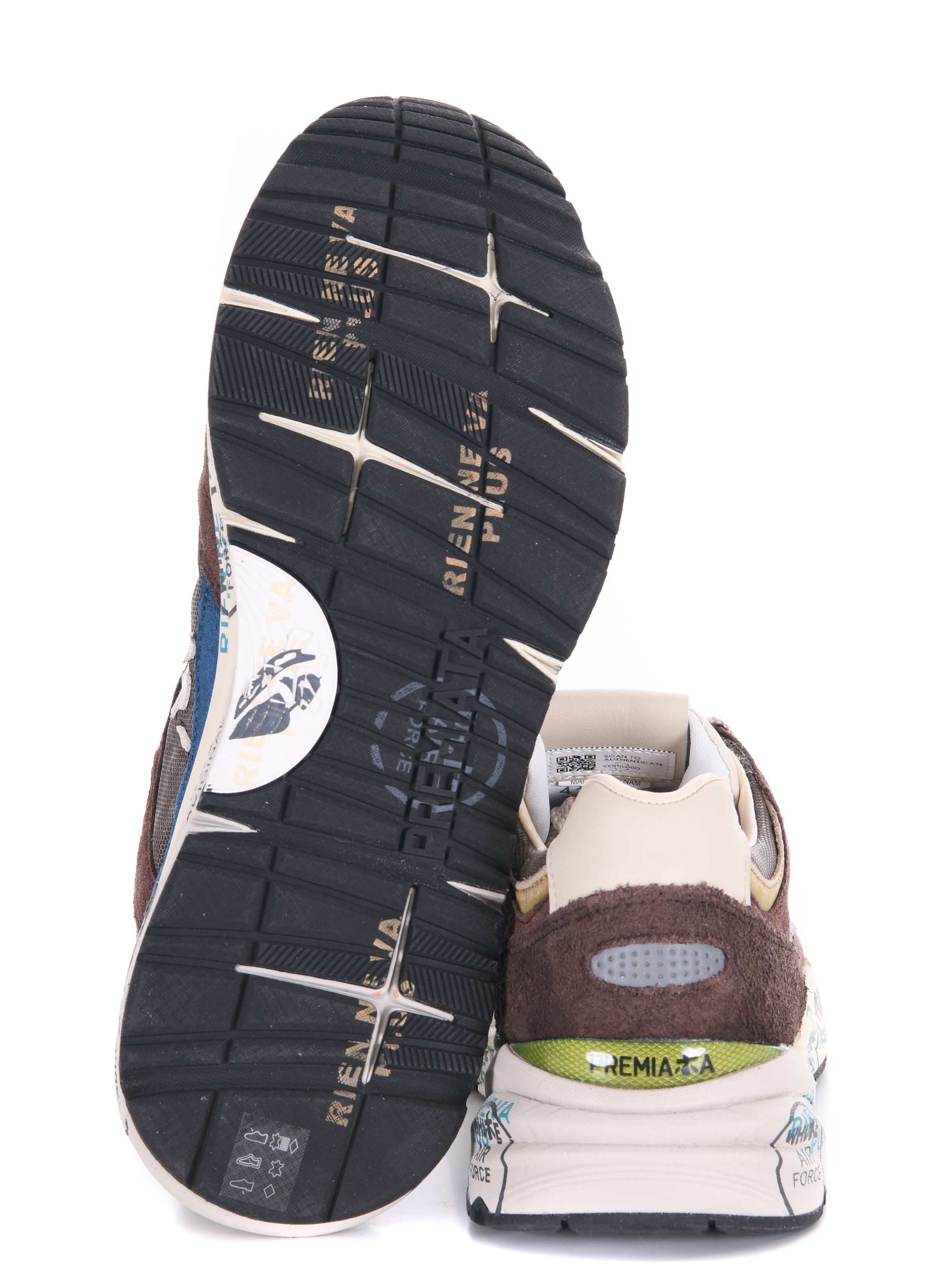 Sneakers Premiata in camoscio e nylon Marrone. Effetto used. Inserti a contrasto. Logo laterale catarifrangente. Stringate. Patch logo sulla linguetta. Suola in gomma 40 mm stampata bicolore.