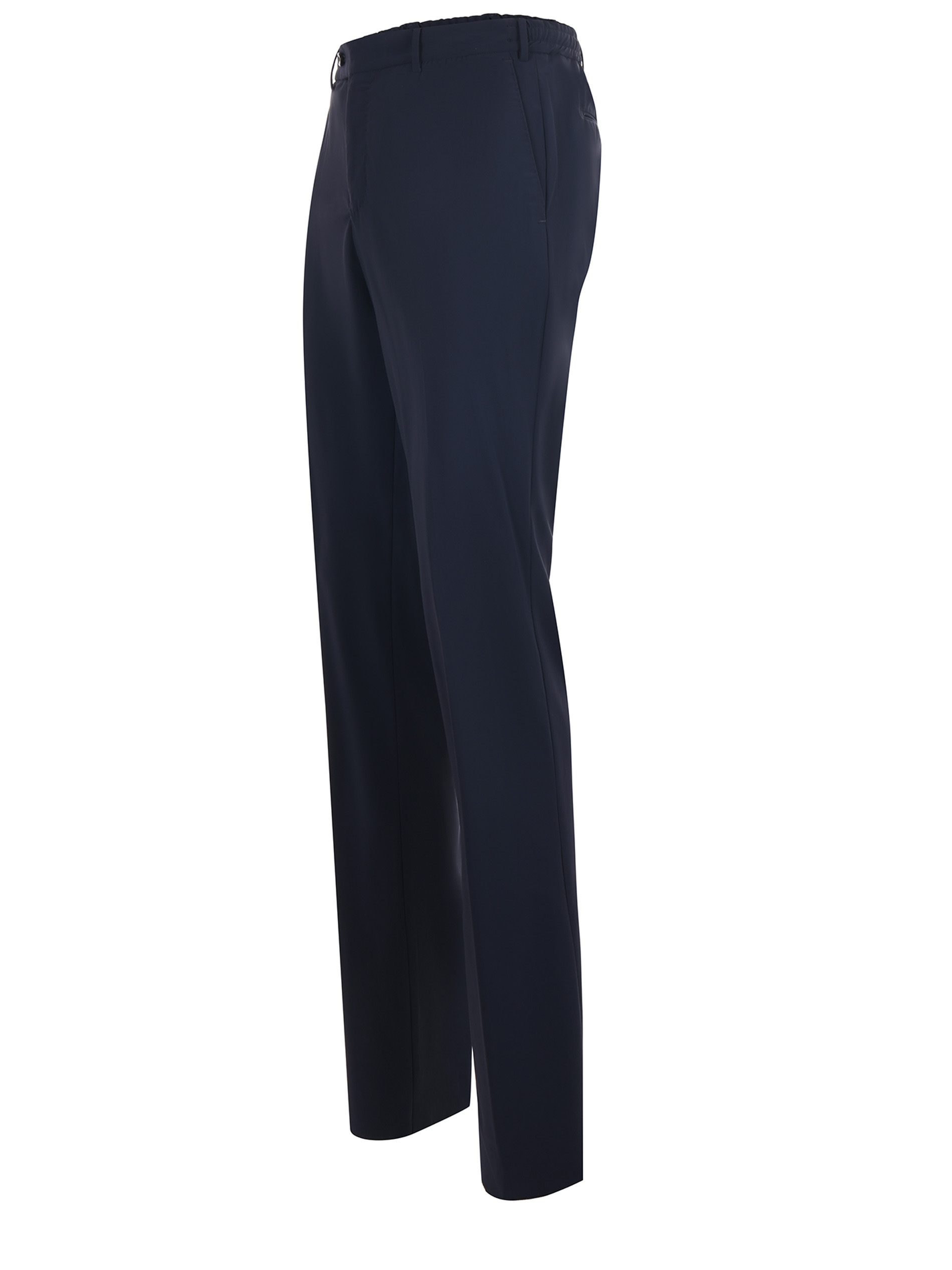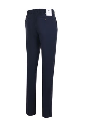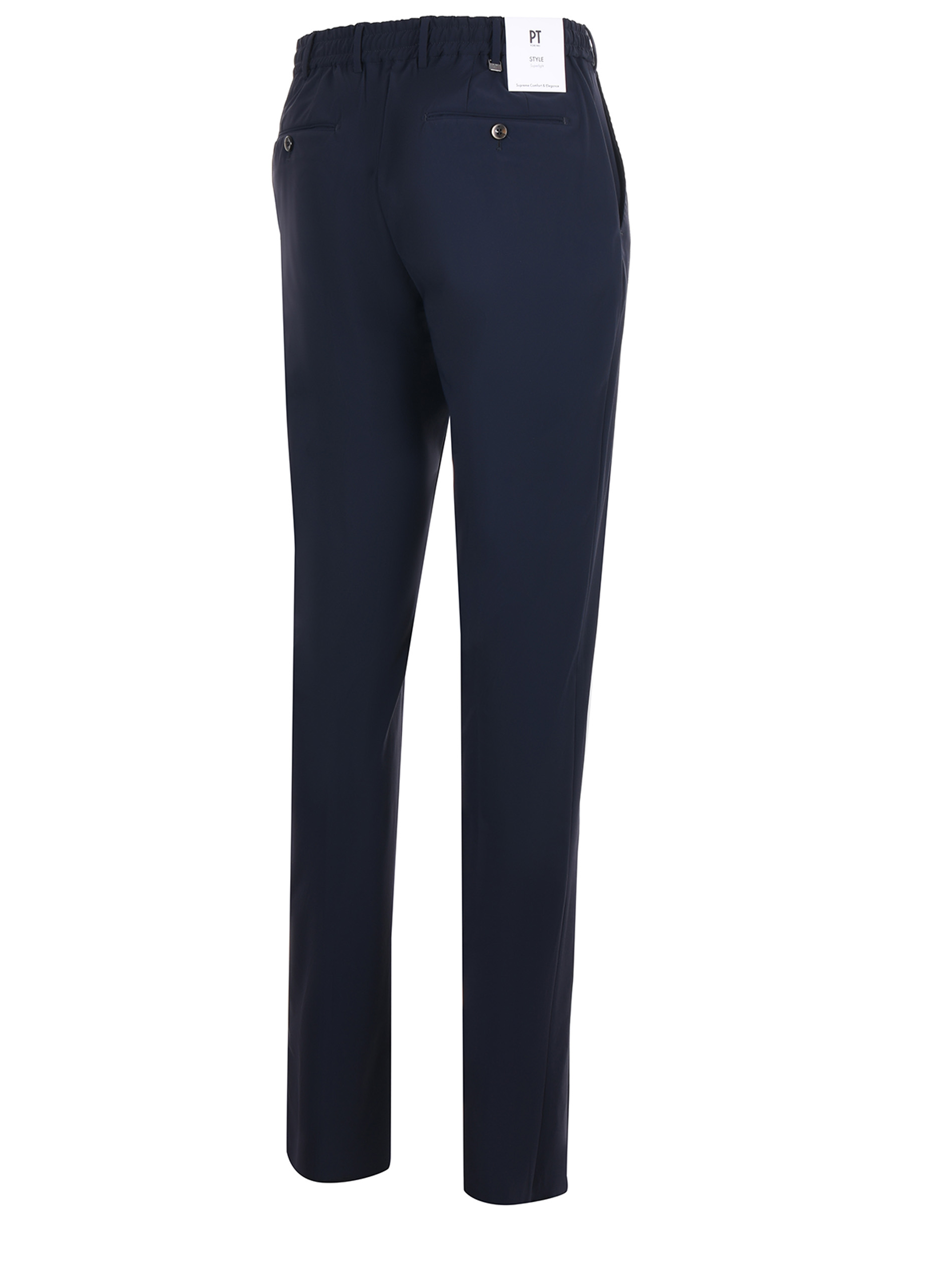 Pantaloni PT in tessuto tecnico stretch Blu scuro. Elastici in vita con coulisse. Passanti per cintura. Chiusura con bottone e zip. Tasche america. Tasche a filo posteriori. Fondo non rifinito.