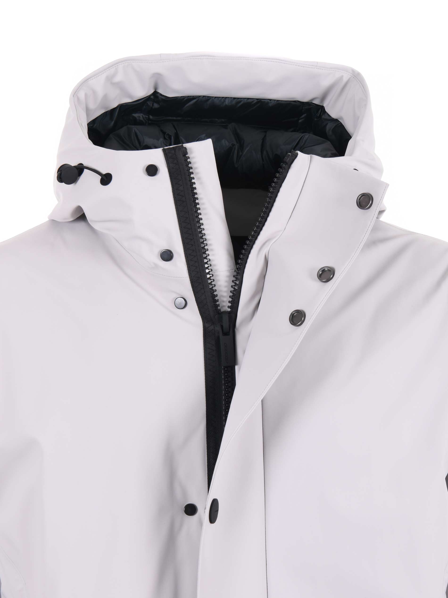 Parka RRD in nylon stretch color Ghiaccio. Foderato con trapunta imbottita in piume d'oca. Cappuccio con coulisse. Antigoccia, antivento. Tasche frontali con zip. Chiusura con zip e bottoni a pressione. Etichetta logo sulla manica. Fodera a contrasto.