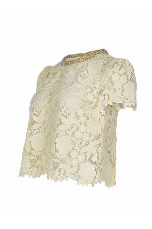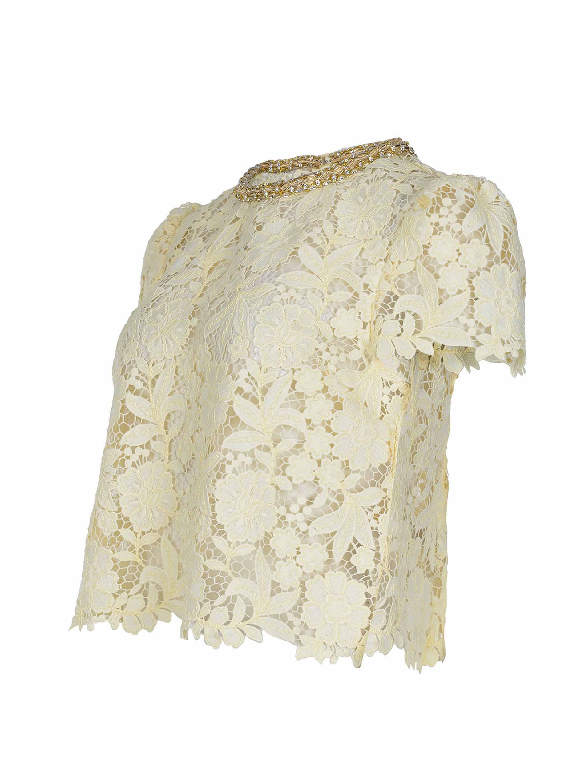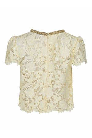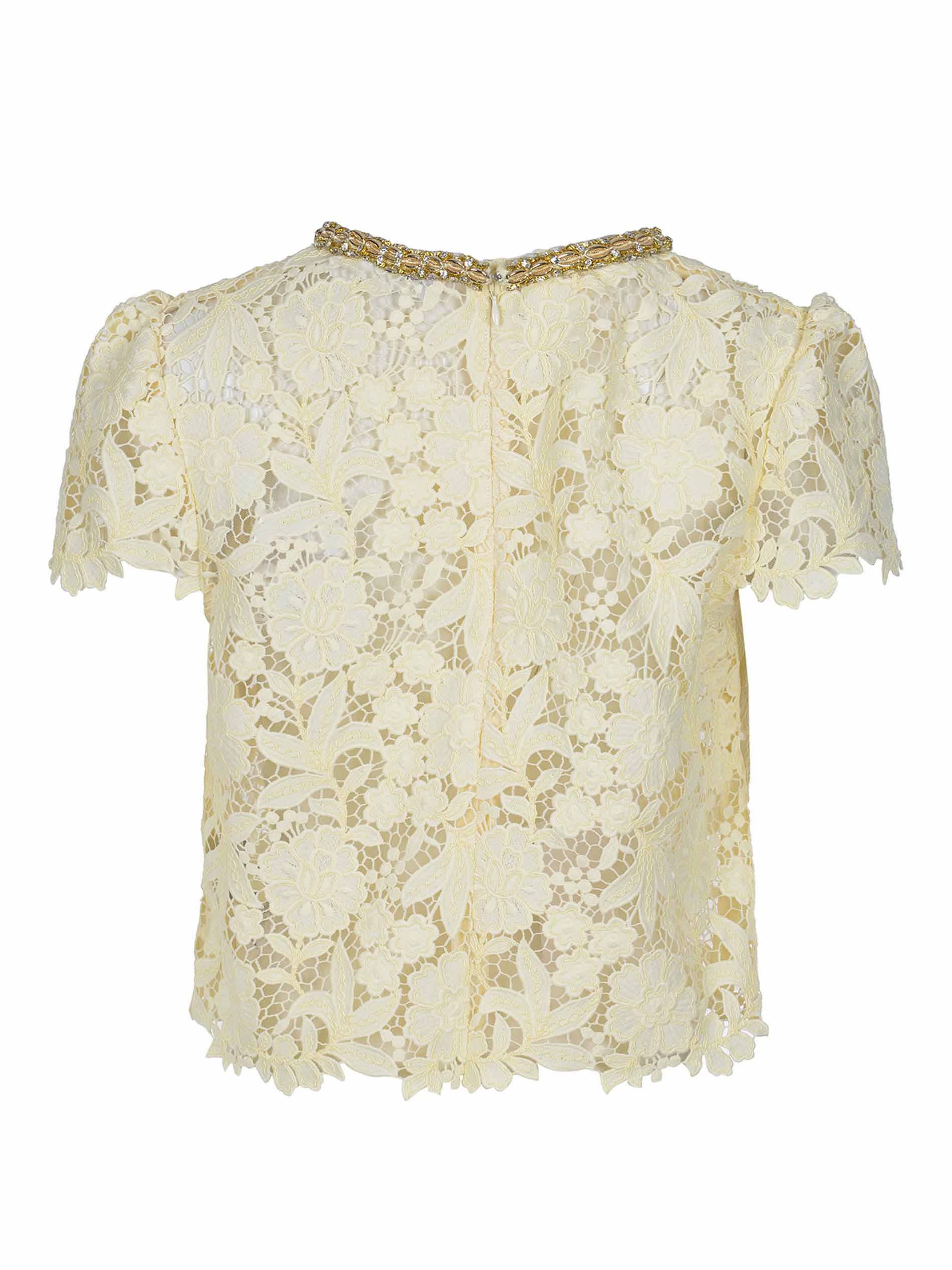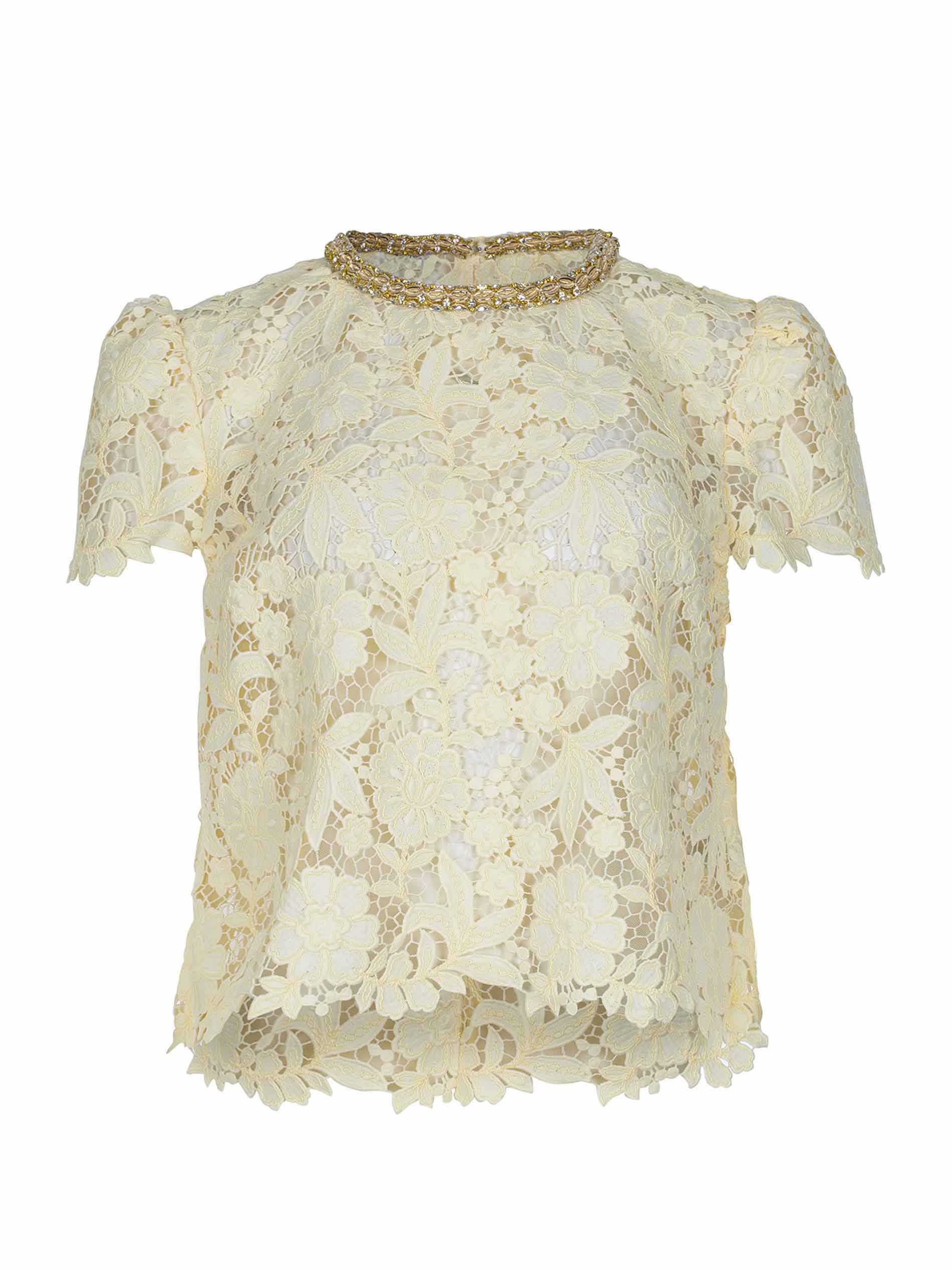 Blousa Self-Portrait realizzata in pizzo di colore Giallo. Girocollo con dettaglio di strass.