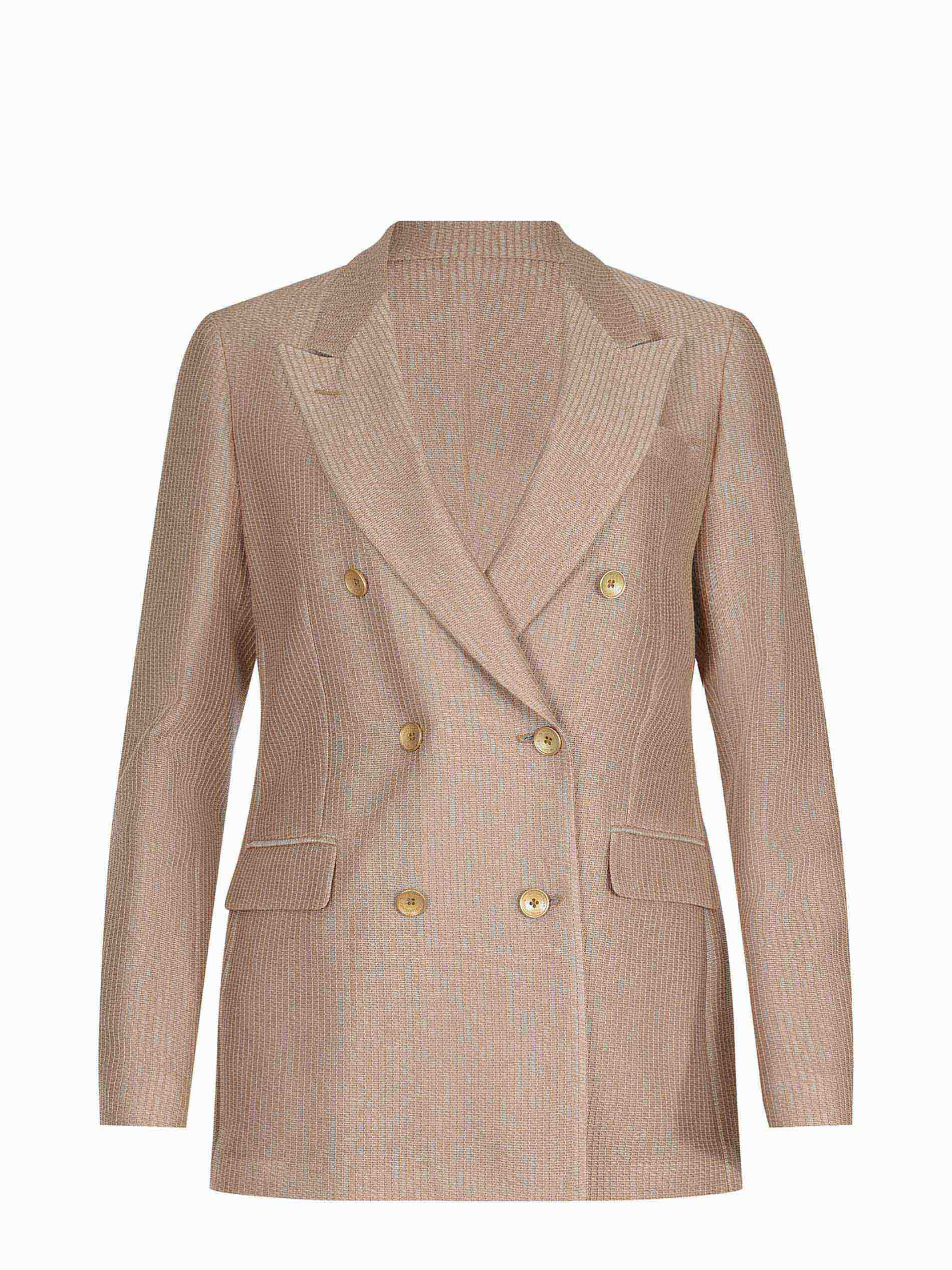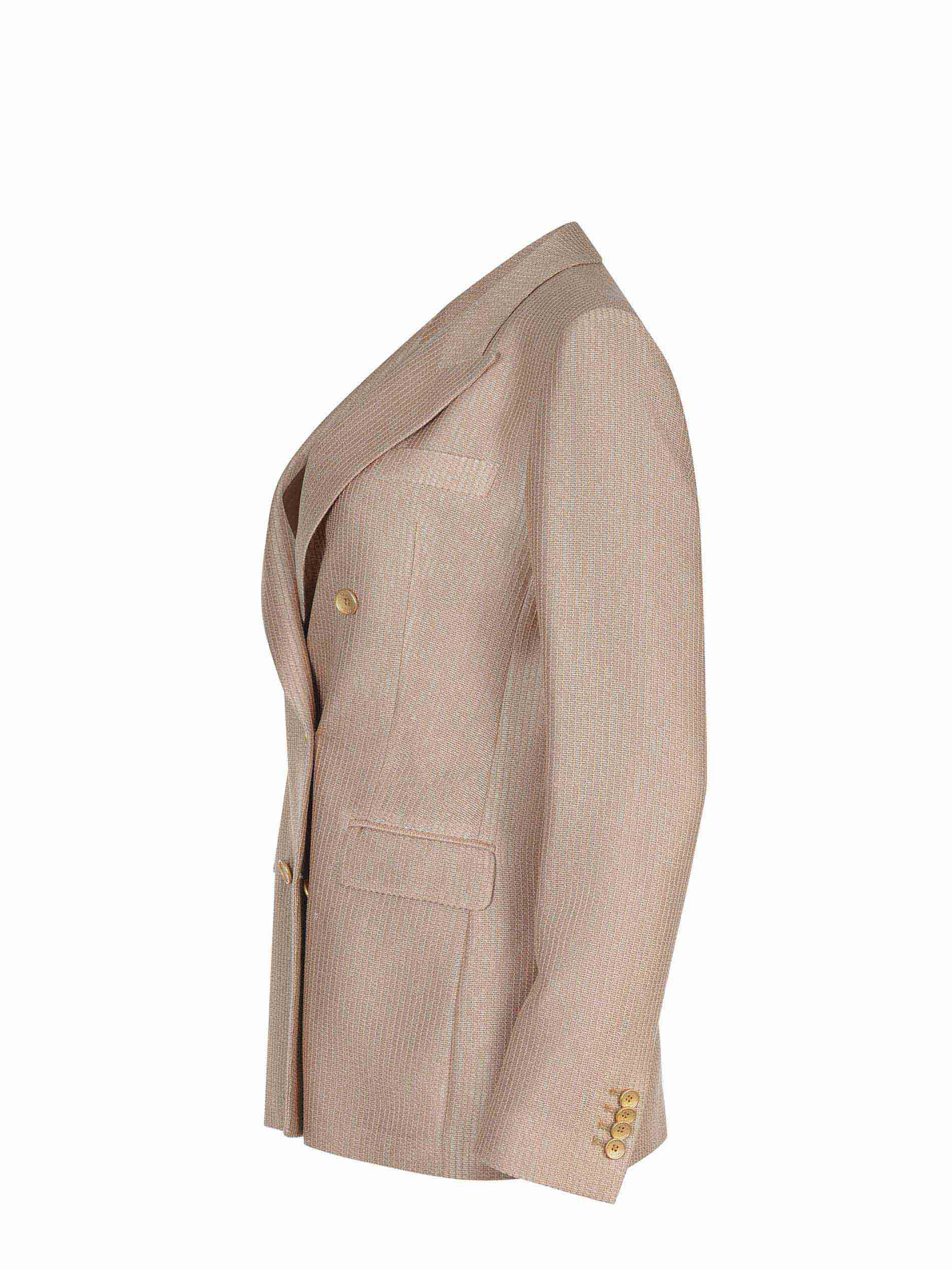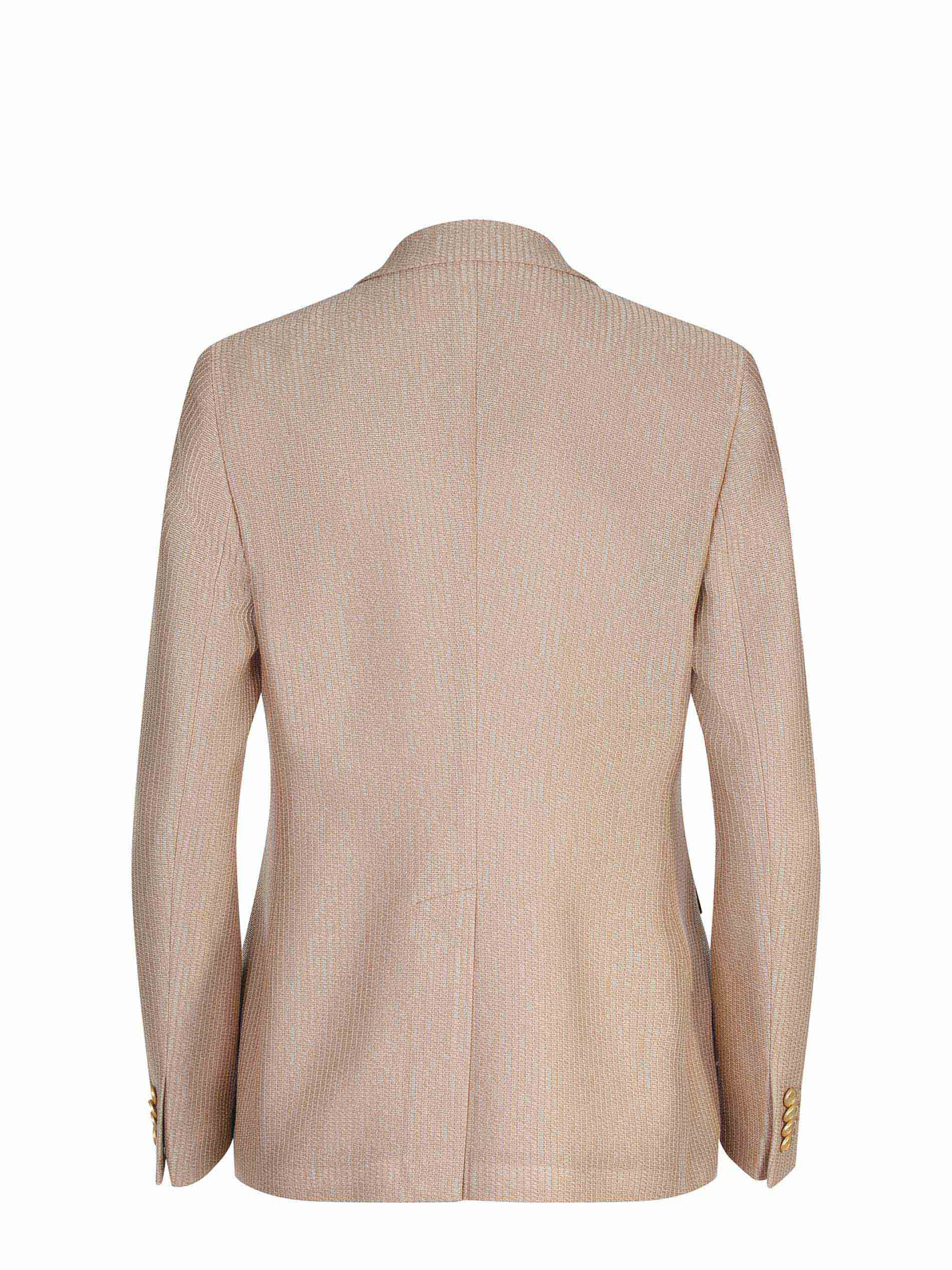Doppiopetto. Chiusura con due bottoni Dorati. Tasche con patta di lato. Spacco centrale, sul retro. Foderata.