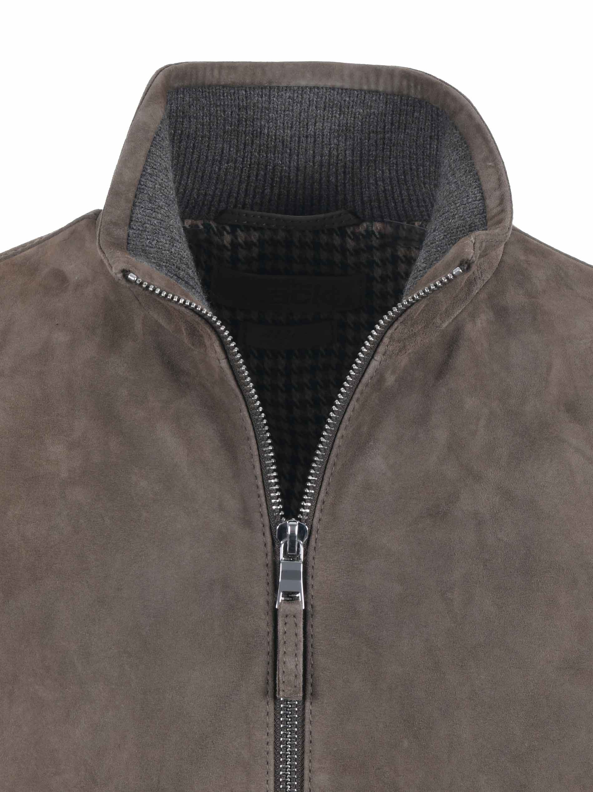 Giubbotto The Jack Leathers in pelle scamosciata color Fango. Imbottito. Colletto pistagna. Chiusura con zip doppio cursore. Tasche frontali. Polsi e fondo in maglia a costine. Foderato con maglia in lana.